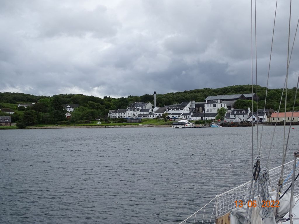 Après deux jours assez agités la météo se calme enfin et le 13 juin nous pouvons quitter Port Ellen. Nous nous rendons à l’île voisine : Jura. Son nom n’a rien avoir avec notre montagne préférée, il viendrait d’un dialecte norois et signifierait l’île des cerfs « Deer Isle » (la prononciation n’est pas éloignée de Jura). En effet cette île sauvage et montagneuse compte 600 habitants pour 6000 cerfs. Après une belle navigation au portant où il ne manquait que le soleil, nous nous amarrons à un mouillage visiteur de la large baie de Craighouse au pied de la distillerie « Jura », principal employeur de l’île.