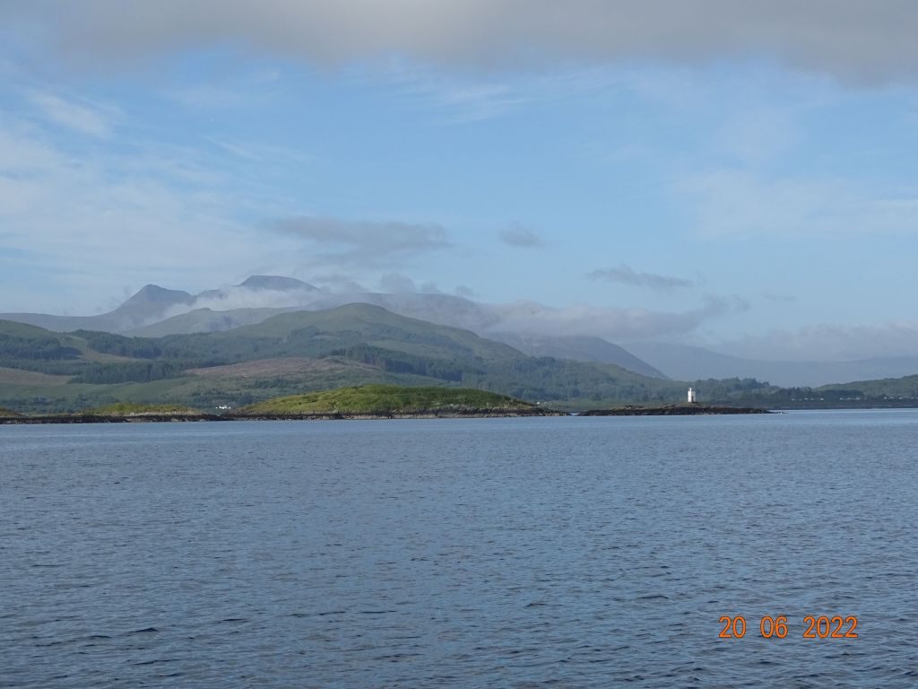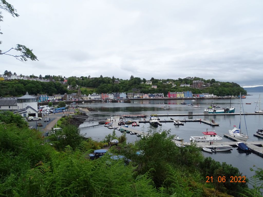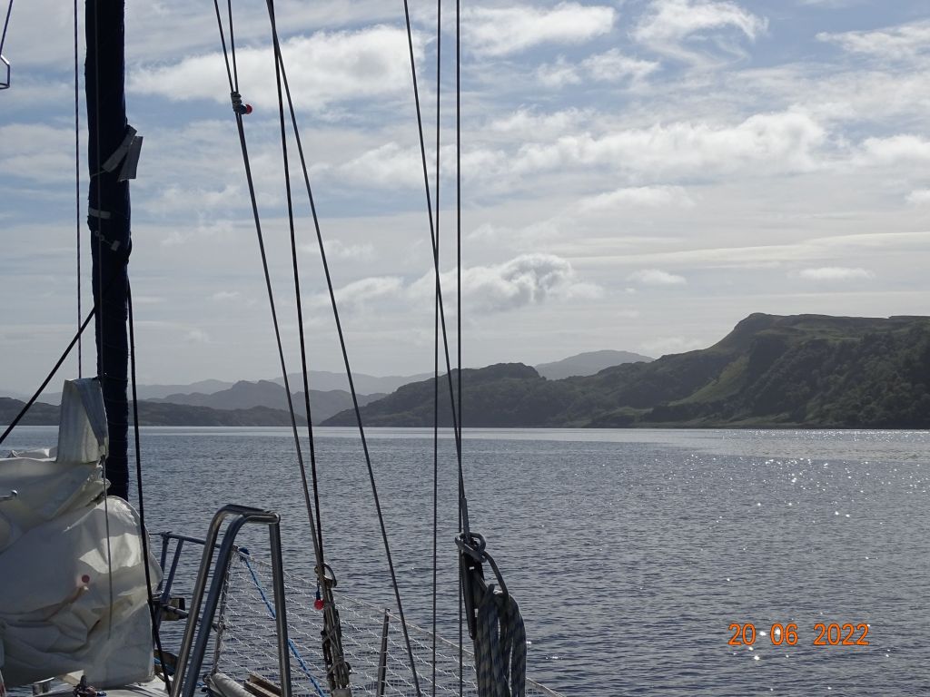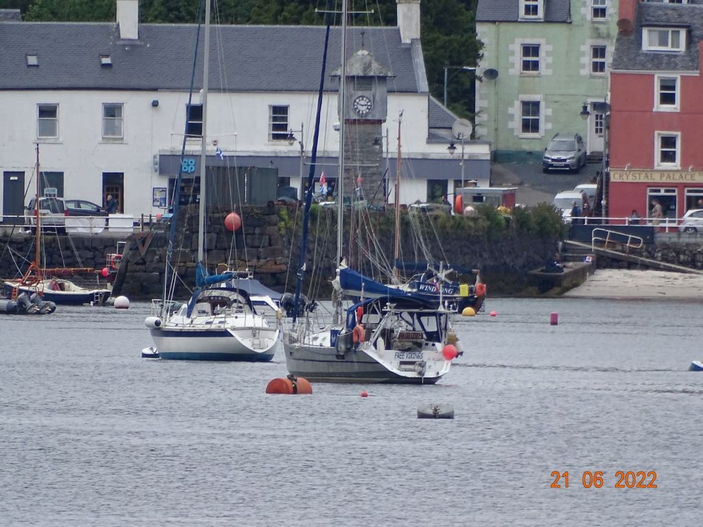 Le 20 juin nous quittons enfin le Loch Aline par une belle matinée ensoleillée, sans vent, et c’est quasiment complètement au moteur que nous rejoignons le Loch Drumbuie sous la péninsule d’Ardnamurchan. Un loch complètement fermé au pied des montagnes du même nom. Nous nous chauffons au soleil et déjeunons dehors, quel bonheur ! Mais cela ne dure pas ! En début d’après-midi un petit vent frais se lève et les nuages arrivent. Nous levons l’ancre et arrivons vers 15 heures dans la baie Tobermory au Nord de l’île de Mull où il ne tarde pas à se mettre à crachiner à la mode bretonne. L’île de Mull, qui a la réputation d’être particulièrement pluvieuse, ne faillit pas à sa réputation !