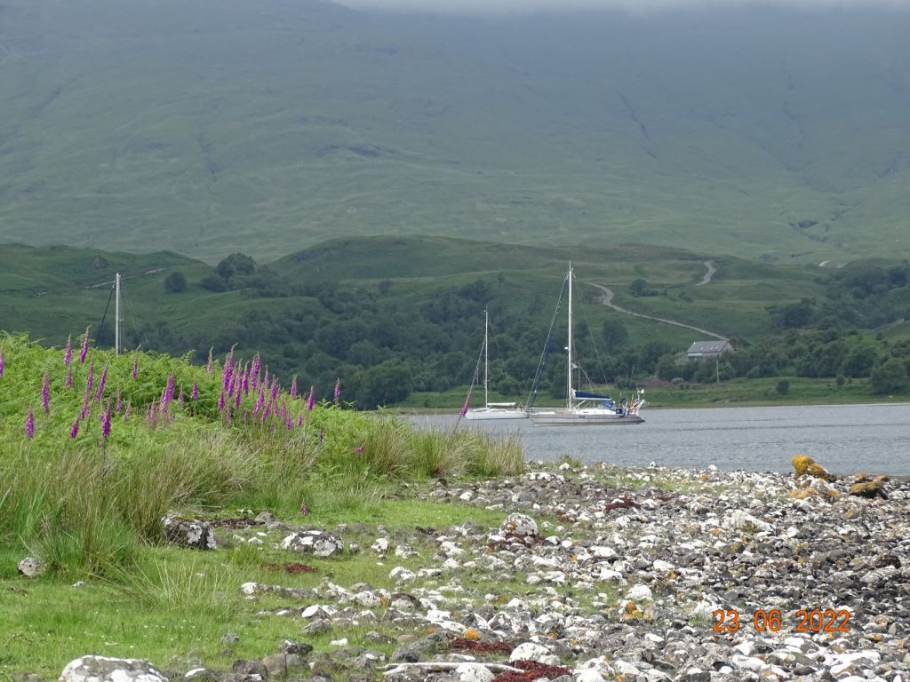 Après une nuit bien pluvieuse le ciel bleu apparaît enfin dans la matinée, et mieux, il se met à chauffer et nous pouvons profiter d’une bonne douceur dans le cockpit, quel bonheur ! Nous décidons de profiter de ce beau mouillage et passons une journée dehors au soleil. Nous tentons une promenade à pied mais il n’y a pas d’endroit où rejoindre un chemin quelconque. On débarque sur des plages caillouteuses entourées d’herbe spongieuse remplie de déjections indéterminées (les oies ?), et ceintes de bruyères infranchissables. Il y a bien un ponton mais il est privé, réservé à l’entreprise mytilicole. En effet les deux branches du Loch Spelve sont occupées par de nombreux champs d’élevage de moules. Nous renonçons donc à débarquer et nous occupons à divers bricolages et à profiter du soleil. J’aurais bien tenté une baignade mais les nombreuses méduses m’en dissuadent.