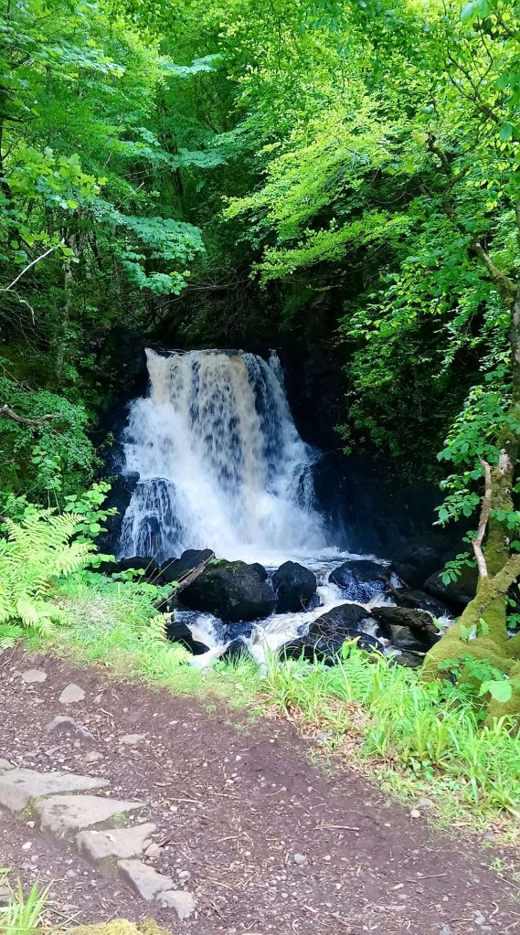Nous passons une journée à Tobermory. Cette petite ville typique, aussi colorée que son ciel est gris, est très touristique et une sympathique animation règne sur le quai et dans les pubs. De nombreuses boutiques de souvenirs et d‘artisanat local sont installées sur les quais. Nous poussons un peu sur les hauteurs jusqu’à la boutique de poisson où nous achetons du saumon fumé local. Etrangement il n’est pas si facile que cela de trouver du poisson en dehors des classiques filets de saumon du supermarché. Le fond de la baie abrite le Parc Aros où nous découvrons multiples chutes d’eau, ruisseaux… L’eau de manque pas sur Mull, elle source de partout, le long de la côte coulent de nombreuses cascades.