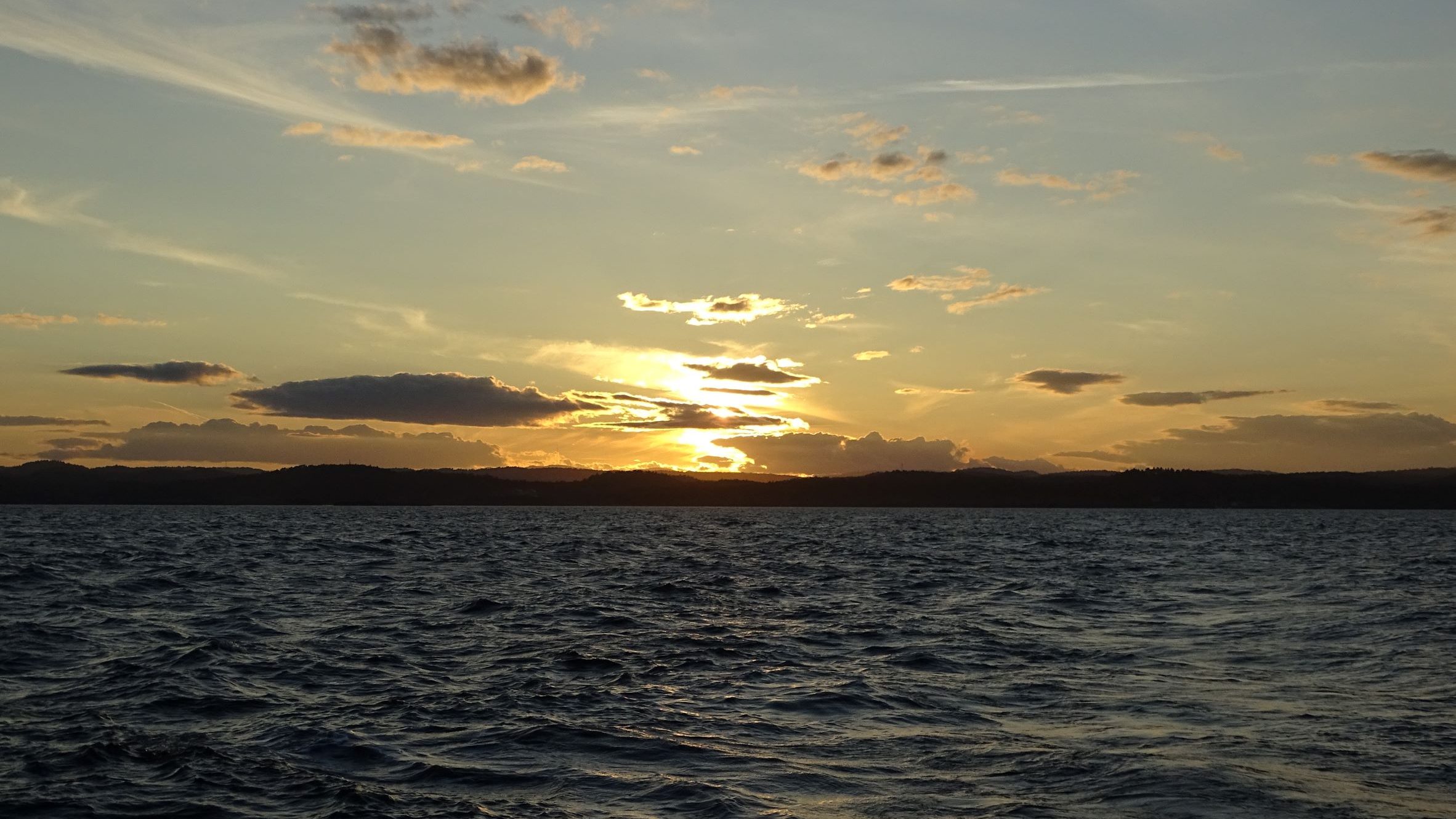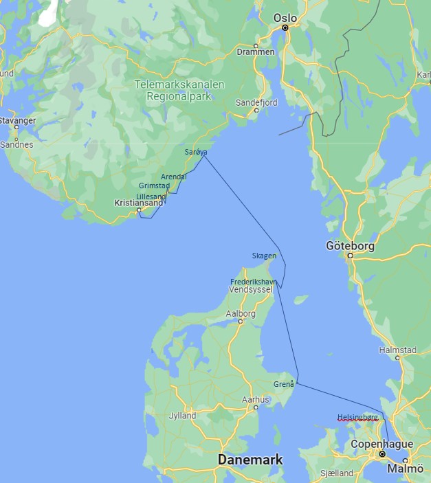 A 21 heures nous levons l’ancre : en route vers le sud-Est, et au revoir la Norvège ! Un bon vent nous accompagne pour notre traversée au près bon plein vers le Danemark. Je prends le premier quart vers 22 heures et il fait à peine nuit lorsque je passe le relais à Philippe trois heures plus tard. La nuit est très courte et il fait toujours un peu jour au Nord. Silvia et Jean Marc prennent leur quart vers 4 heures du matin et bataillent un peu avec la traversée de la zone de séparation du trafic à l’extrémité Nord du Danemark. Cette « nuit » en mer est une première pour nos équipiers.