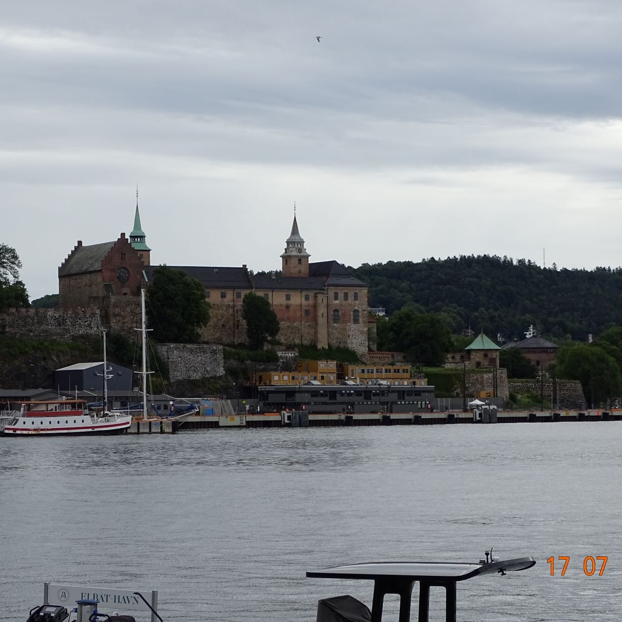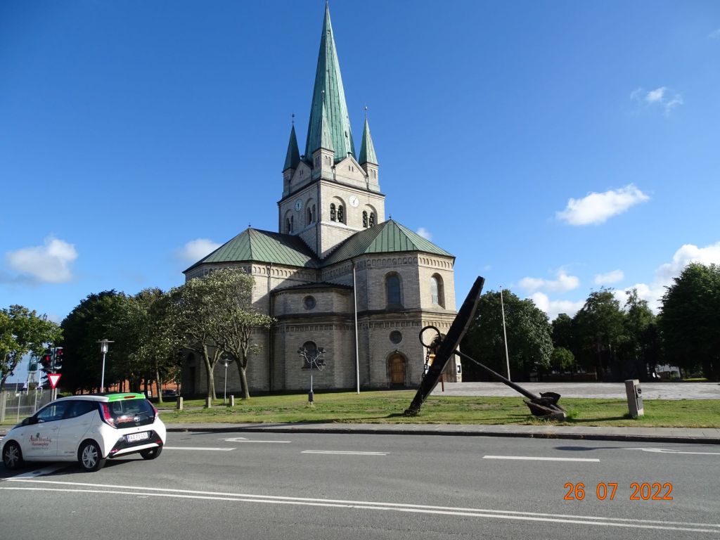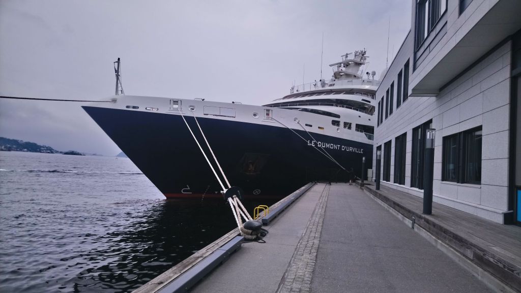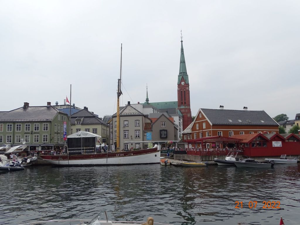 Arendal est une ville très fréquentée en été. La marina très animée est équipée d’une piscine dont nous profitons gratuitement, suite à une erreur d’un des jeunes chargés de l’accueil qui nous donne un code d’accès passe-partout. Malgré le temps très mitigé de cette journée d’escale, nous nous promenons sur les quais bondés, rendons une visite au petit navire (petit relativement !) de croisière nordique français, le Dumont d’Urville, montons sur les hauteurs admirer la vue un peu brumeuse sur l’île et le fjord, et profitons de la piscine et des bars avoisinants. Nous trouvons des pinces de crabes et d’énormes langoustines chez le poissonnier pour agrémenter nos repas.