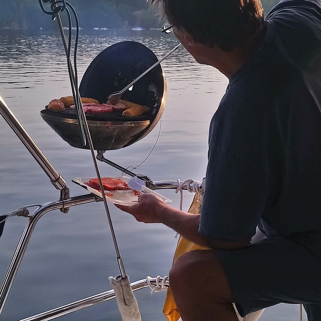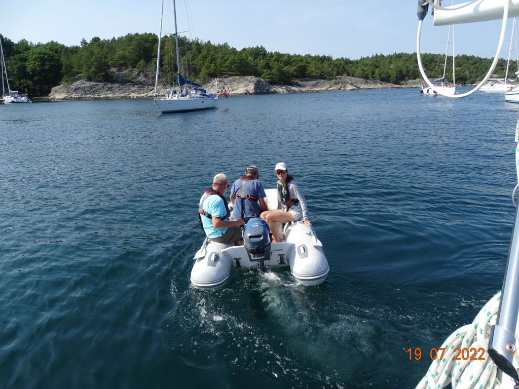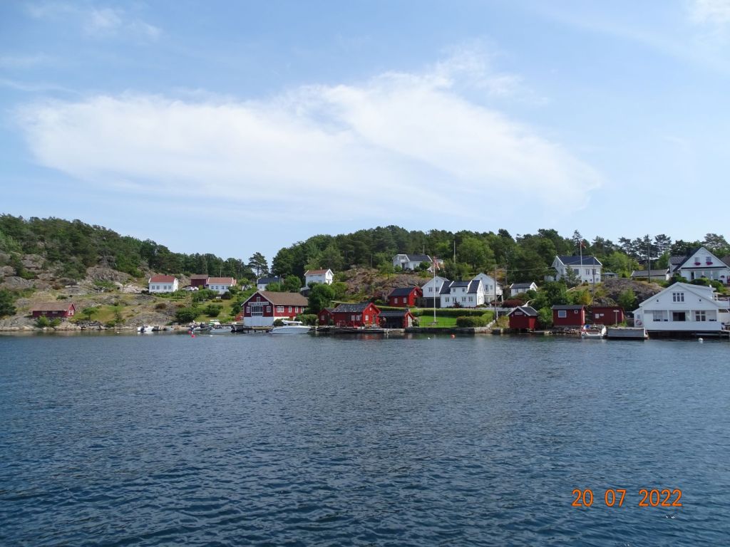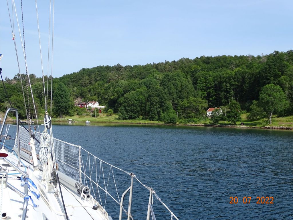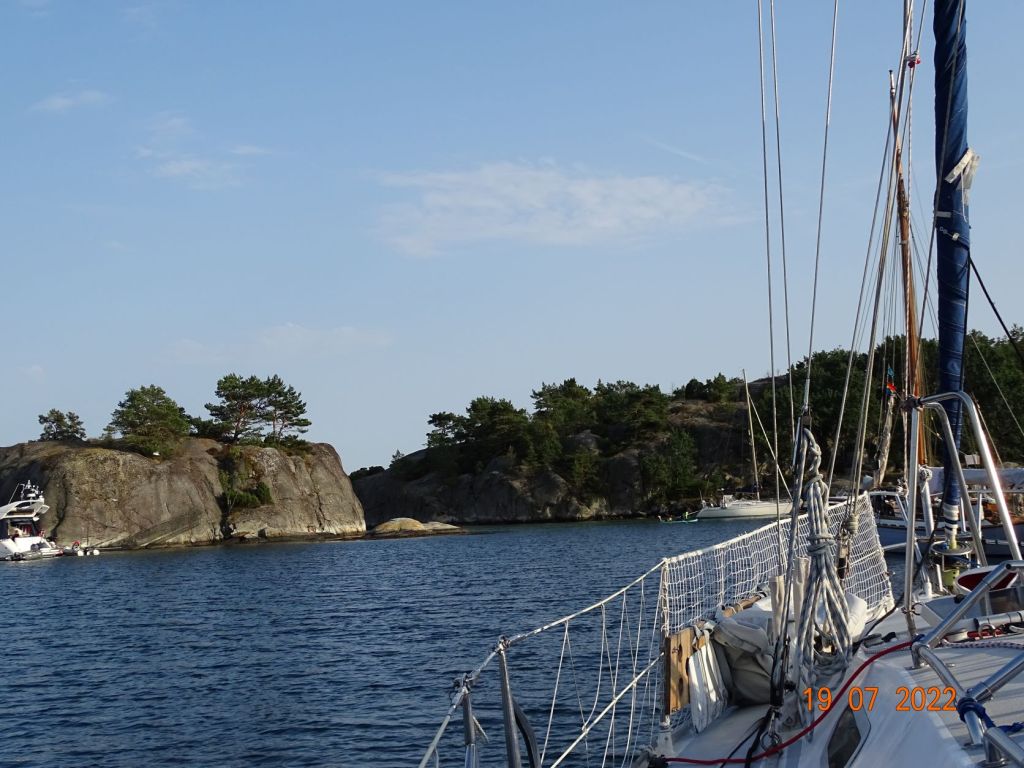 Le temps s’est mis au beau, nous décidons d’en profiter. Malheureusement beau temps est souvent synonyme de moteur, car le vent n’est pas au rendez-vous. Nous rejoignons, donc au moteur, un joli mouillage une vingtaine de milles plus loin vers l’Est, sur une île au Sud de Lillesand : Skauerøya. Ce joli mouillage est très fréquenté en saison. La plupart des bateaux sont amarrés nez aux rochers, sur lesquels sont disposés des anneaux, et une ancre à l’arrière. Les rochers arrondis tombent à pic dans l’eau. Ce type d’amarrage est très utilisés en Norvège. Les bateaux sont munis d’un petit treuil équipé d’une ancre à l’arrière. Nous mouillons au centre de la baie dans un endroit pas trop profond avec d’autres bateaux qui ont choisi ce mode d’ancrage. C’est un peu le problème des mouillages en Norvège, les sites ne manquent pas au milieu de cette myriade d’îles, mais il y a très souvent trop de fond dans les baies pour pouvoir mouiller au centre. La journée n’est pas très calme. Des bateaux à moteur vont et viennent, sans parler des enfants très jeunes parfois qu’on laisse jouer au milieu des bateaux avec les annexes. Nous arrivons à nous baigner malgré les méduses qui pullulent. L’eau est toujours aussi agréable.
