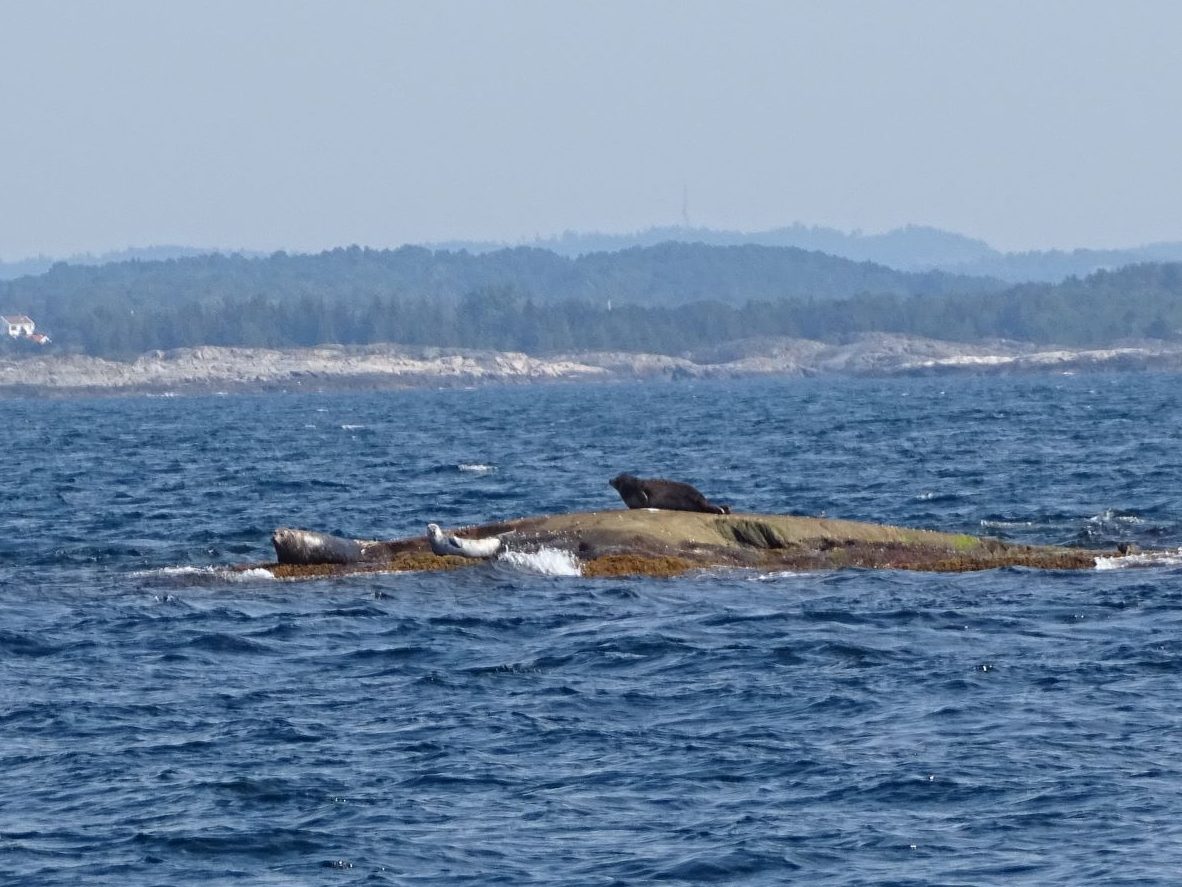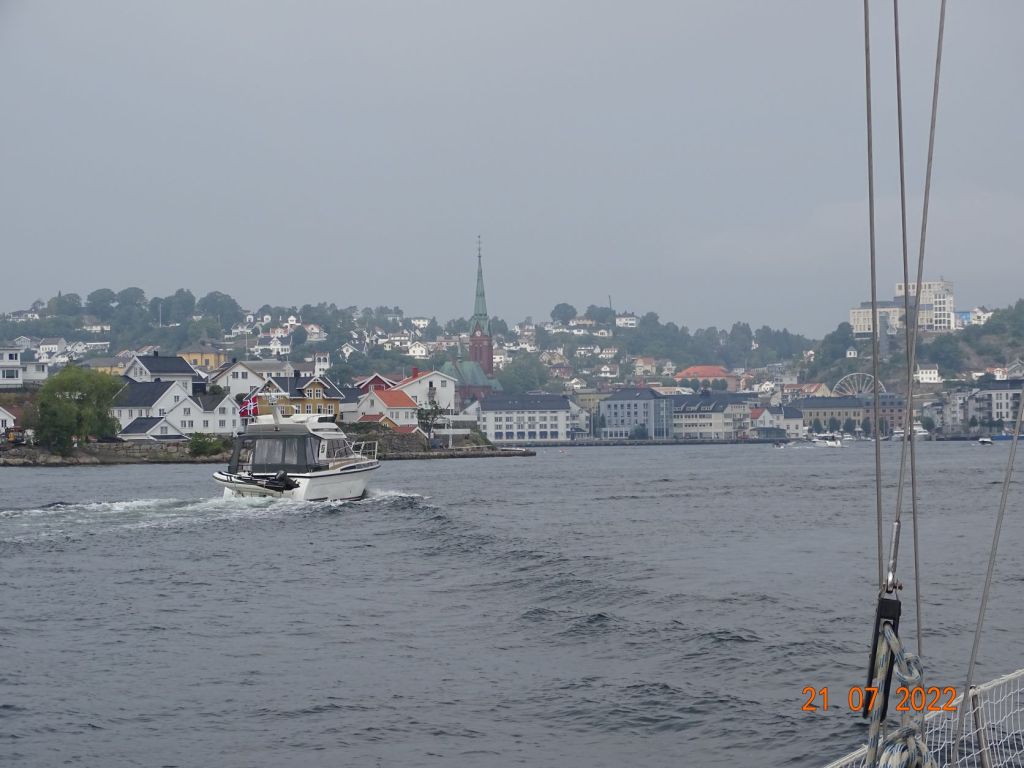 Le lendemain nous levons l’ancre après une petite baignade matinale. Un petit vent de 10-15 nœuds de Nord-Est souffle et nous devons tirer des bords. Nous apercevons des phoques qui se dorent au soleil sur des rochers isolés. Au bout de quatre heures que nous peinons à remonter le vent, nous avons parcouru les 10 milles (en réalité nous avons fait 18 milles sur l’eau en zig-zag) qui nous séparent de Grimstad. Nous remontons le fjord pour aller poser notre ancre au fond, par 16 mètres de profondeur devant une baie boisée. Nos amis, qui ont toujours les jambes qui les démangent, débarquent et rejoignent en courant la ville deux kilomètres plus loin. Nous les retrouvons un peu plus tard pour une baignade. Grimstad est une jolie petite station balnéaire typique avec ses maisons en bois blanc et ses vieux grément amarrés aux quais en bois.