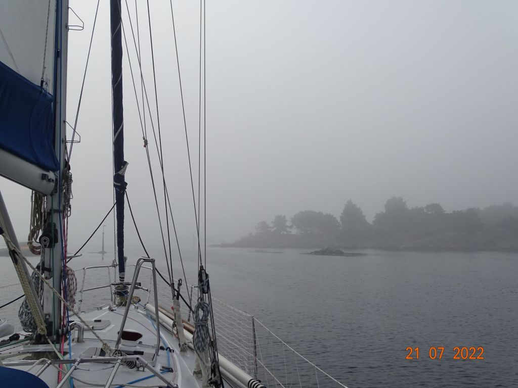 C’est l’ambiance particulière des jours de brouillard qui nous attend au départ de Grimstad. Nous slalomons entre les cailloux, en sautant de balise en balise, et en tentant d‘éviter les bateaux de pêche qui soudain surgissent devant nous au détour d’un étroit chenal. Une petite étape au moteur nous mène à Arendal, ville située au fond d’un fjord entre l’île Sandå et la mer.