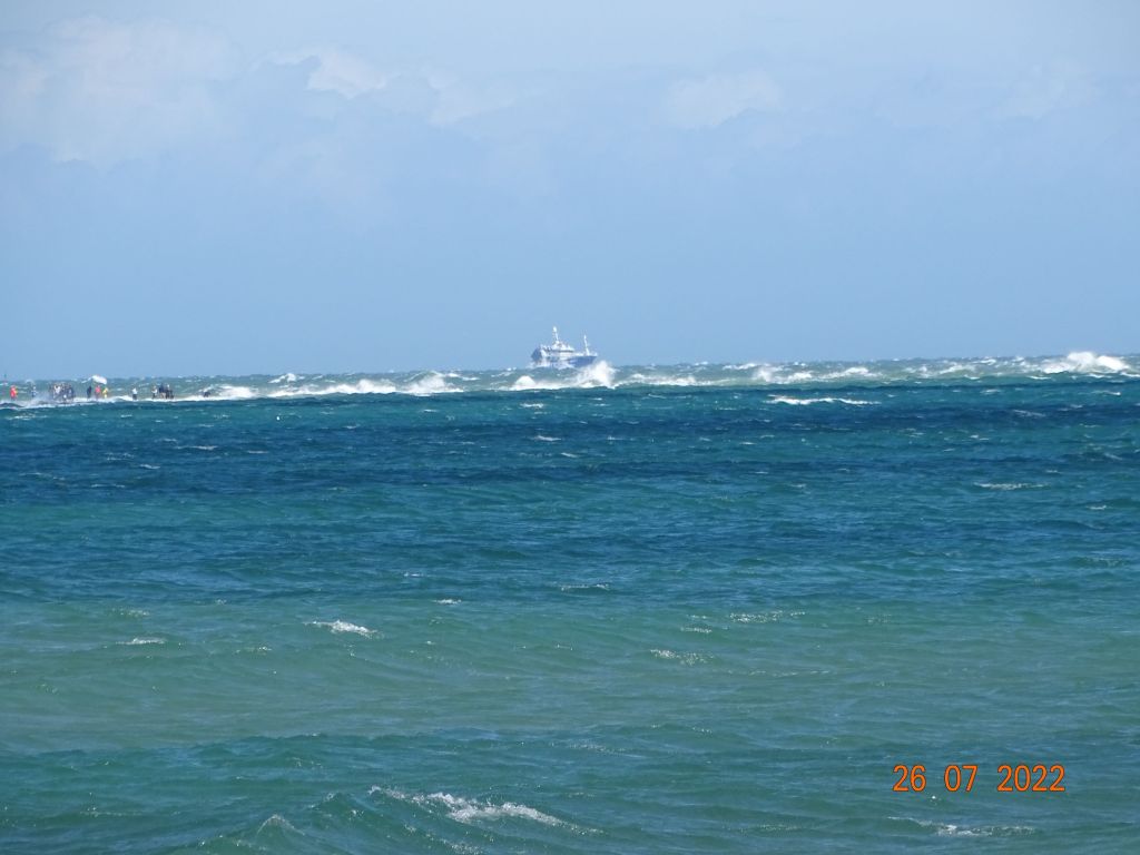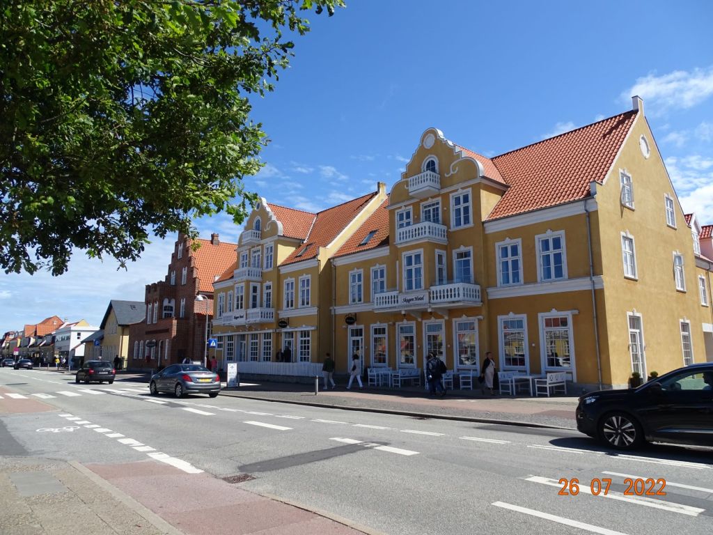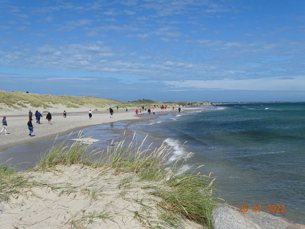La mauvaise météo nous cloue deux jours à Frederikshavn. Le premier jour, il pleut abondement toute la journée et nous restons enfermés dans le bateau à manger des crêpes en vrac (crêpe ratée et néanmoins bonne, tellement molle qu’il est impossible de la retourner) et à regarder « L’étoffe des Héros » ce film, très long sur la conquête de l’espace. Le 26 juillet, le vent souffle très fort avec des rafales à 40 nœuds. Nous partons en balade à Skagen, la ville la plus Nord du Danemark. Après quelques longues minutes de marches, car Silvia a un raté dans son opération guidage, nous trouvons enfin la gare, et après 40 minutes de train nous arrivons à Skagen où un bus nous amène à Grennen, un joli site situé quasiment à la pointe. De là, on peut marcher dans les dunes jusqu’au banc de sable (le récif de Skagen) qui forme cette pointe, et se faire arroser par les grosses vagues qui se forment à la rencontre des deux mers : le Skagerrak et le Kattegat, surtout les jours de grand vent comme ce jour. Le site est très fréquenté en cette période de vacances.