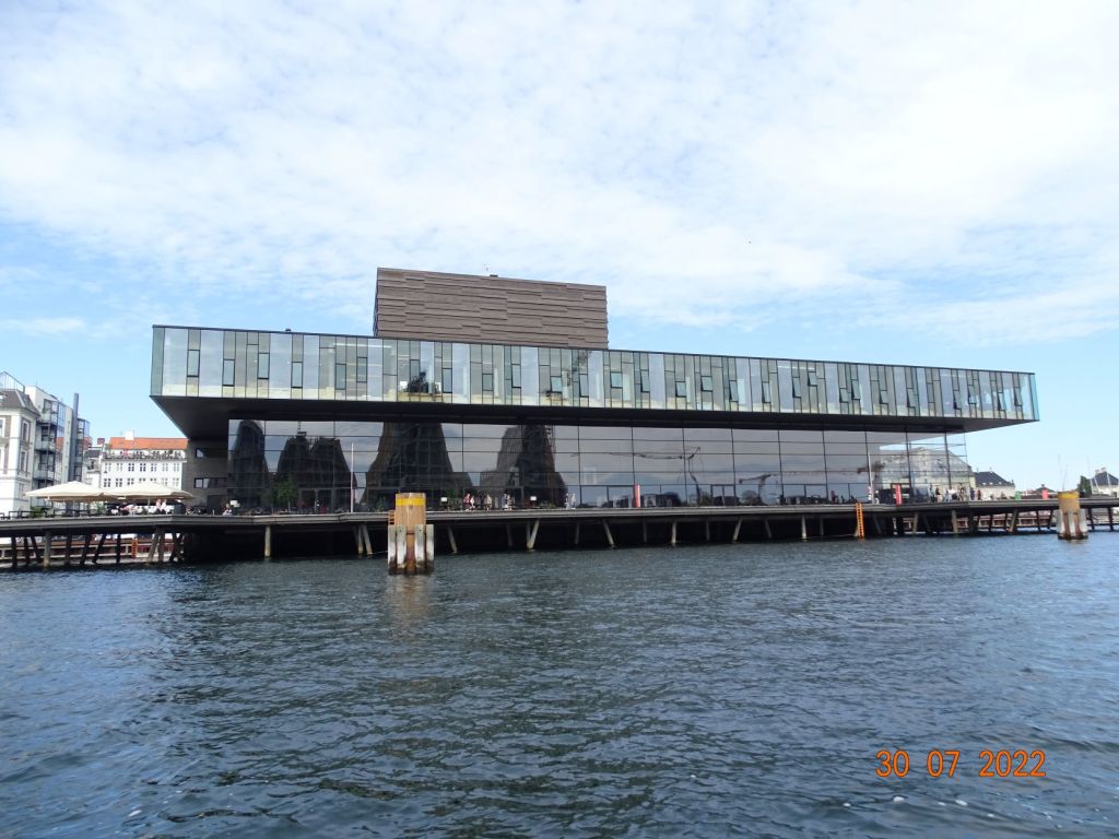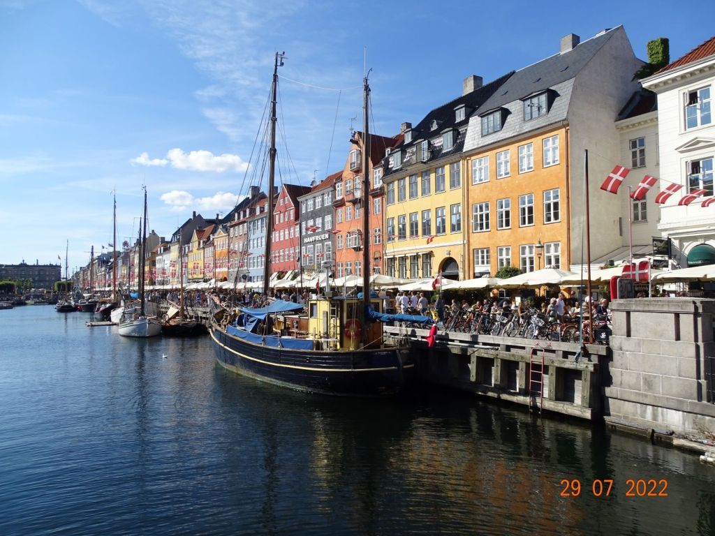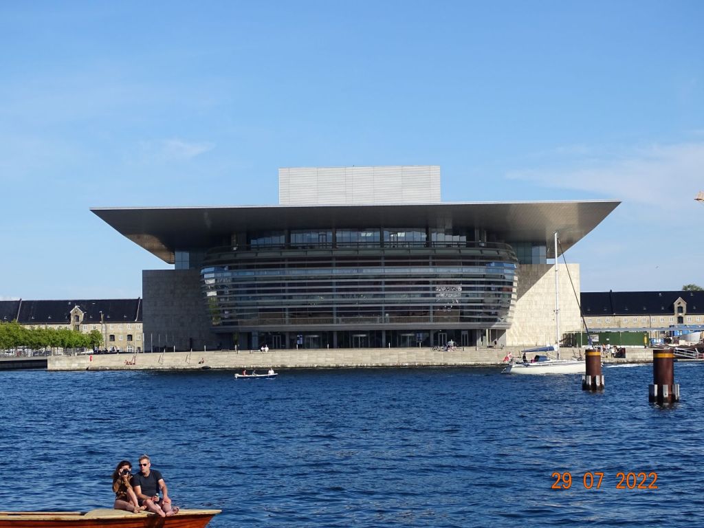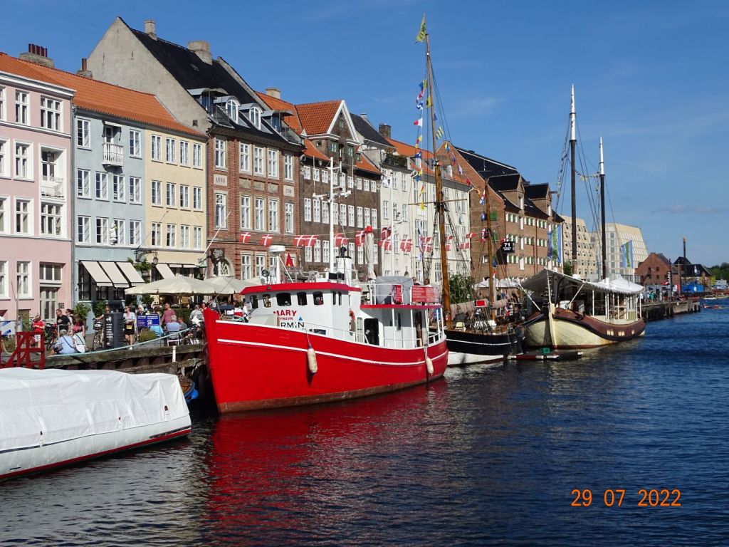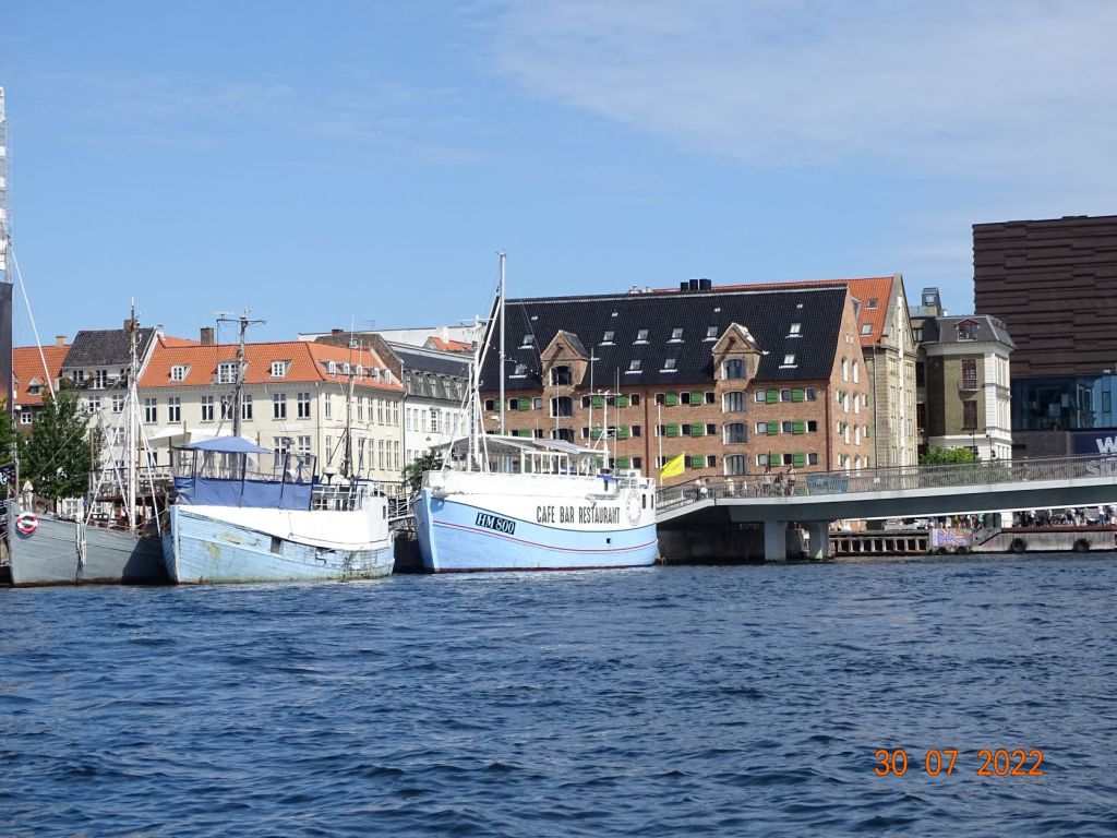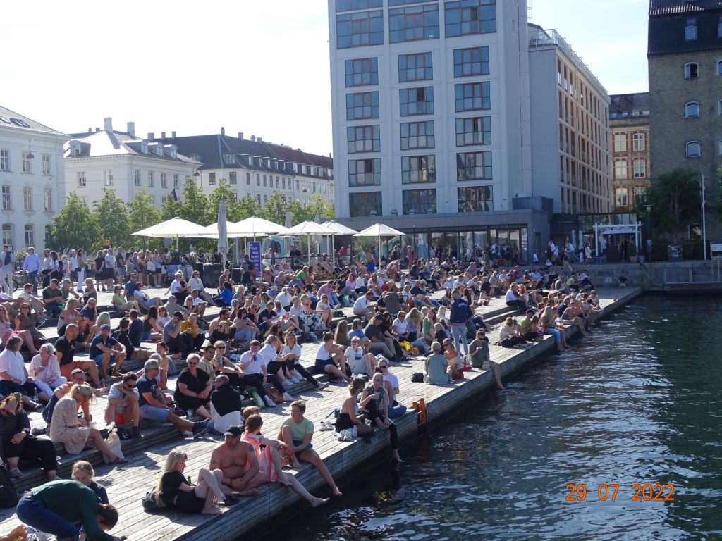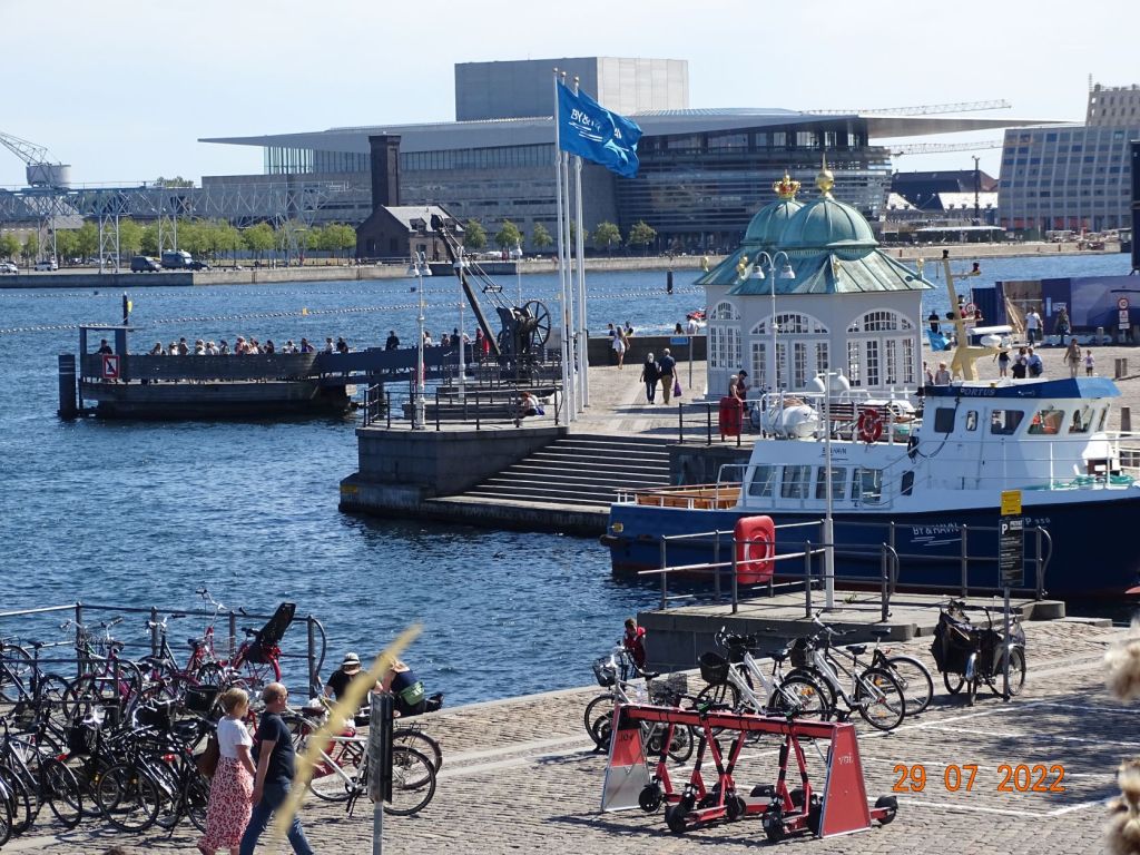 A peine arrivés, Silvia, avec son dynamisme habituel, nous entraine au centre-ville. Nyhavne « nouveau port », comme son nom ne l’indique pas, est le centre historique portuaire de la ville. D’anciennes maisons colorées entourent ce bassin où sont amarrés vieux gréement et vedettes de promenades. Quelques bateaux de passages peuvent également s’y amarrer, il faut aimer le bruit et la foule, car les quais sont bordés de bars et remplis de touristes. Les quais du grand chenal qui remonte vers le centre de Copenhague sont plus aérés, bordés de constructions modernes (l’Opéra, la salle de spectacle) qui s’accordent bien avec les vieux immeubles restaurés, d’anciens sièges de comptoirs commerciaux. Des zones sont aménagées en « plages » où l’on s’assoie sur des marches en bois ou sur des chaises longues, en sirotant une bière pour profiter de la soirée. Une ambiance de fête règne en cette belle soirée d’été. Nous repérons un dock face à la marina où il semble régner une ambiance musicale et branchée. Nous le rejoignons en annexe, nous nous amarrons au quai et grimpons à l’échelle. Nous passons une bonne soirée sur ce dock désaffecté où sont installés des baraques de restauration « du monde », des tables, des fauteuils et chaises longues, des zones de jeux pour enfants, des terrains de boules et de petits orchestres. On trouve de tout : des crêpes aux spécialités turques ou aux hamburgers ou même raclette, en passant par les grillades ou les glaces.
