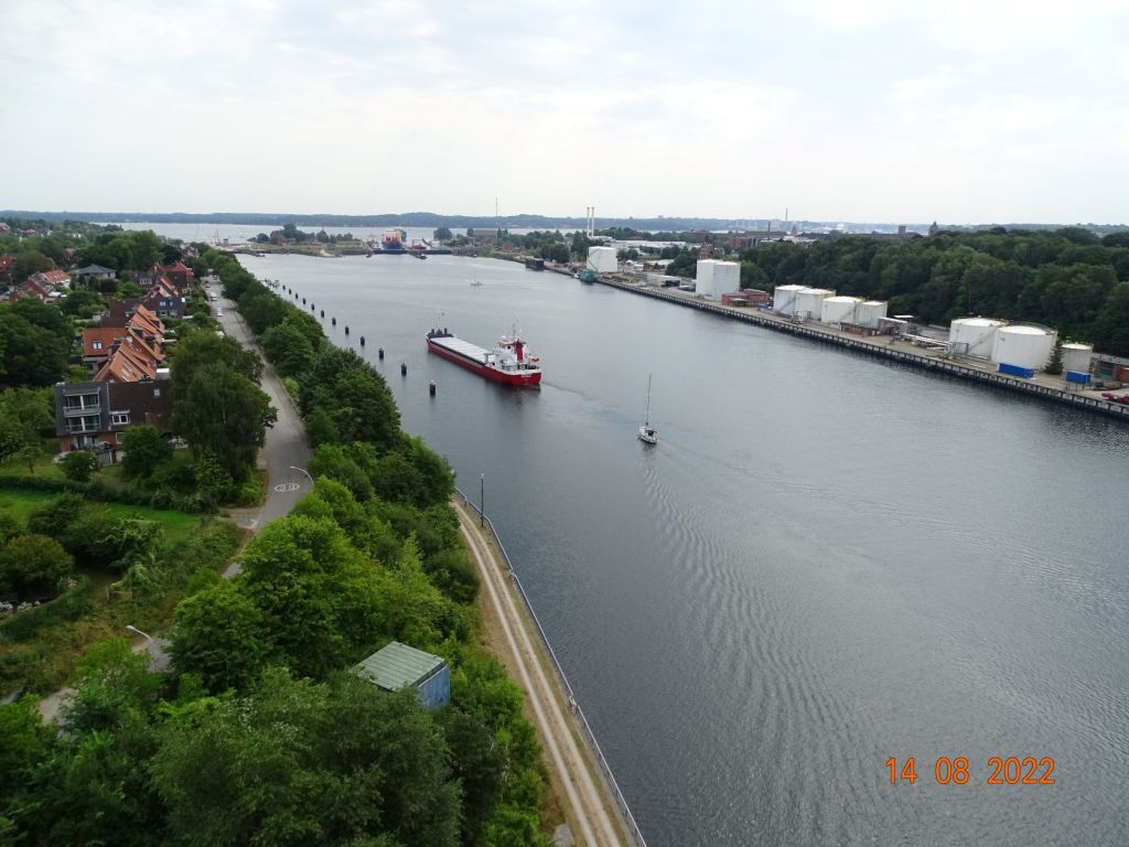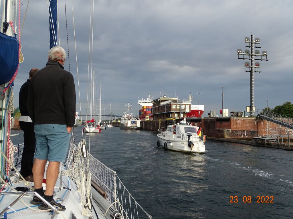 Nous récupérons nos amis Isabelle et Henri à Holtenhau, le quartier de Kiel qui se trouve au niveau des écluses du canal. Il s’y trouve un ponton d’attente pour le NOK sous les arbres. On peut et on doit y payer le droit de passage pour le canal à une caisse automatique. Montant bien modique (18 euros pour un bateau de 12 m).