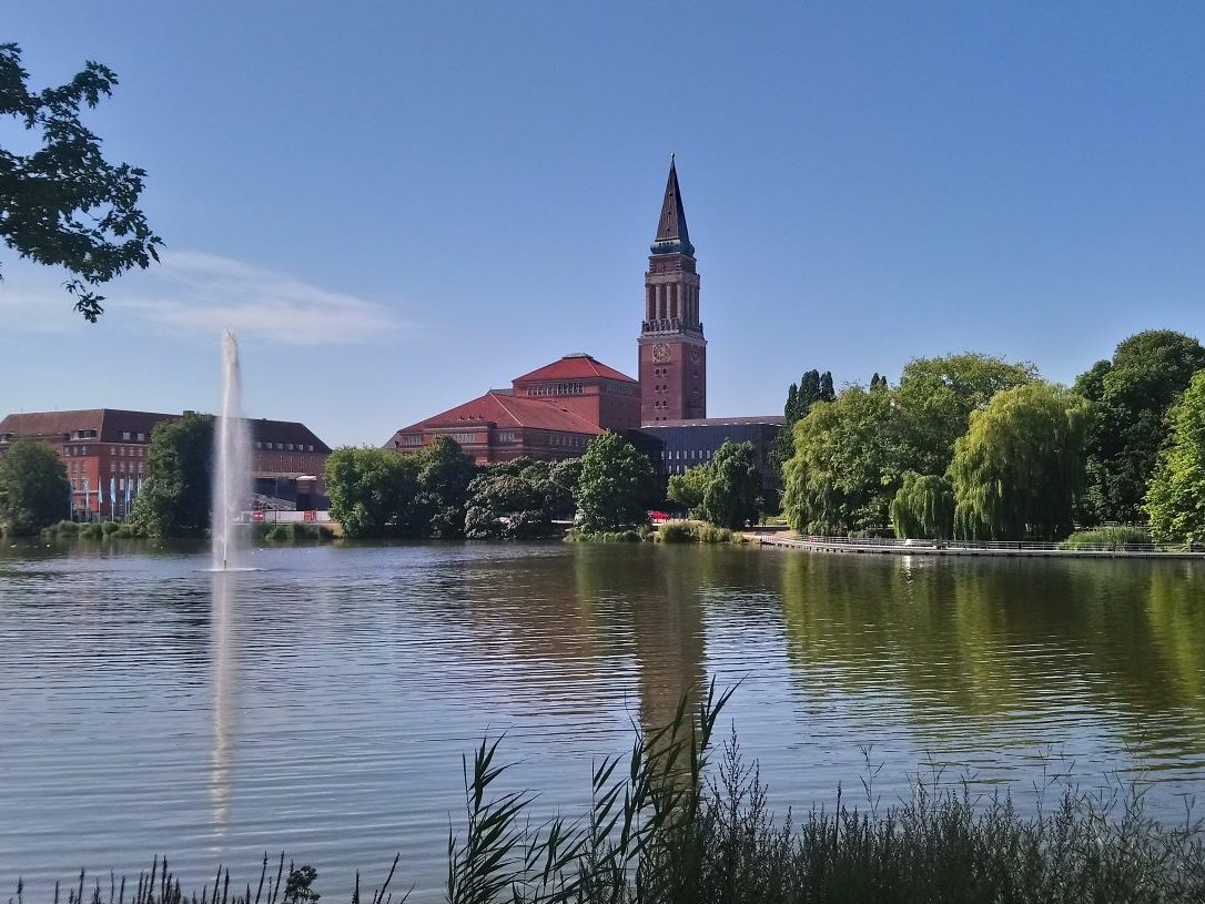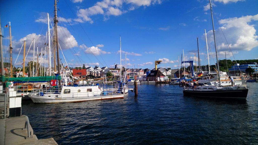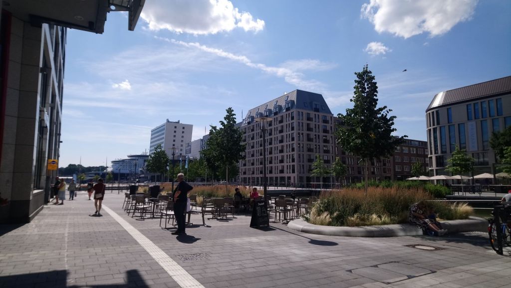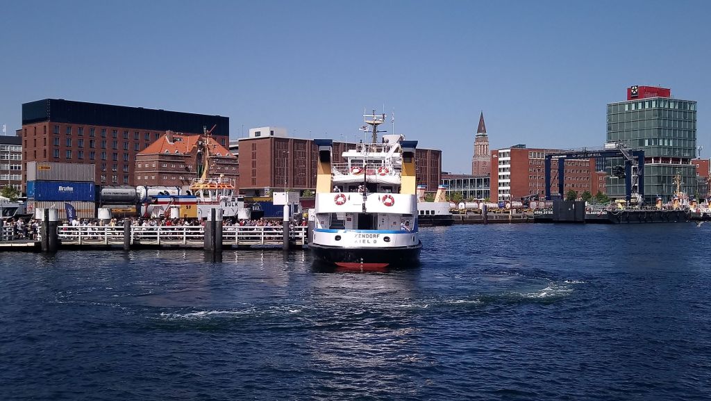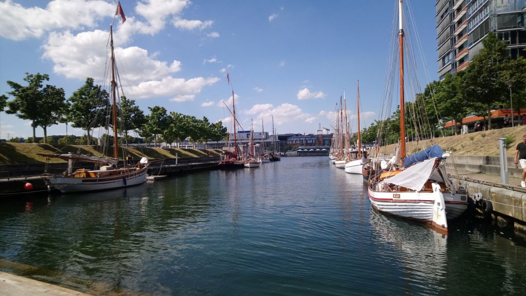 Le vendredi 12 août Free Vikings est sorti de l’eau pour remplacer l’arbre d’hélice tordu et nous débarquons pour le week-end.  Comme nous ne pouvons pas faire avancer notre problème, nous décidons de faire un peu de tourisme. Après plus d’une heure de transport, un changement de bus nous arrivons à notre hôtel dans la grande banlieue de Kiel. Cet hôtel est probablement un lieu utilisé pour des séminaires en tout genre, il est très éloigné du centre-ville un peu touristique. Nous trouvons heureusement un sympathique restaurant ouvert tout près, et nous pouvons diner sous la fraicheur des arbres, en cette chaude soirée d’été. Nous prenons le bus pour nous rendre au centre-ville animé de Kiel. Toute la vie de la ville se regroupe autour du port : terminal de ferrys, de bateaux de croisière et lieu de passage des cargos qui empruntent le NOK (Nord-Ostsee-Kanal ou Canal de Kiel). La couleur rouge domine dans cette ville toute de briques. Nous déambulons entre les nombreux espaces verts et les larges avenues, les rues piétonnes où les habitants font leur shoping en ce samedi. La foule se presse au terminal des ferrys qui desservent les diverses localités de la rade de Kiel. Un petit pont piéton enjambe le port pour relier la rive droite où on trouve une jolie darse abritant de vieux gréements.
