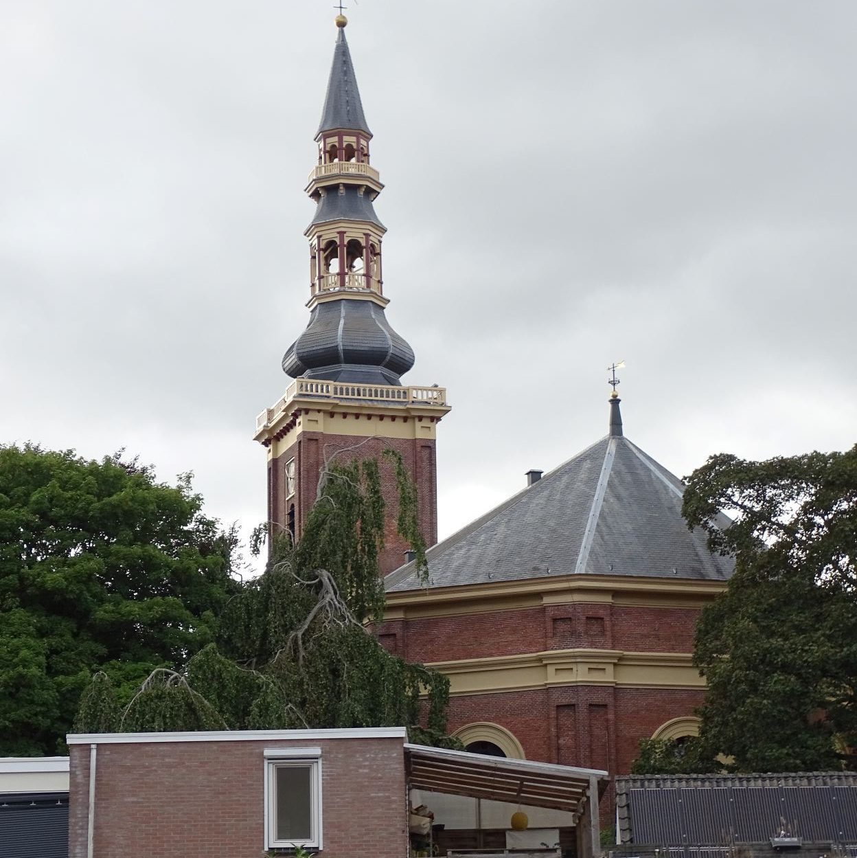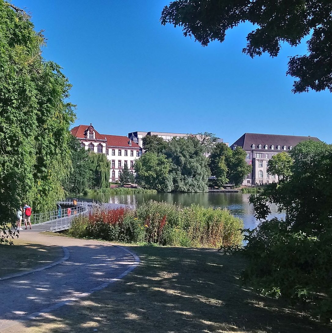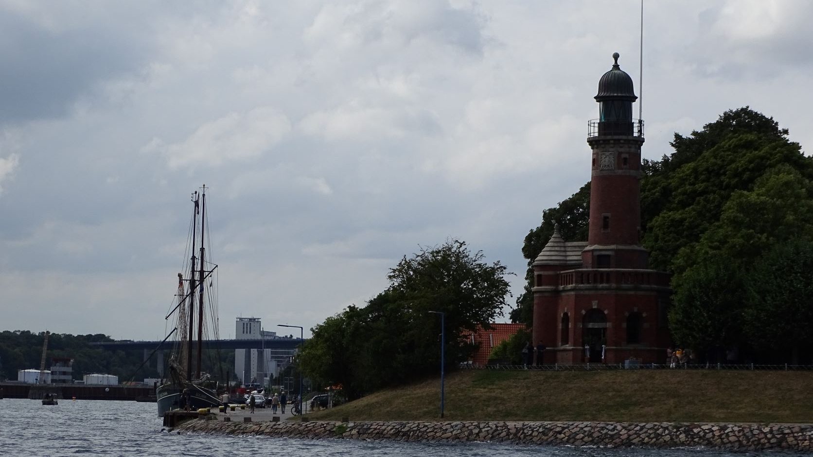 Le vendredi 12 août Free Vikings est sorti de l’eau pour remplacer l’arbre d’hélice tordu et nous débarquons pour le week-end.  Comme nous ne pouvons pas faire avancer notre problème, nous décidons de faire un peu de tourisme. Après plus d’une heure de transport, un changement de bus nous arrivons à notre hôtel dans la grande banlieue de Kiel. Cet hôtel est probablement un lieu utilisé pour des séminaires en tout genre, il est très éloigné du centre-ville un peu touristique. Nous trouvons heureusement un sympathique restaurant ouvert tout près, et nous pouvons diner sous la fraicheur des arbres, en cette chaude soirée d’été. Nous prenons le bus pour nous rendre au centre-ville animé de Kiel. Toute la vie de la ville se regroupe autour du port : terminal de ferrys, de bateaux de croisière et lieu de passage des cargos qui empruntent le NOK (Nord-Ostsee-Kanal ou Canal de Kiel). La couleur rouge domine dans cette ville toute de briques. Nous déambulons entre les nombreux espaces verts et les larges avenues, les rues piétonnes où les habitants font leur shoping en ce samedi. La foule se presse au terminal des ferrys qui desservent les diverses localités de la rade de Kiel. Un petit pont piéton enjambe le port pour relier la rive droite où on trouve une jolie darse abritant de vieux gréements.