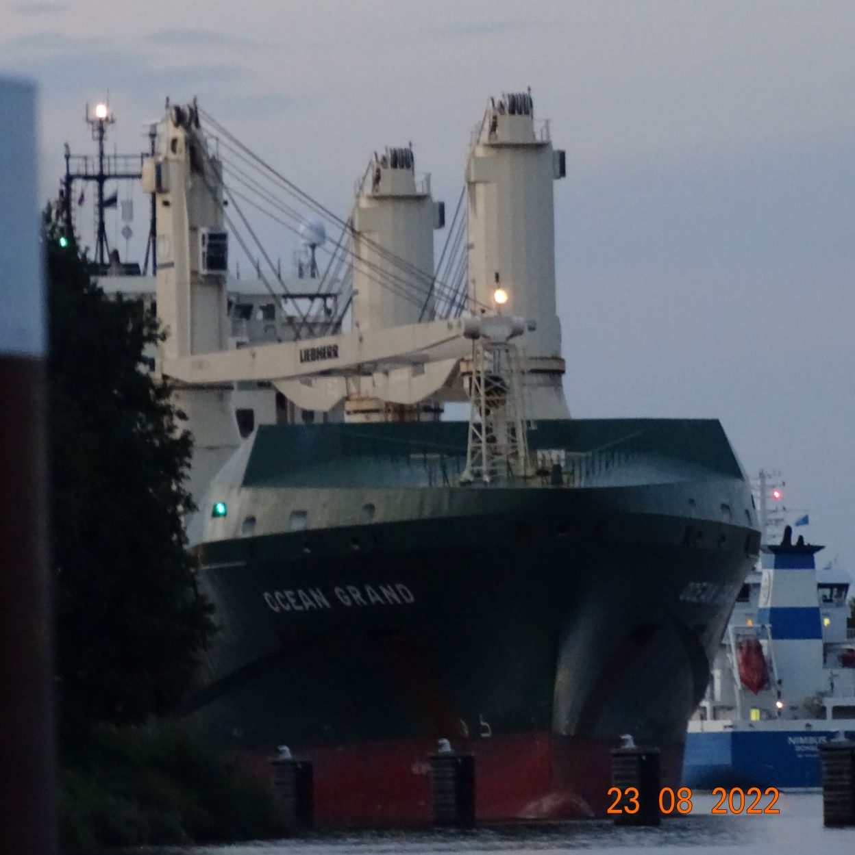 Nous nous arrêtons pour le soir dans une des quelques haltes prévues pour les plaisanciers au km 21 (la distance est mesurée depuis Brunsbüttel). Nous nous amarrons entre les piquets dans la petite anse où une plage est aménagée pour un camping, nous nous baignons dans une eau un peu limoneuse mais claire et bonne. Nous passons une belle soirée dans un cadre bien bucolique. Dans la soirée nous assistons à un drôle de ballet de cargos qui s’arrêtent, repartent, se croisent ; il y a affluence sur le canal ! S’arrête-t-ils sur les rangées de duc d’Albe placés par endroits pour désengorger les écluses ? Le trafic ne s’arrête pas la nuit sur ce canal.