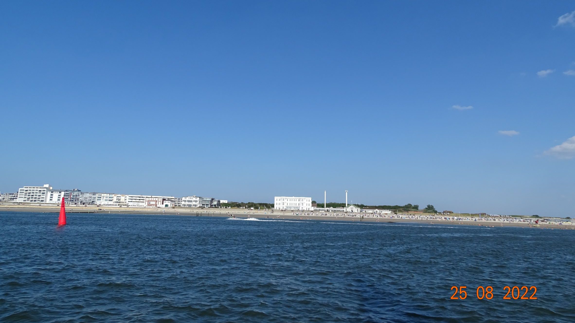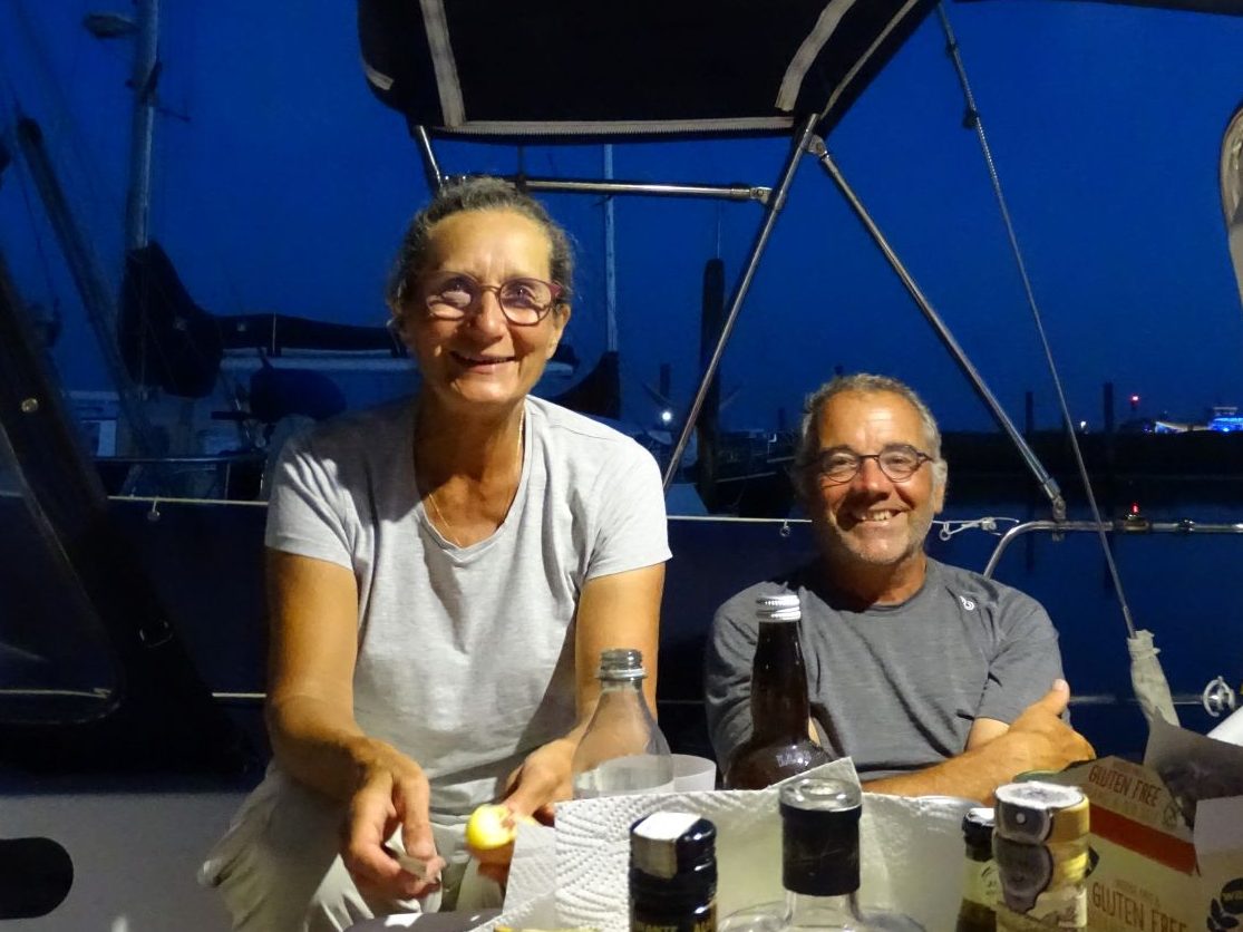 Nous repartons dès le lendemain. Nos amis ont pris leur billet d‘avion de retour depuis Amsterdam et il ne faut pas trainer en route si nous voulons y arriver. Une belle navigation au portant, tantôt sous gennaker, tantôt voiles en ciseaux nous amène à Norderney, une des îles de la Frise allemande. Nous y retrouvons Colette et Rémi sur le Strana, des voisins du Pays de Gex qui naviguent sur un bateau en aluminium construit par leurs soins. Nous passons une agréable soirée avec eux. Merci les Gessiens d’avoir faits 70 milles en tirant des bords pour cette soirée !
