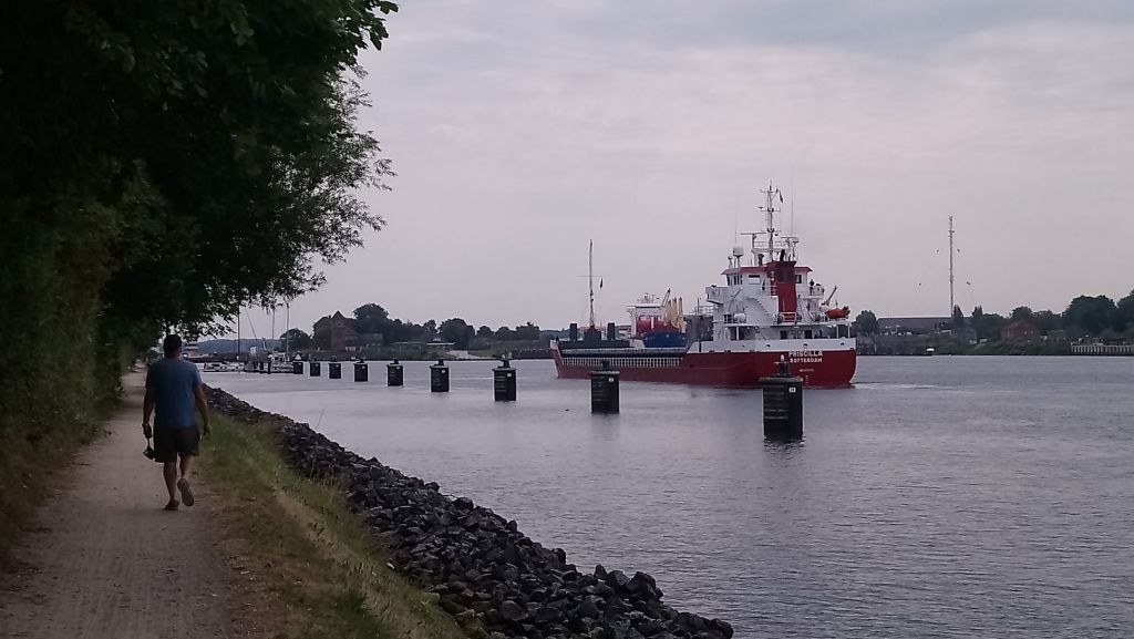 Nous échangeons des informations sur le fonctionnement des écluses avec nos voisins de pontons ; apparemment il faut être sur le qui-vive dès 7 heures du matin. Et effectivement à 7 h15 nous voyons les bateaux quitter le ponton pour se présenter à l’entrée de l’écluse. Branlebas de combat sur le Free Vikings ! Nous les rejoignons vite fait ! Une fois un cargo entré et amarré dans le sas, les embarcations de plaisance sont invitées à se présenter et tous les bateaux très disciplinés (nous sommes en Allemagne !) se rangent les uns derrières les autres aux pontons flottant prévus à cet effet dans le bassin de l’écluse. La différence de niveau est minime et nous voilà partis pour les 57 milles de navigation fluviale. Le paysage champêtre nous ravit, nous nous attendions à un site plus industriel. Nous nous relayons à la barre, il faut rester bien à droite pour laisser passer les énormes cargos et portes containers qui nous croisent ou nous doublent, et faire attention aux nombreux bacs qui traversent le canal, mais ils sont plutôt cools, ils nous laissent souvent passer.