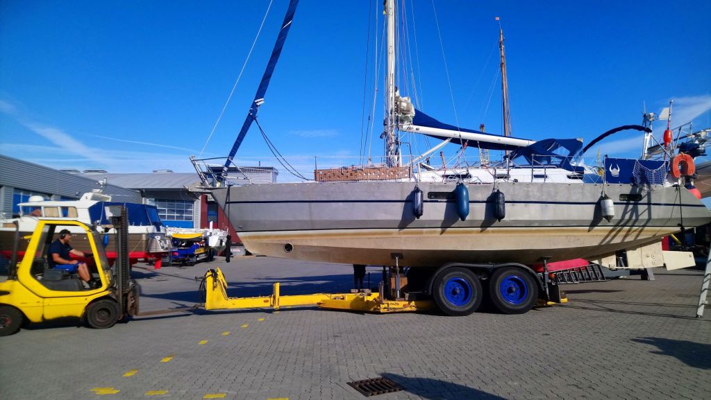 Le vendredi l’arbre d’hélice est enfin livré, les ouvriers du chantier nous font les rectifications nécessaire (mise à la longueur etc…) juste avant la fermeture hebdomadaire, et Philippe s’attaque au remontage. Il a tout le weekend pour fignoler son alignement. Le lundi nous sommes remis à l’eau de bonne heure le matin et… tout tourne rond ! Nous avons la matinée pour remonter les pataras (les étais qui tiennent la mat à l’arrière) qui avaient dû être défaits pour le grutage, régler notre facture, remercier l‘équipe du chantier et enfin larguer les amarres ! Ouf !