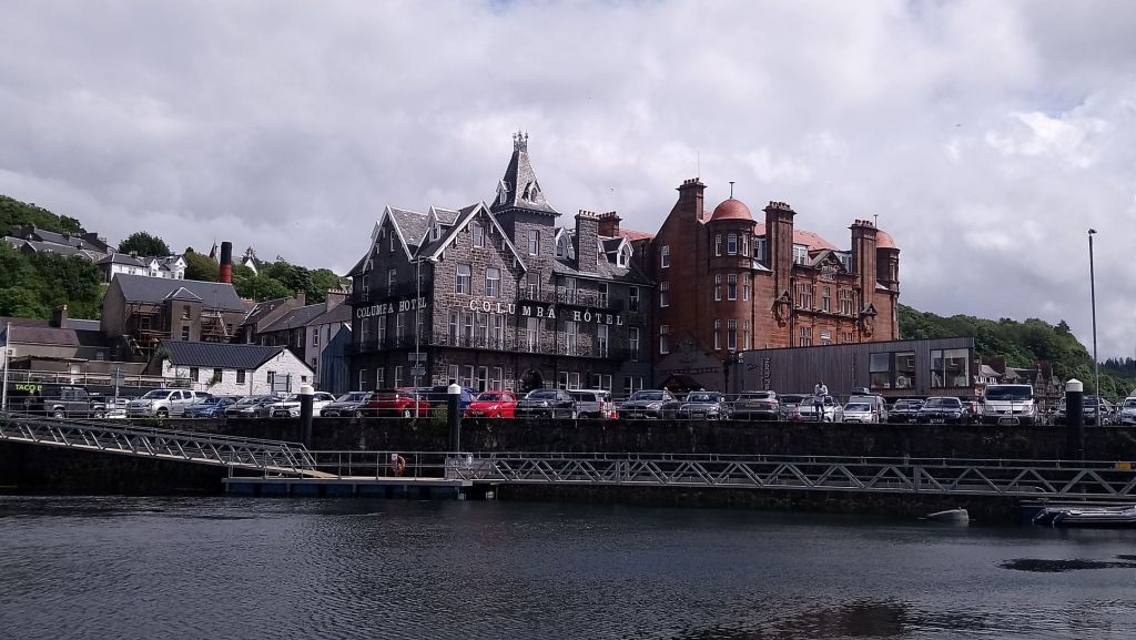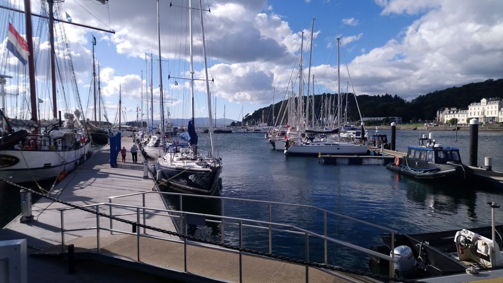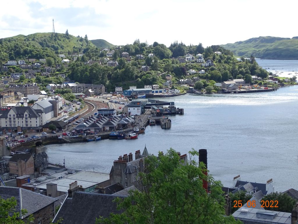 Nous passons deux jours à Oban en attendant que le vent, amené par une dépression qui stagne sur l’Irlande, se calme. Oban est une ville animée d’un style qui n’est pas sans rappeler la partie ancienne de Glasgow. Des immeubles austères, des hôtels de style victorien côtoient des maisons blanches ou colorées, ce qui rend l’ensemble un peu plus gai. Nous trouvons tout ce dont nous avons besoin pour nous reciviliser une peu : des rues commerçantes, des restaurants, des pubs, un grand supermarché…Les « Piers » voient un trafic incessant de ferries qui relient les îles avoisinantes, et font des aller-retours toute la journée. Devant ce trafic important de ferries, de pêche et de plaisance, et afin d’améliorer la sécurité, il a été institué un code de navigation particulier pour accéder au port. Les gros navires utilisent le chenal principal et sont bien sûr prioritaires ; les petits navires, comme nous, doivent suivre un bord déterminé du chenal et le croiser si besoin dans un zone précise en prenant garde aux ferries et en restant en veille sur le canal 12 à la VHF.