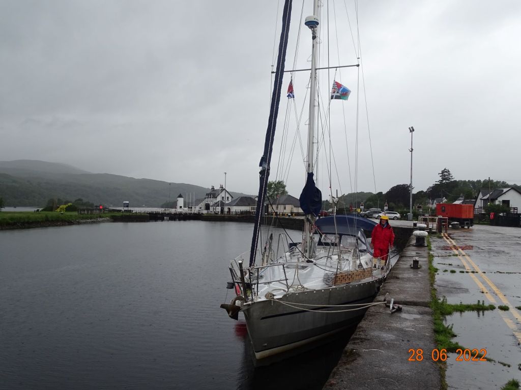 Notre premier jour sur le canal est un jour particulièrement pluvieux et apparemment pas un jour de chance pour nous, car tout se goupille mal. Nous arrivons à l’entrée de la première écluse « Sea Lock » à 8h30, le service commence à 8 heures. La première sassée de bateaux est déjà partie avec tous les bateaux qui attendaient à l’intérieur du premier bassin. Et comme il suit une palanquée d’écluses : une double pour commencer, suivie du « Neptune Stair Case », un escalier de 8 écluses ; ils font un convoi montant et ensuite un convoi descendant avant de reprendre le prochain montant. Et ils n’en font que deux par jours dans chaque sens. Nous attendons donc 4 heures dans le bassin pour passer les deux premières écluses et 2 heures un peu plus loin pour passer les 8 écluses. Au bout de la journée qui finit à 18 heures nous n’avons parcouru que 2 milles et sommes un peu découragés. Nous nous amarrons à Bannavie en haut de l’escalier, un endroit charmant.