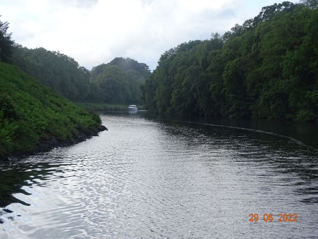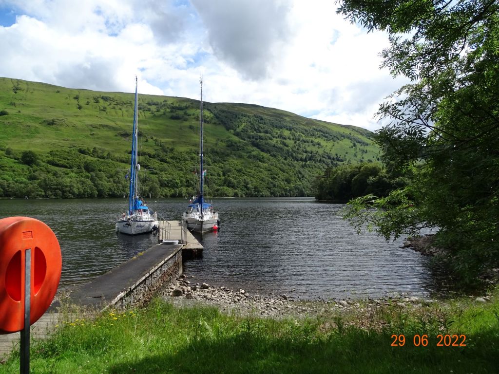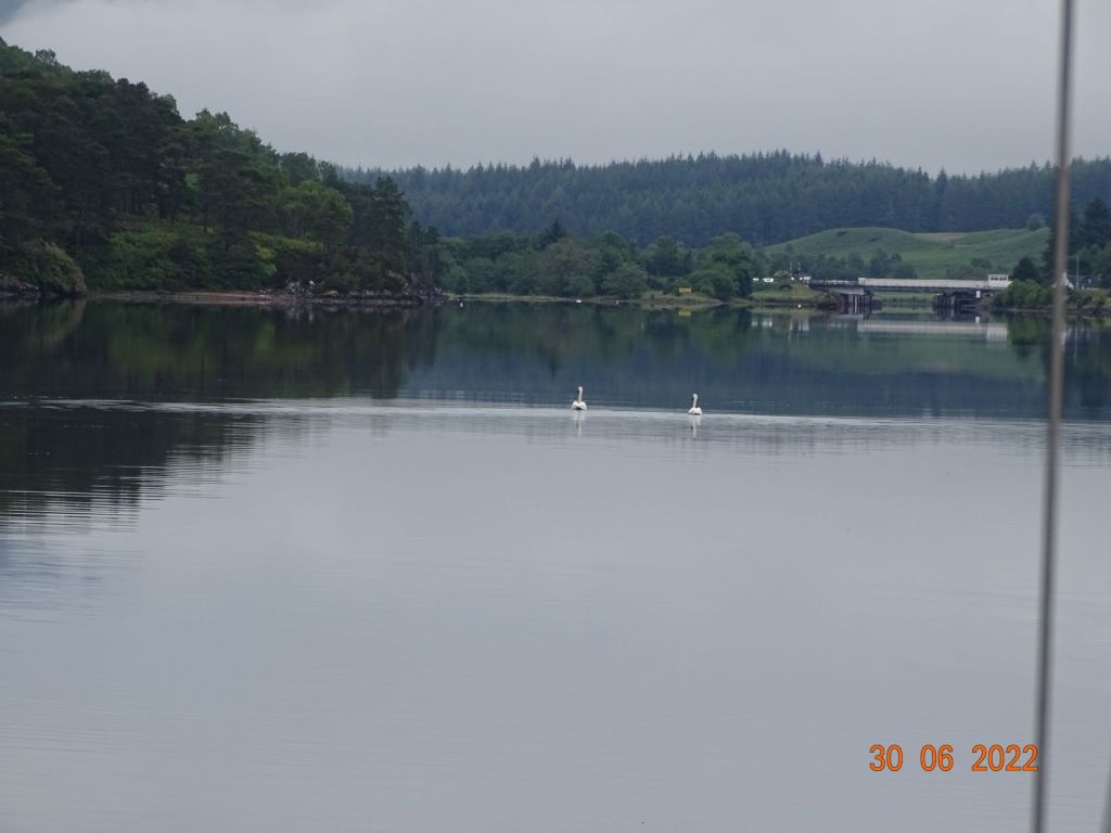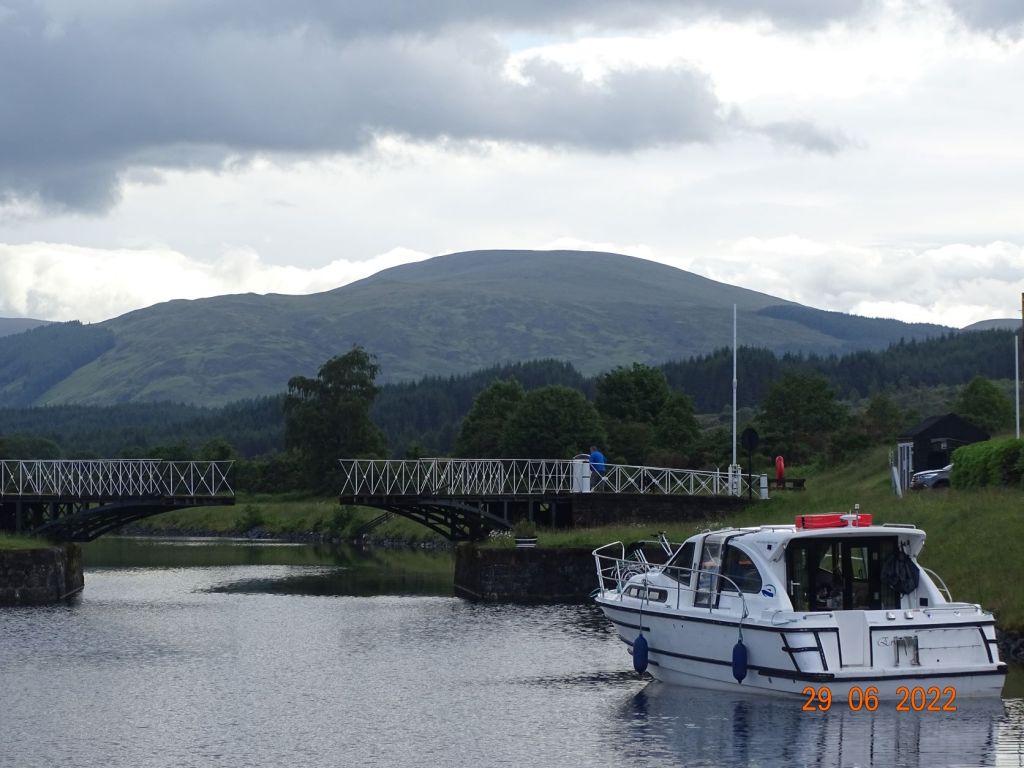 Quatre milles plus loin il y a un pont tournant « Moy Swing Bridge » qui n’a plus de ponton d’attente, il faut s’assurer avant de quitter notre appontement qu’il sera ouvert à notre arrivée. Nous appelons dès 8 heures l’éclusier qui manœuvre ce pont et les écluses suivantes. Il s’ouvrira à 9h30, nous avons un peu de temps devant nous. La journée se passe bien, les écluses et les ponts s‘enchainent sans trop d’attente. Nous traversons notre premier loch, le « Loch Lochy » qui s’étend sur une petite dizaine de milles entre les montagnes. Puis après une portion de canal avec des écluses doubles et un autre « Swing Bridge », nous arrivons dans le charmant « Loch Oich » aux rives boisées où nous nous arrêtons en début d‘après-midi à un ponton au pied d’un château en ruine. Nous y passons la nuit, nous sommes au sommet de notre ascension, à partir de demain ça va redescendre.