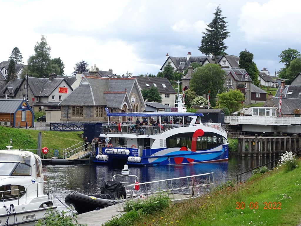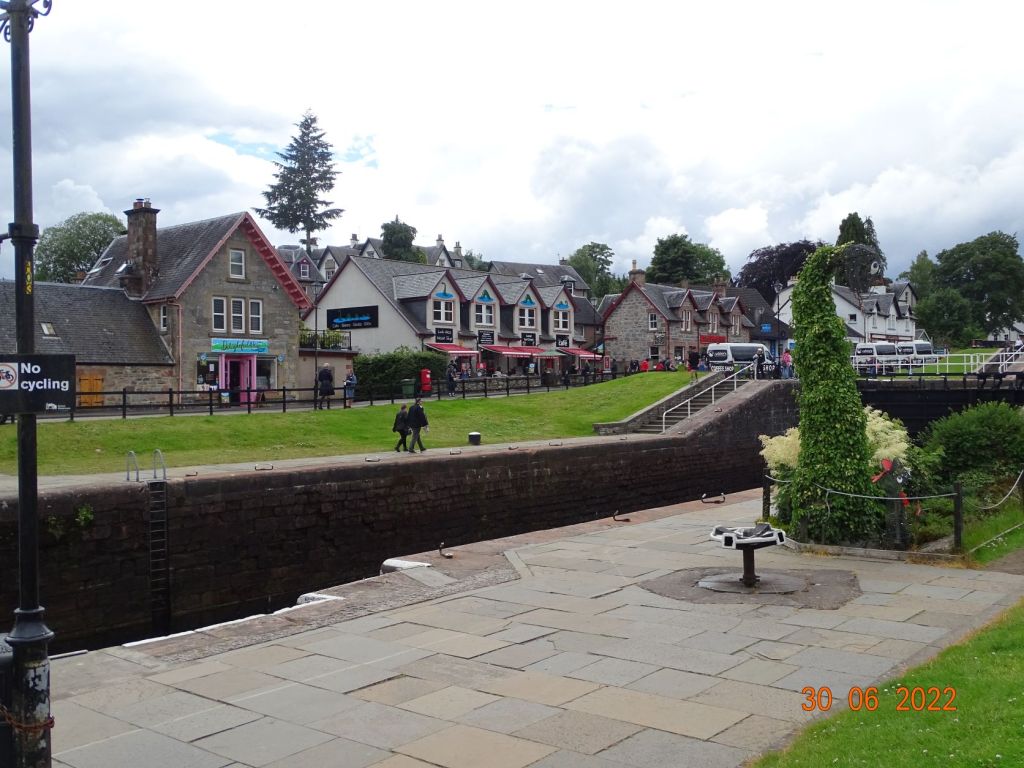 Au réveil nous nous croyons dans un film d’Harry Potter, une brume stagne sur le lac, il n’y a pas une ride sur l’eau, le moment est magique. Nous terminons la traversée du charmant « loch Oich » et reprenons une portion de canal qui nous amène, après avoir encore passé quelques écluses, en haut d’un autre escalier d’écluse descendant celui-là : les écluses de Fort Augustus. Nous les passons vers midi et nous arrêtons au pied, au port de Fort Augustus, à l’entrée du « Loch Ness ». Fort Augustus, contrairement aux autres haltes sur le canal, est très animé. Cette ville est très touristique, la principale attraction étant évidemment, en plus de l’escalier d’écluses, les promenades sur le loch à la recherche de Nessy. Le village est charmant avec ses petites maisons au jolis jardinets fleuris qui bordent l’écluse. Pour ajouter au folklore local, les conducteurs des bus à touristes portent des kilts. Nous profitons de cette pause pour faire quelques courses (il n’y a pas beaucoup d’endroit où se ravitailler sur le canal) et prendre une bière au bord de l’écluse.