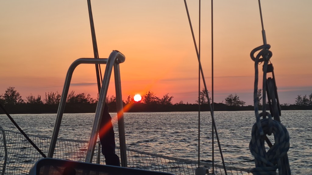 Le 14 avril, arrivant de La Havane, embarquent Silvia et Jean-Marc. Un dernier repas de langouste à La Punta, derniers achats d’eau minérale et quelques fruits, dernière mise au point avec le très arrangeant agent d’immigration qui nous remet notre despacho le veille au soir, et nous pouvons larguer les amarres au lever du jour le 15 avril vers Cayo Largo