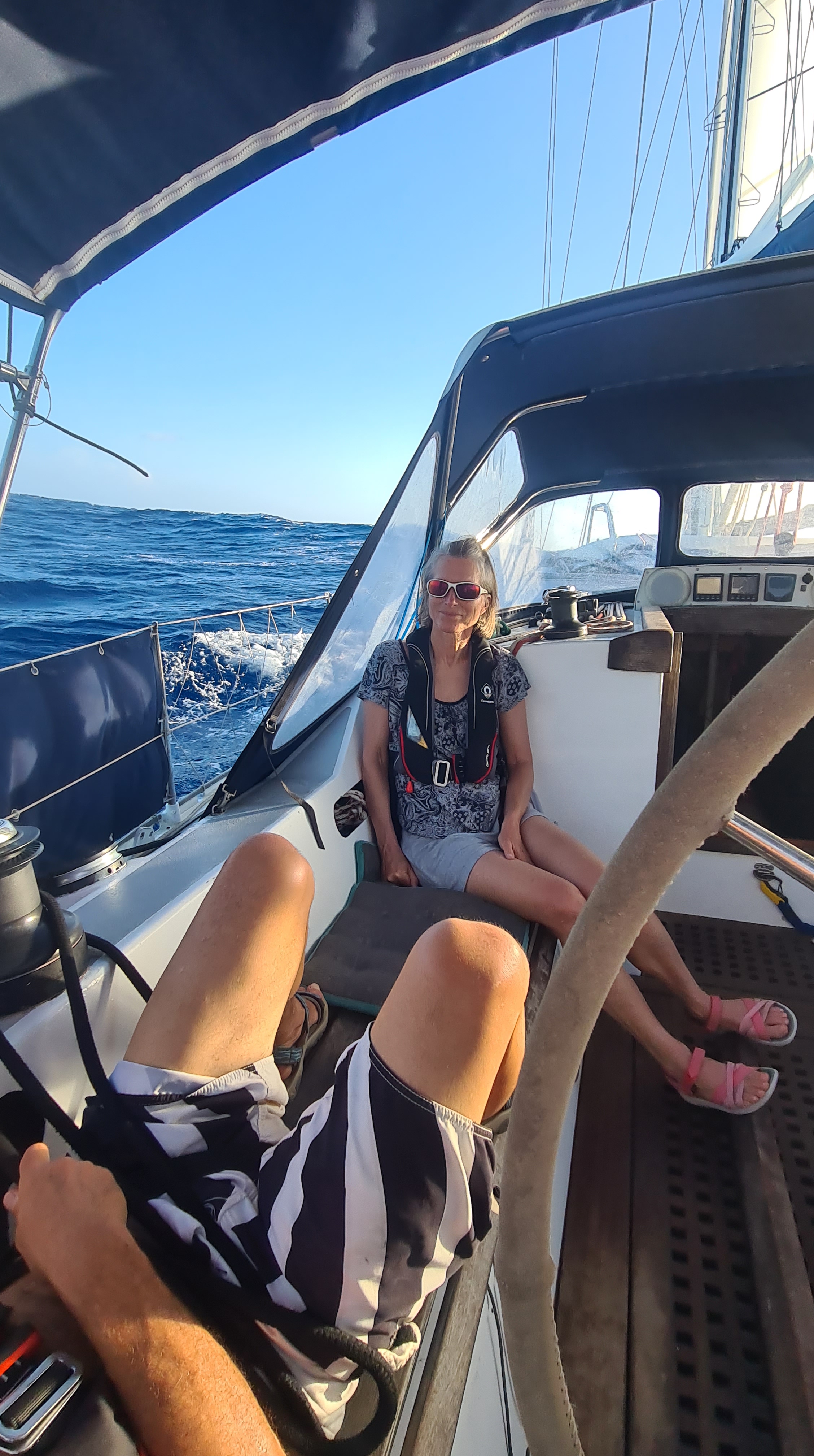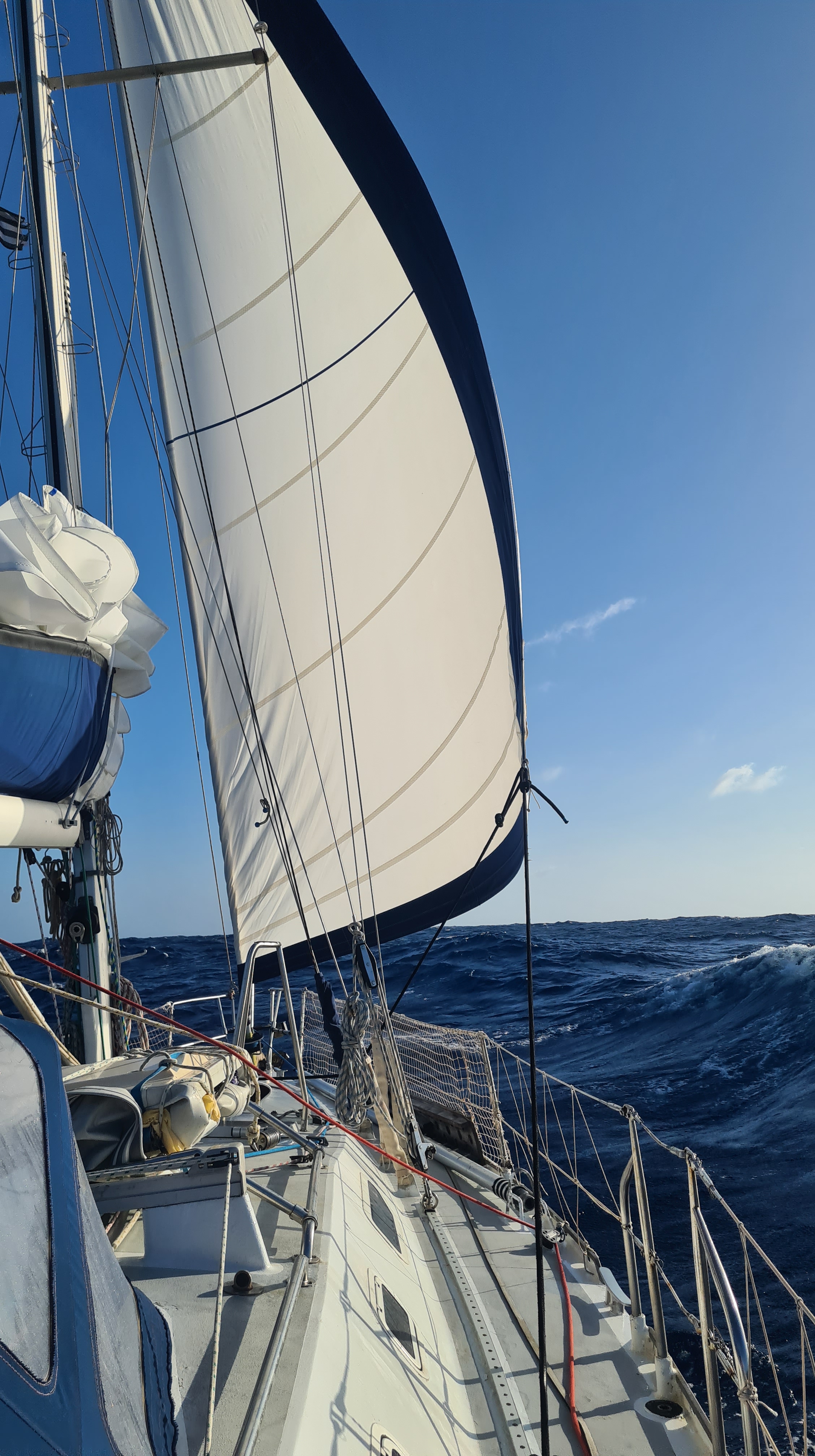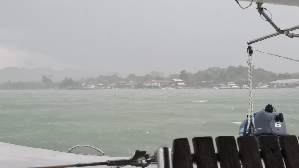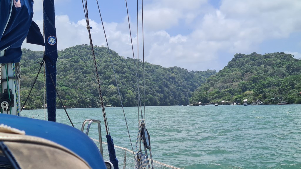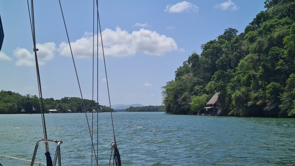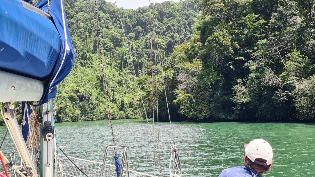 Si la première nuit est calme, le vent se lève progressivement et dès le matin du 18 avril nous sommes poussés par un alizé bien soutenu de 20 à 25 nœuds. La mer se lève avec et nous bouscule pas mal. Silvia et Jean-Marc ressentent le mal de mer, mais ils le gèrent bien et malgré un peu d’inconfort, supportent finalement pas mal le traitement. Le 20 avril le vent ayant un peu tourné, nous sommes moins vent arrière et il faut prendre le second ris car le vent forcit encore un peu. Ce n’est vraiment pas confortable nous sommes ballotés de tous bords par de belles vagues. Nous tentons de prendre le troisième ris avant la nuit mais la poulie s’est vrillée et ça ne coulisse pas bien. Nous renonçons, affalons la grand-voile et terminons sous génois enroulé de presque moitié ! Nous approchons de la côte au matin, le vent tombe progressivement, nous finissons au moteur. Nous passons la barre de Livingston pour aller mouiller à l’embouchure du Rio Dulce vers 13 heures le 21 avril. La traversée n’a pas été si rapide que cela malgré ce bon vent ; nous avons eu un courant contraire pendant un partie du trajet. Nous sommes tous bien heureux de sortir de ce shaker.