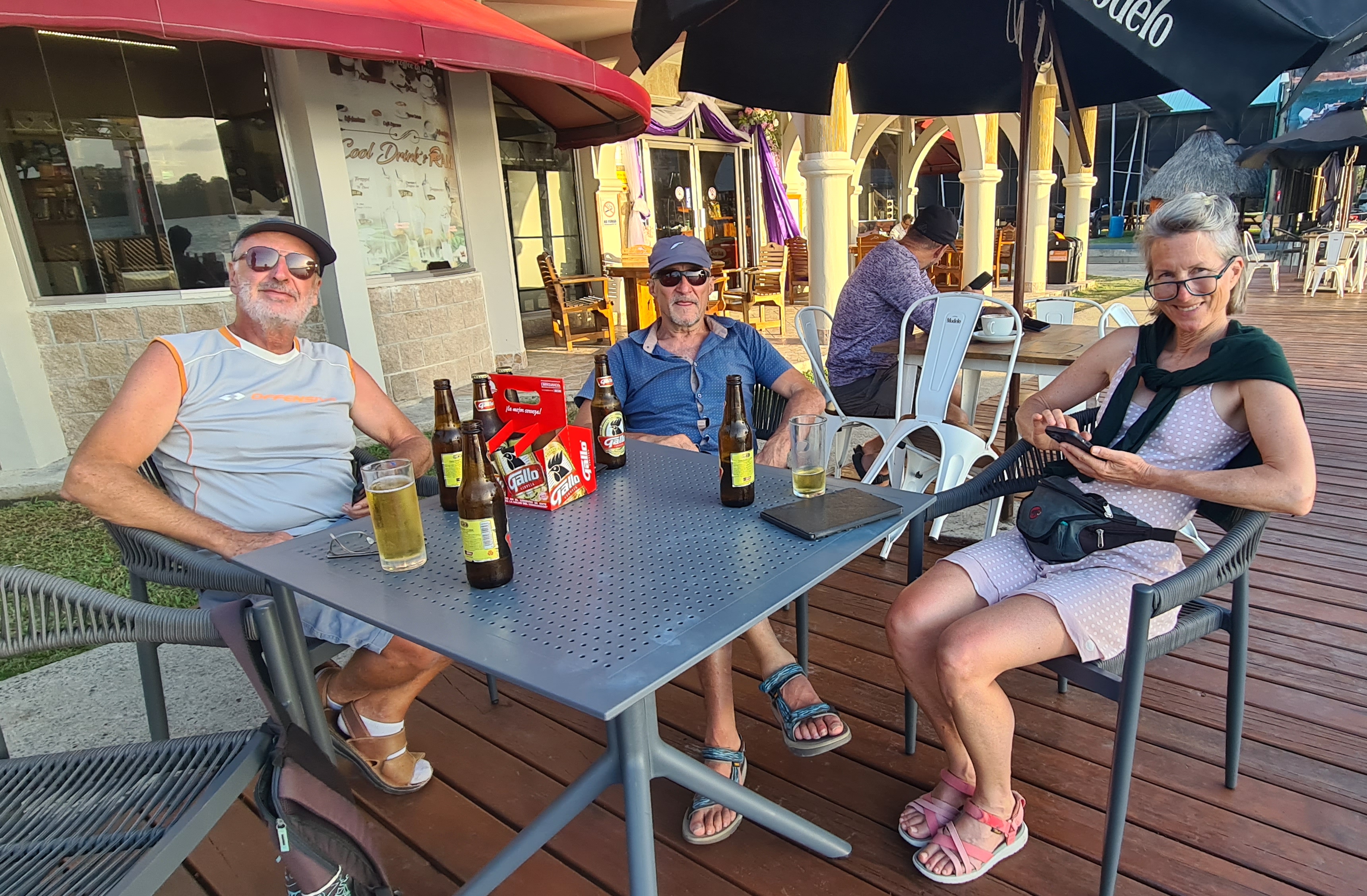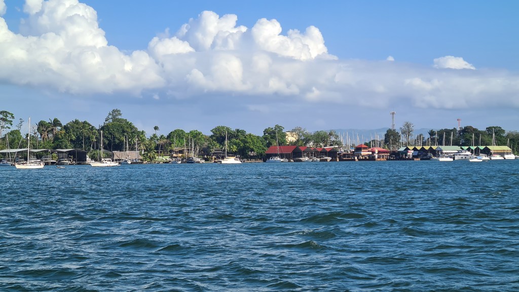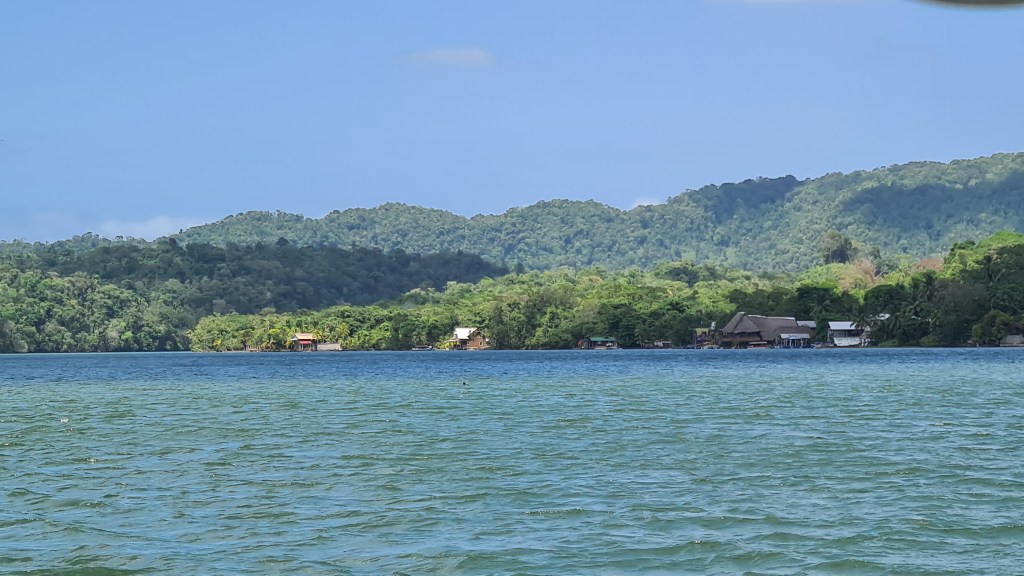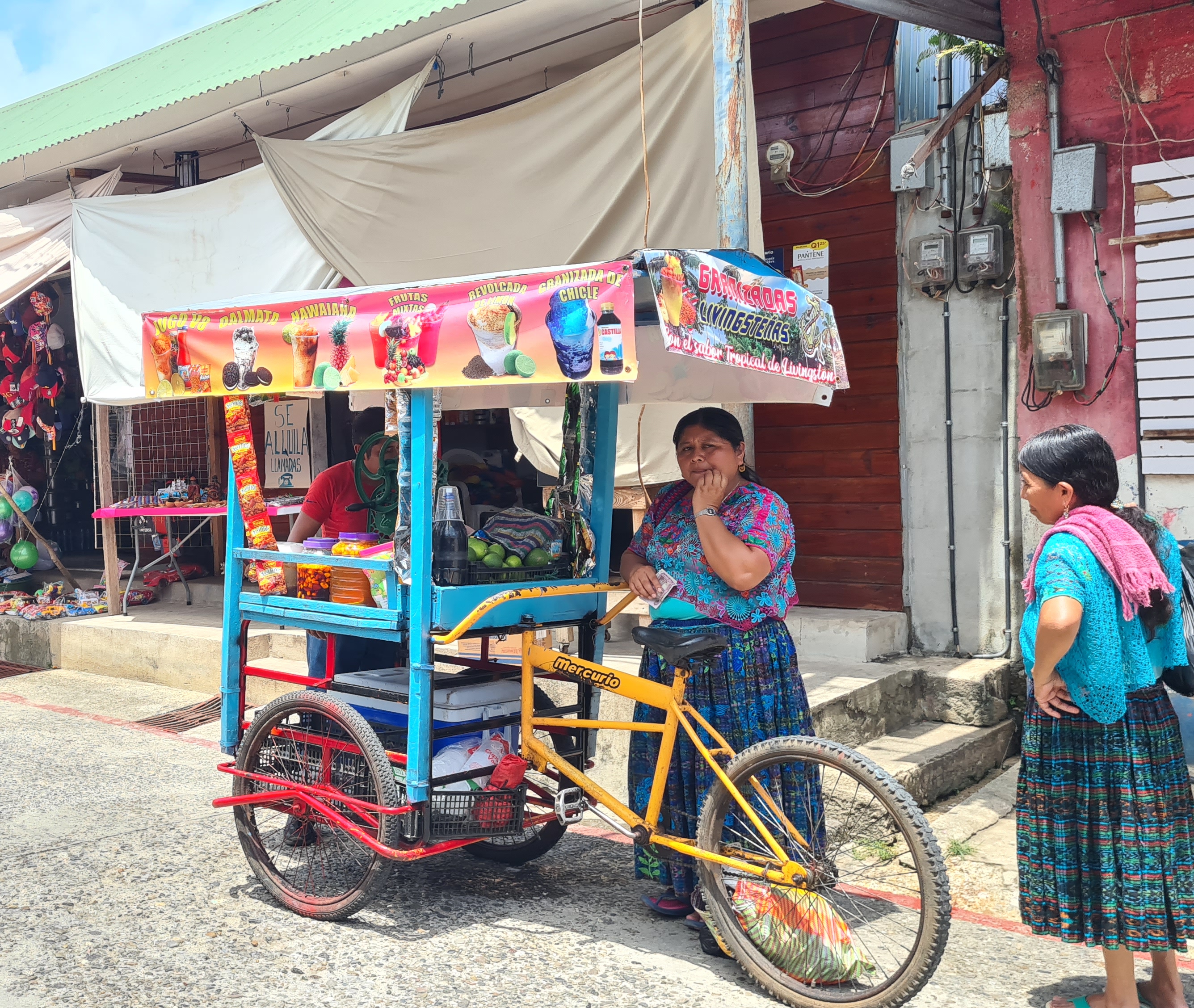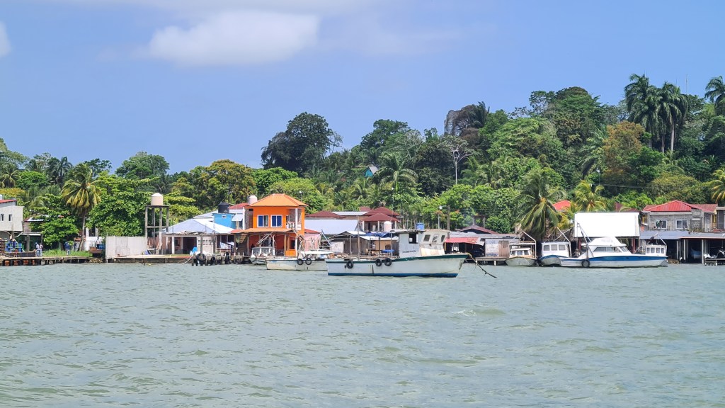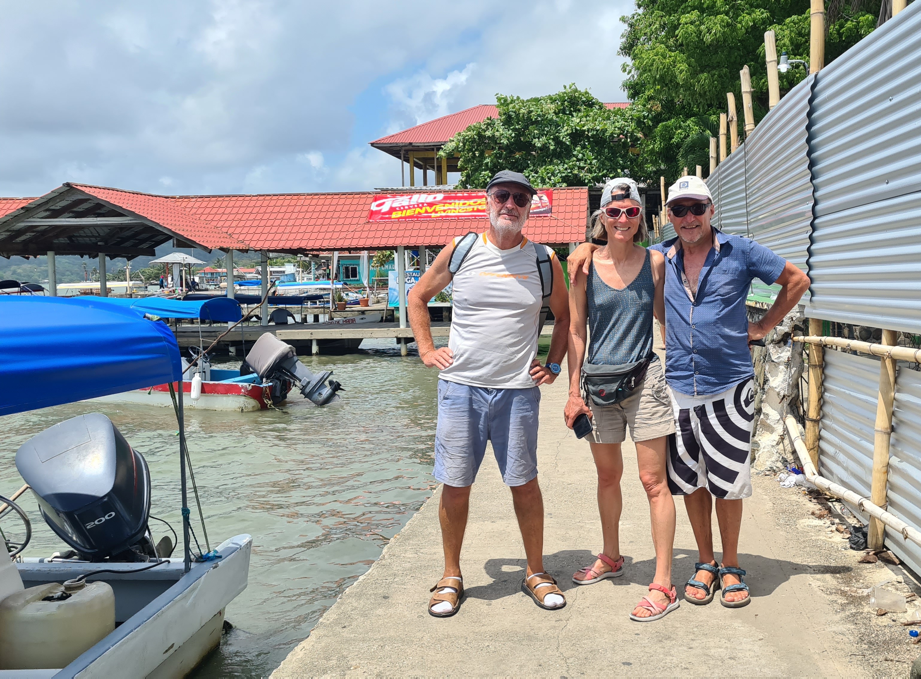 Livingston est bâtie au bord de l’eau et le débarcadère pullule d’embarcations en tous genres, principalement des barques allongées avec de plus ou moins gros moteurs, servant à la pêche et au transport des autochtones d’une rive à l’autre du Rio. La rue principale est très animée ; elle est bordée d’échoppes de matériels en tout genre, de locaux de restauration, de petits magasins de souvenirs ou tissus, et de marchands de fruit et légumes… Outre cette animation et cette profusion de commerces, la population aussi nous change de Cuba. La majorité est d’origine Maya plus ou moins pure, mêlée aux hispaniques et un peu de personnes d’origine Caraïbe. Les femmes portent des vêtements traditionnels qui rendent l’ambiance très colorée. Nous remontons en ville jusqu’à la banque afin de retirer de la monnaie locale pour payer nos quelques achats de produits frais, et notre « cruising permit» pour les trois premiers mois. Après avoir un peu flâné nous regagnons notre bord, non sans être passés cher Raul chercher nos papiers.