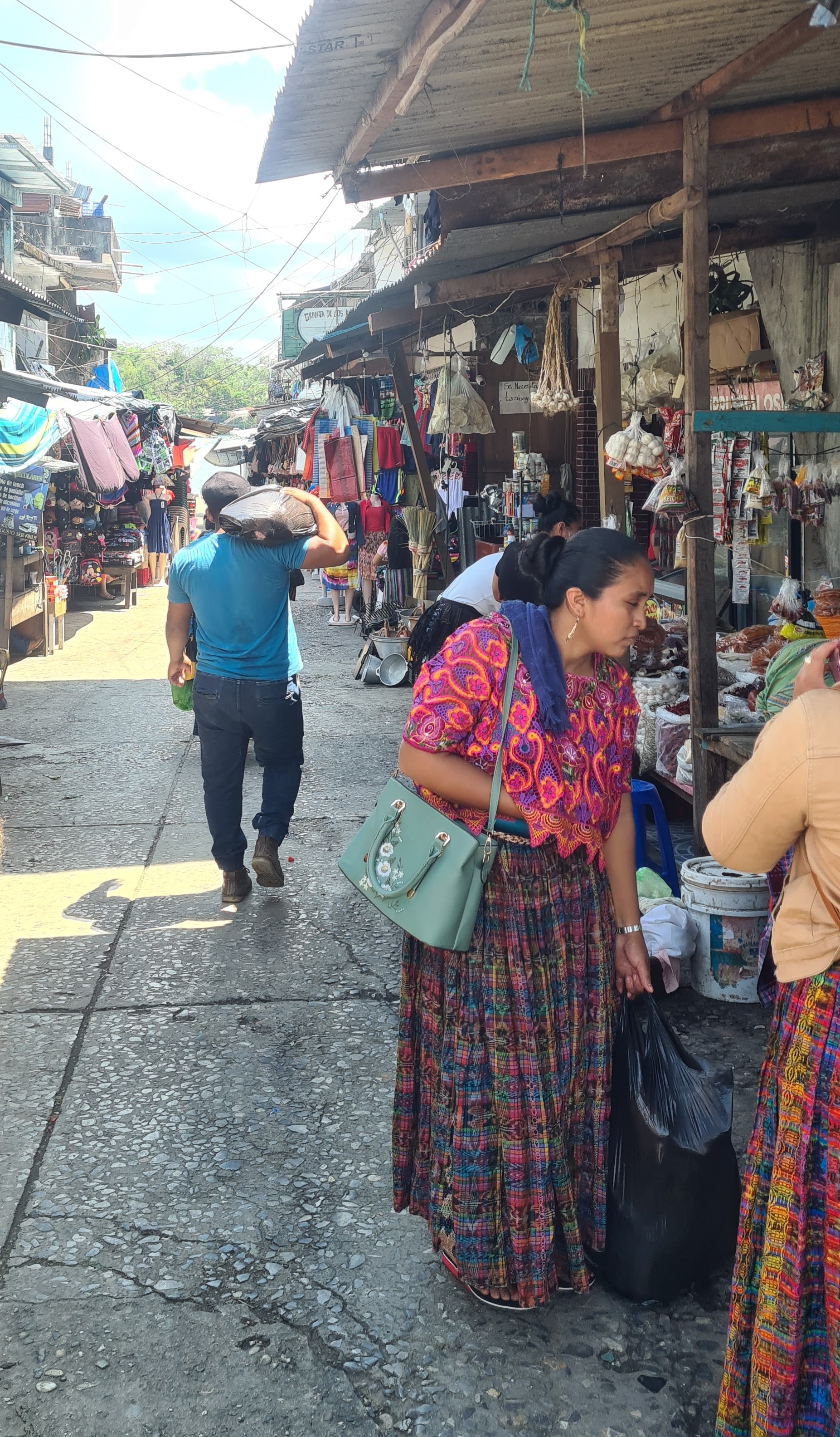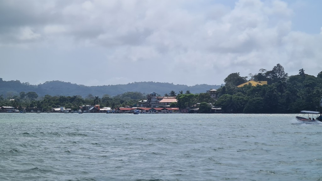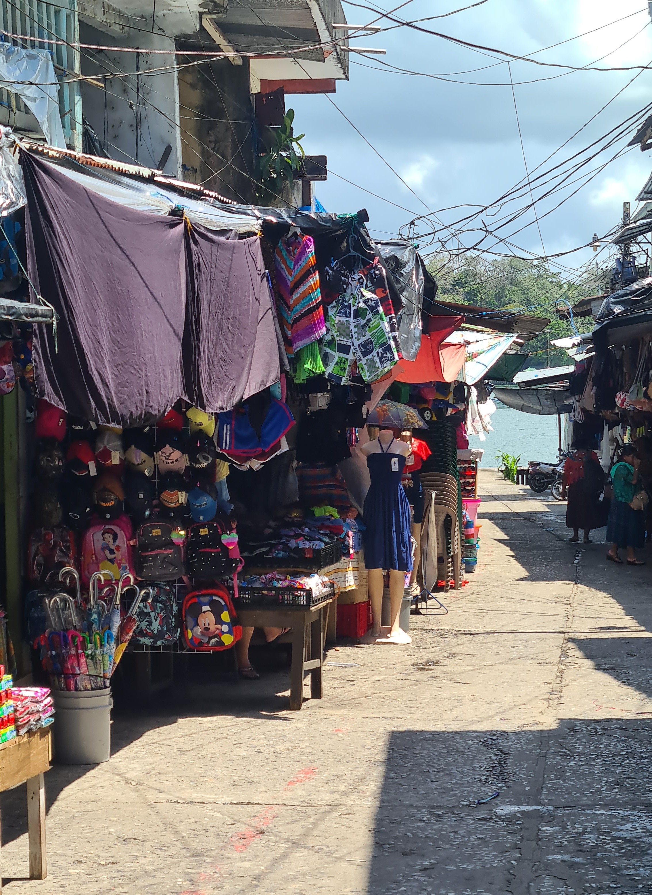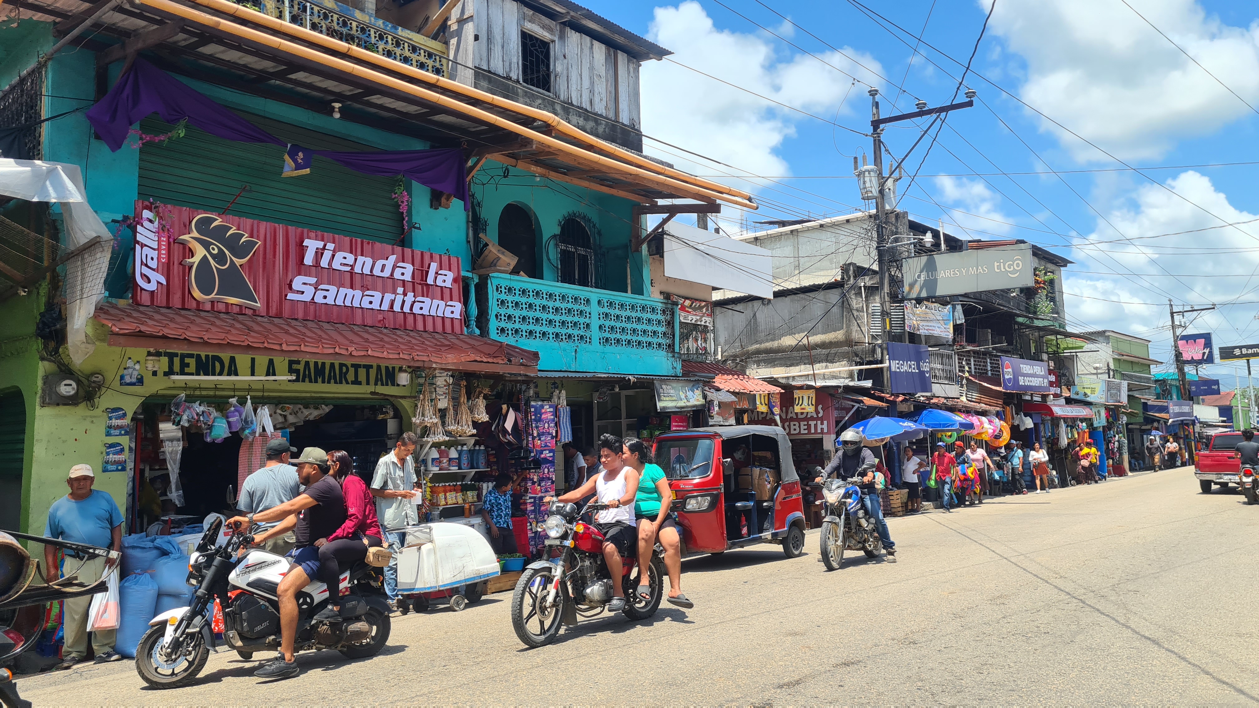 Livingston est bâtie au bord de l’eau et le débarcadère pullule d’embarcations en tous genres, principalement des barques allongées avec de plus ou moins gros moteurs, servant à la pêche et au transport des autochtones d’une rive à l’autre du Rio. La rue principale est très animée ; elle est bordée d’échoppes de matériels en tout genre, de locaux de restauration, de petits magasins de souvenirs ou tissus, et de marchands de fruit et légumes… Outre cette animation et cette profusion de commerces, la population aussi nous change de Cuba. La majorité est d’origine Maya plus ou moins pure, mêlée aux hispaniques et un peu de personnes d’origine Caraïbe. Les femmes portent des vêtements traditionnels qui rendent l’ambiance très colorée. Nous remontons en ville jusqu’à la banque afin de retirer de la monnaie locale pour payer nos quelques achats de produits frais, et notre « cruising permit» pour les trois premiers mois. Après avoir un peu flâné nous regagnons notre bord, non sans être passés cher Raul chercher nos papiers.
