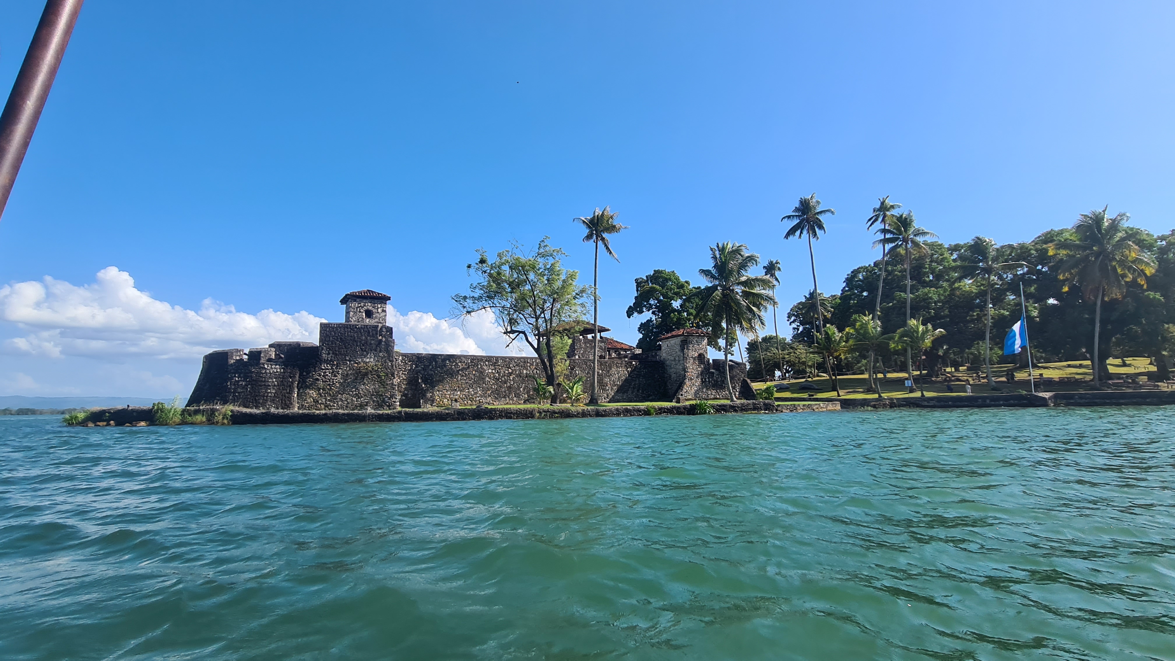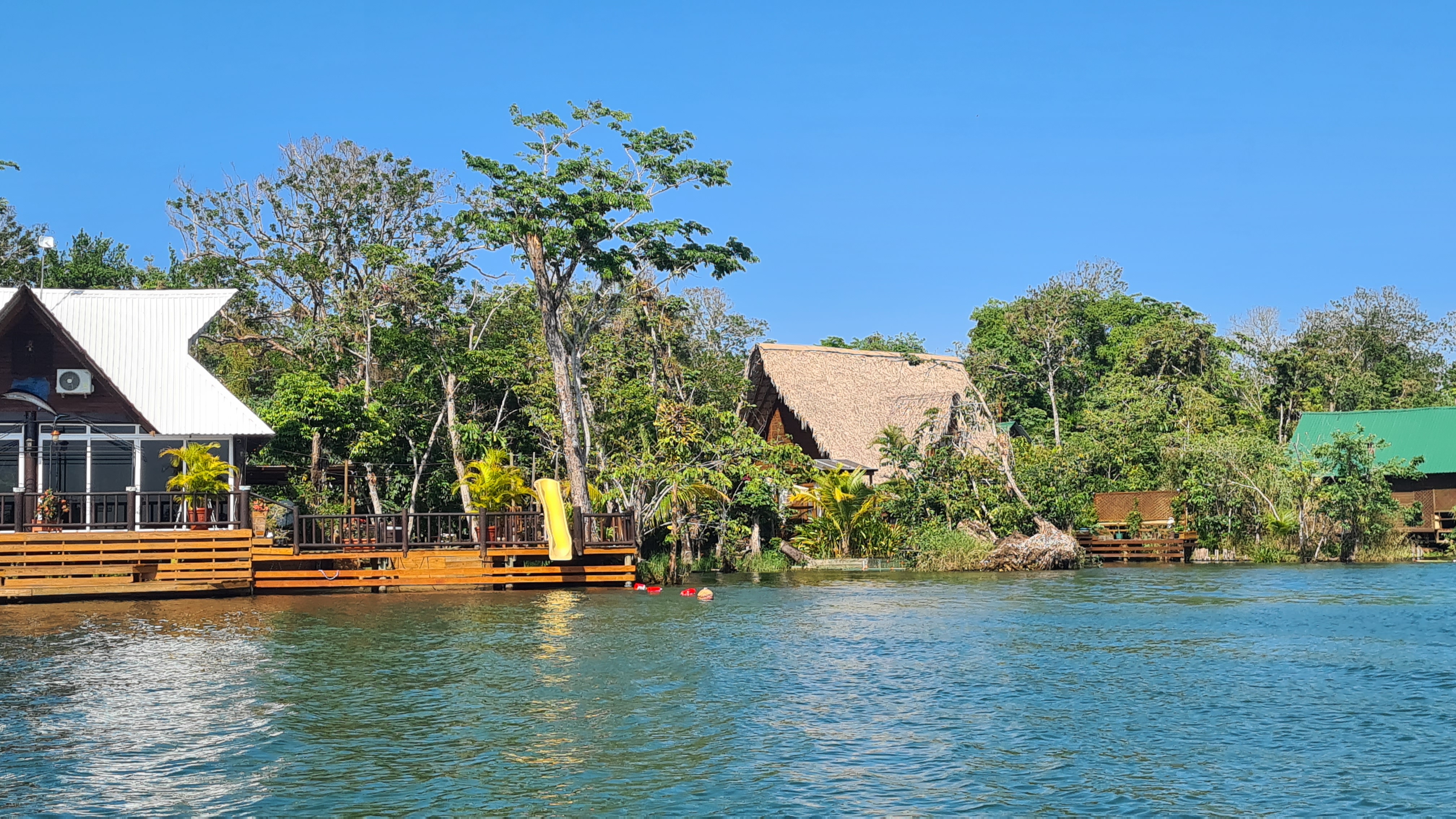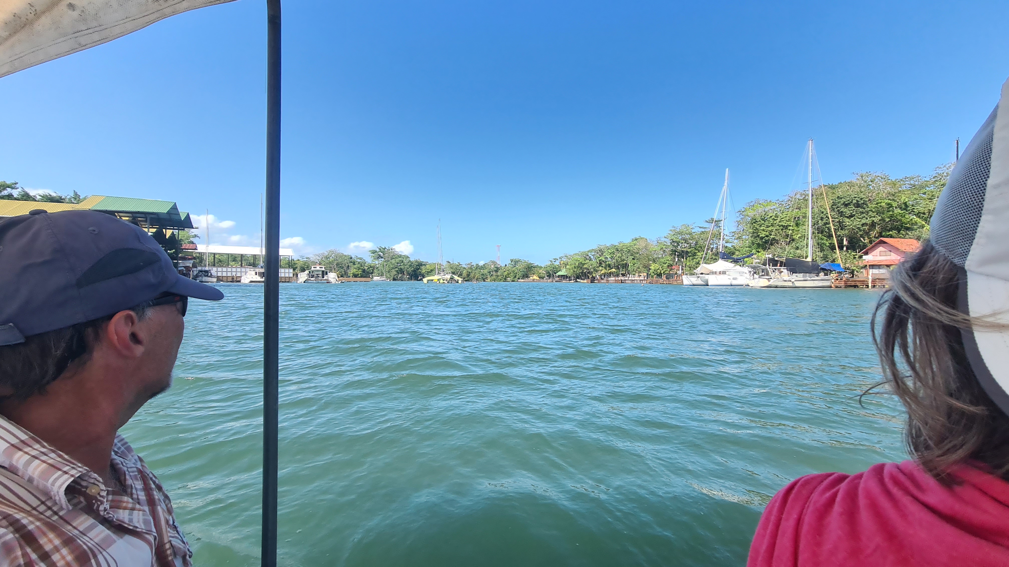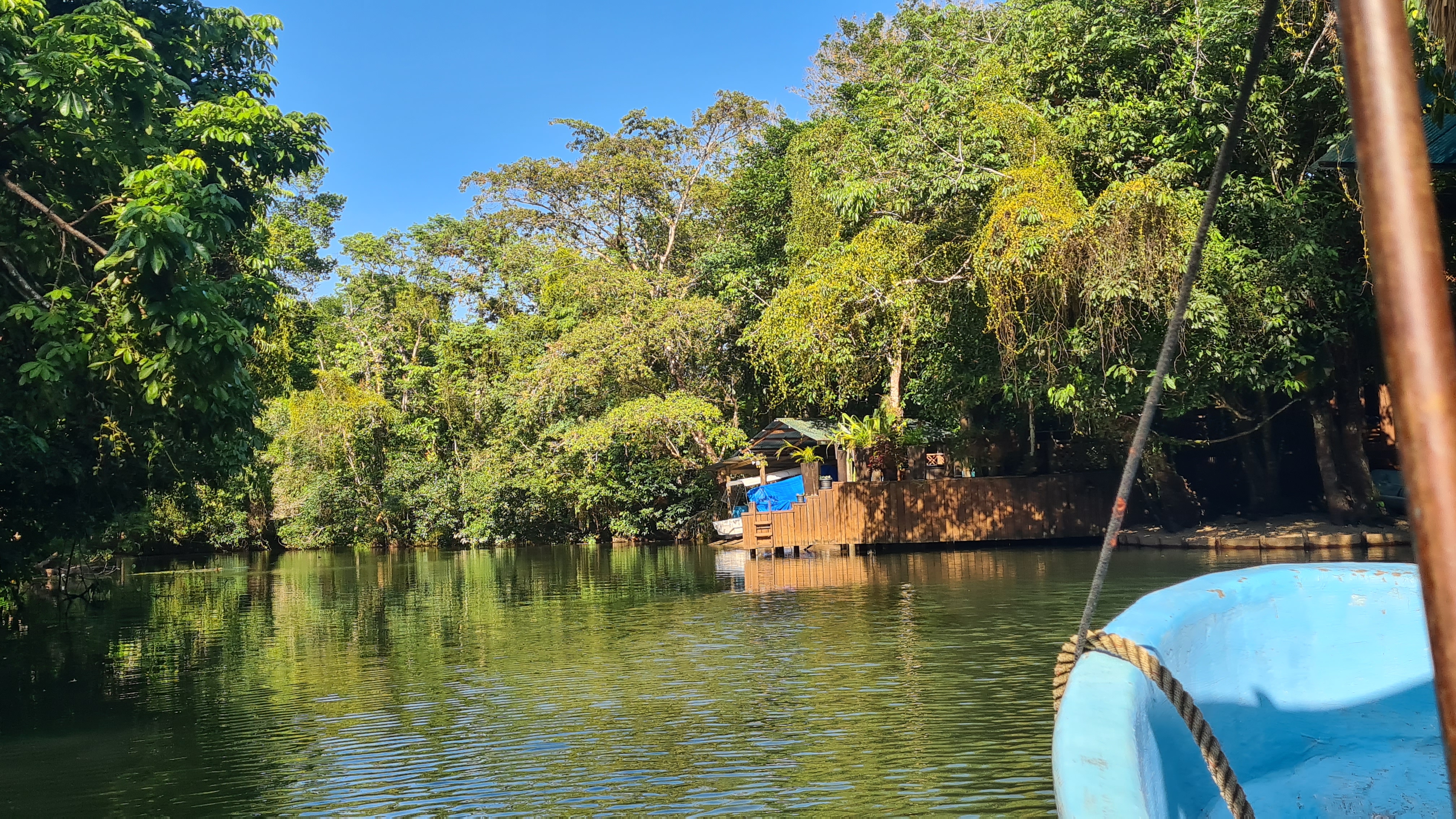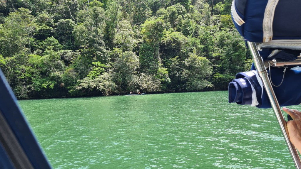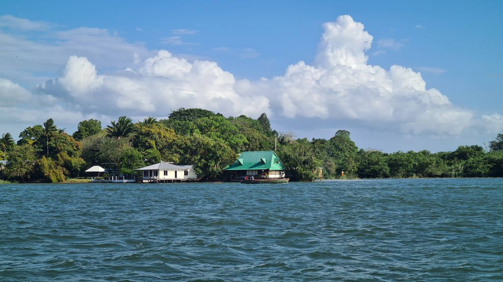 Vers midi nous pouvons remonter l’ancre et entamer la remontée du Rio Dulce. Les premiers milles se font en s’enfonçant dans une rivière profonde mais assez peu large qui serpente au sein de la forêt tropicale dense. On entend de stridents cris d’oiseau ? d’insectes ? Au troisième méandre nous apprécions encore notre dériveur, nous étant fourvoyés sur le côté de la rive à longer. Le fond remonte brusquement et nous devons nous déséchouer en remontant dérive et safran.