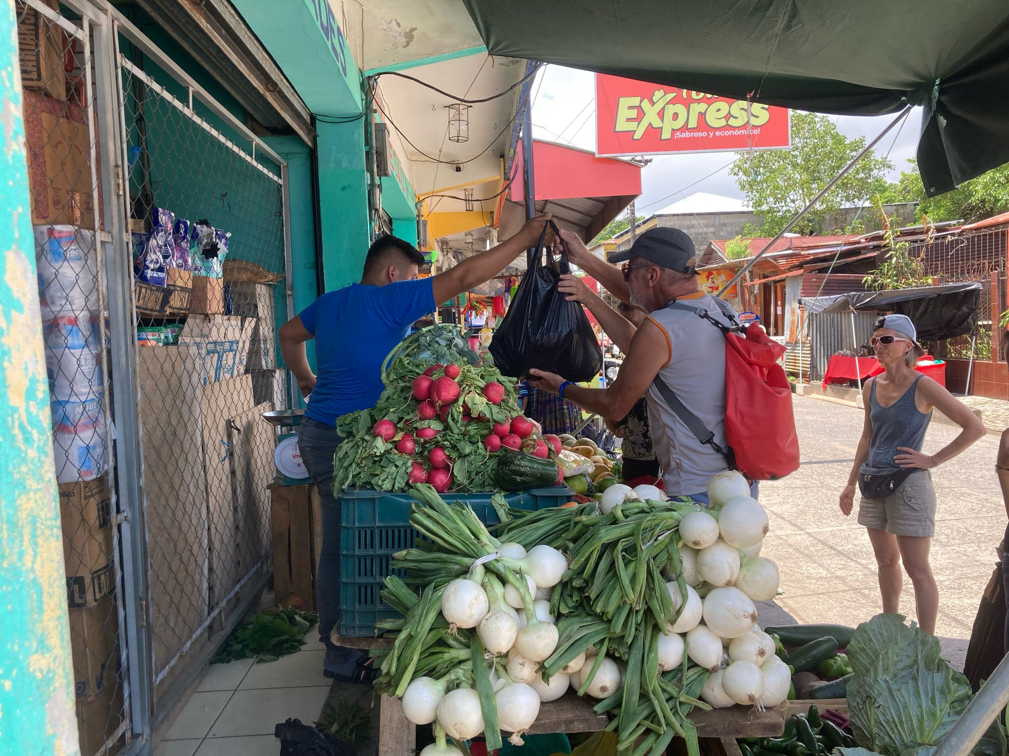 Nous apprécions de retrouver la civilisation avec de l’approvisionnement à foison, des restaurants et des bars… Nous négocions le lendemain un aller-retour en bateau taxi afin de rejoindre Rio Dulce. La ville se trouve au pied du pont qui traverse la rivière, sur l’autre rive. Cette ville agitée est située de part et d’autre d’une route très fréquentée, notamment par d’énorme poids lourds à l’américaine. Il n’y a pas de trottoir et il faut être prudent. De part et d’autre toutes sortes de magasins fournissent tout ce dont on peut avoir besoin. Nous trouvons facilement la station de bus Litegua qui fait la liaison avec Guatemala City à 300 km d’ici. Nous réservons nos places pour le retour, le bus qui nous a été conseillé part à minuit, le surlendemain jeudi pour Jean-Marc et Silvia et mardi prochain pour nous.