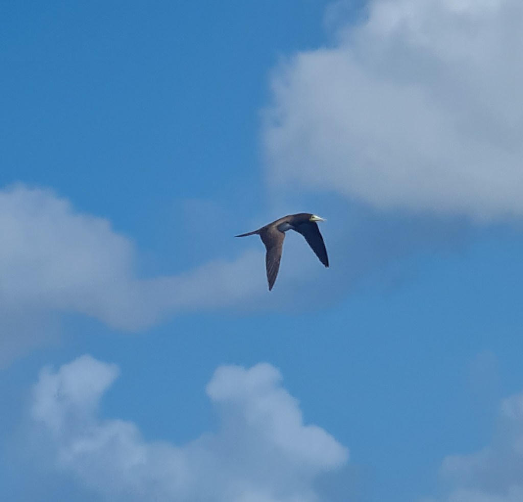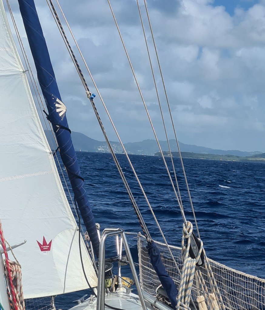 Nous quittons assez vite l’abri de l’île pour nous prendre de plein fouet l’alizé qui souffle entre 25 et 30 nœuds ce matin. Je tremble pour notre grand-voile ! Et peu de temps après avoir pris notre second ris, une couture commence à lâcher, suivie par de belles déchirures dans les lés supérieurs complètement cuits par leur longue exposition au soleil, et achevés par un stockage de 8 mois lors du dernier été tropical. Elle n’aura pas tenu une dernière saison !