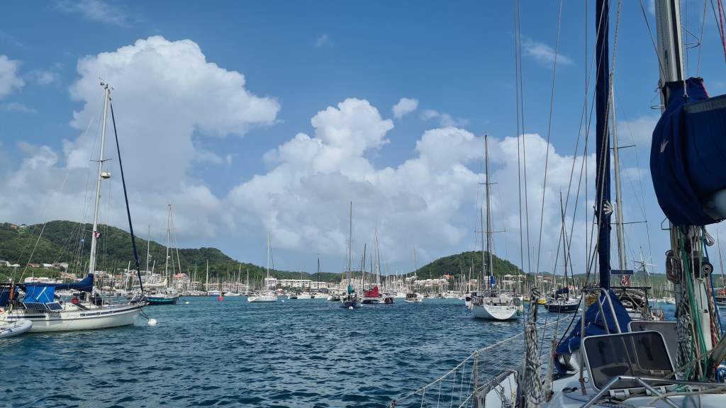 La traversée dans le canal de Sainte-Lucie est remuante mais agréable dans l’ensemble. Nous n’avons pas besoin de faire un près trop serré et Free Vikings avance bien avec son Solent et un ris dans la grand-voile. Nous nous présentons vers midi à la marina du Marin où nous avons réservé une bouée. Il nous faut attendre un demie heure avant que l’on nous place à cause de l’affluence. Apparemment nous nous en tirons bien. Nos copains Ecossais avaient attendu deux heures à leur arrivée de transat !