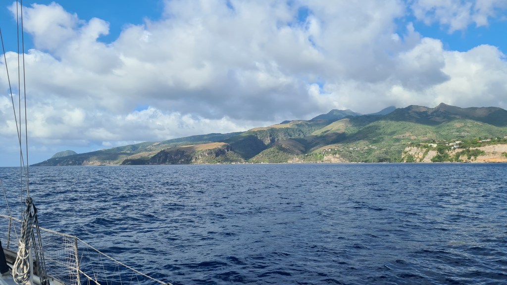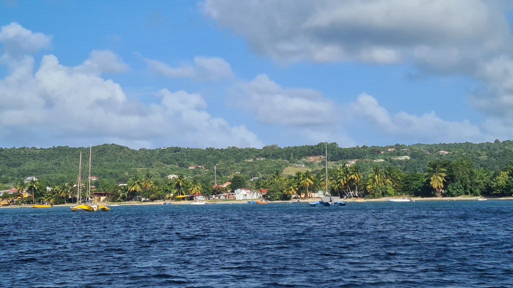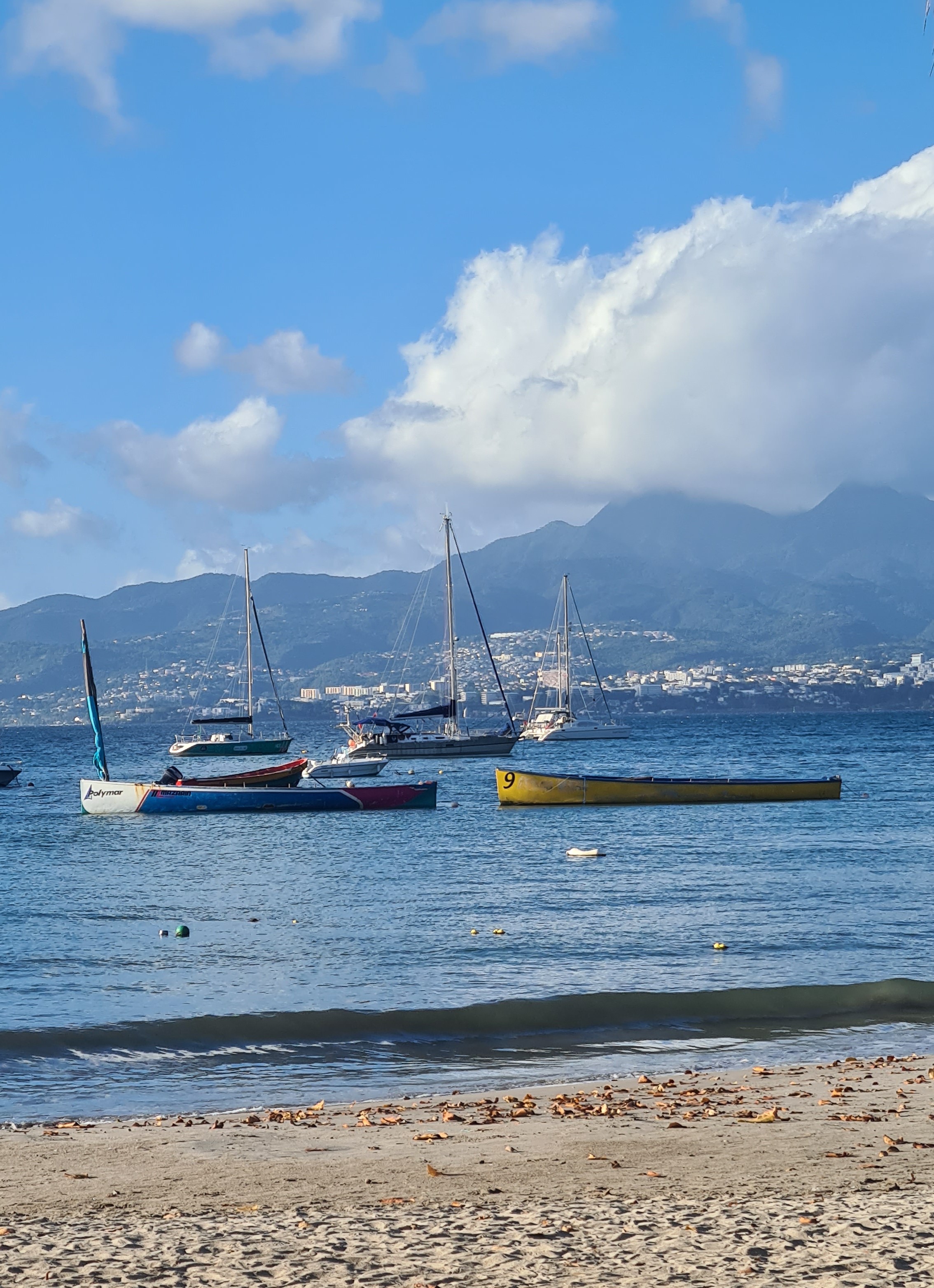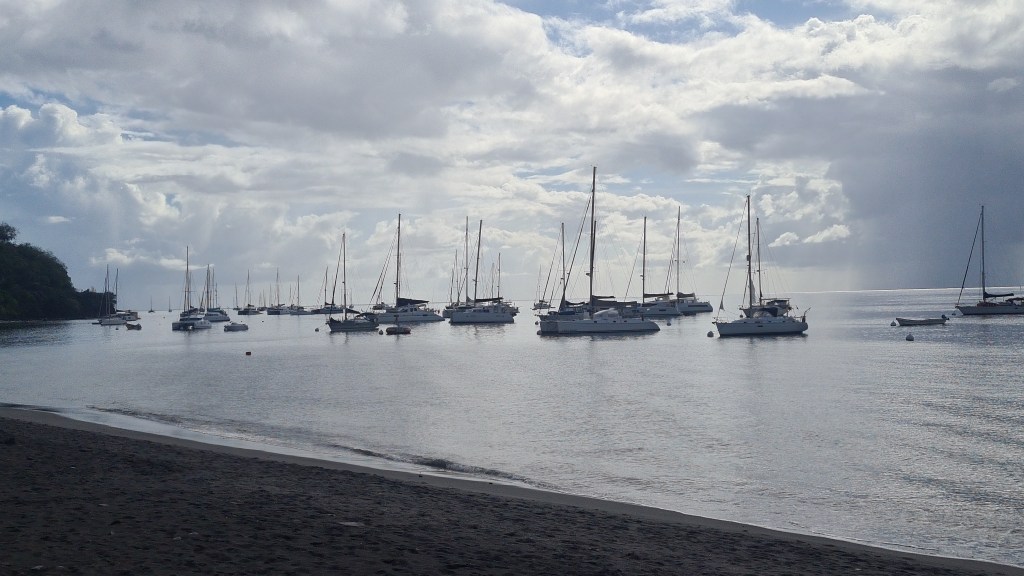 Le 8 février, nous levons l’ancre pour longer la côte martiniquaise vers le Nord et aller prendre une bouée à Saint Pierre. Ce mouillage était, il y a 6 ans, assez encombré, et il était difficile de trouver une place si on arrivait tard le soir, car bien que la baie soit très large et ouverte, la profondeur devient très vite trop importante pour mouiller si on s’éloigne de la rive. La zone est maintenant aménagée avec des bouées payantes, bien sûr, que l’on réserve quelques jours avant son arrivée et une capitainerie s’est installée. On y est très bien accueilli, on n’a plus le stress de savoir où mouiller, on peut tranquillement faire sa clearance de départ, mais évidemment ça se paye (pas trop cher !). Les clearances d’arrivée et de départ, déclarations douanières, sont obligatoires à chaque changement de pays, donc quasiment à chaque changement d’île aux Caraïbes. Dans les Antilles françaises cette clearance se fait maintenant sur un site internet accessible sur son téléphone, mais il faut faire imprimer le document dans une capitainerie et y apposer un tampon.