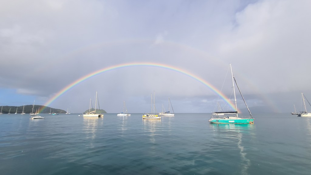 Après quelques courses de produits français et lessives, nous ne nous attardons pas dans ce lieu un peu trop agité pour nous, et larguons les amarres, deux jours après pour rejoindre l’anse à l’âne où Jean Michel a sa maison. Nous passons 4 jours au mouillage légèrement rouleur de cette belle anse qui a gardé, elle, son charme. Nous bricolons, bullons, nageons, profitons de nos amis entre repas à bord ou dans la maison de Jean-Michel, ou balade à Sainte Luce. L’anse à l’âne s’ouvre vers le Nord sur la baie de Fort de France et il n’est pas rare d’y observer de magnifiques arcs en ciel après un grain.