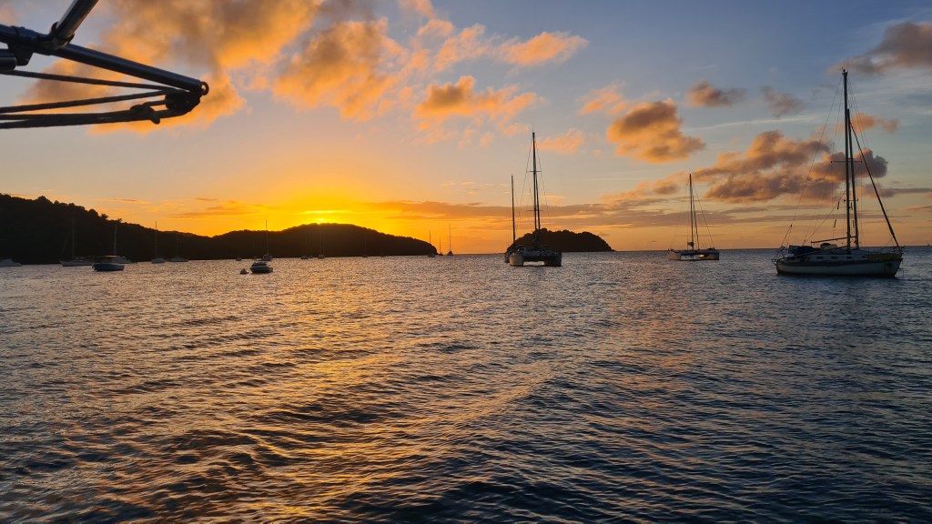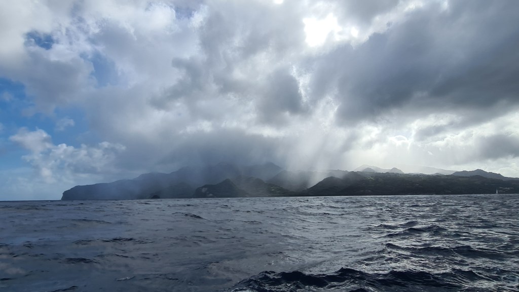 Nous reprenons notre route le lendemain pour affronter le canal de la Dominique au Nord de la Martinique. Nous passons trois heures à nous faire secouer car les alizés sont bien virulents. Le bateau avance bien au près bon plein et nous rejoignons l’abri de l’île avec soulagement. Nous longeons cette belle île que nous avions bien apprécié il y a 6 ans, pour aller poser notre ancre juste avant le coucher du soleil au fond de la baie de Portsmouth au Nord de l’île. Nous y passons une nuit bien ventée avant de repartir peu après le lever du soleil toujours vers le Nord.