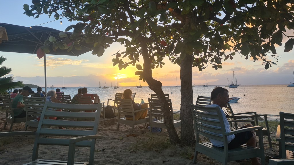 La marina du Marin, déjà très fréquentée en 2019, bat des records d’affluence. Entre les voyageurs qui choisissent ce lieu bien équipé en accastillage, chantiers, magasins divers et variés, pour refaire le plein ou des réparations, et les très nombreuses sociétés de location qui n’ont jamais aussi bien marché ; le nombre de bateaux sur place semble avoir encore augmenté. C’est un peu fou ! Nous retrouvons avec plaisir cette marina cosmopolite, bien qu’avec un petit regret : le Kokoarum, notre bar préféré, ouvert jadis toute la journée, où trainait toute une bande de zonards locaux, n’est plus ouvert que pour les repas et c’est un peu l’usine. Endroit de charme perdu ! Nous retrouvons avec plaisir, notre ami Jean-Michel et sa compagne Françoise en Martinique pour l’hiver, qui viennent passer une soirée avec nous.