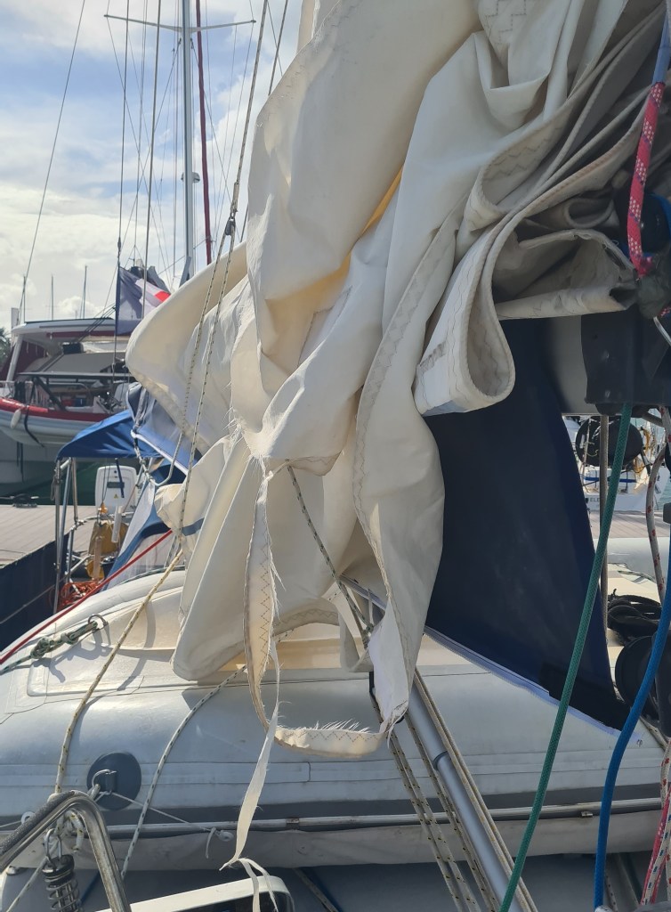 Deux des voileries sont des marques connues qui envoient toutes les données en Europe et reçoivent ensuite une voile toute faite par avion ou bateau, et ils demandent minimum 6 semaines de délai. Et il y a Tony, artisan voilier local, qui nous promet un délai de 4 à 5 semaines. Il est extrêmement réactif, en début d’après-midi il nous fournit un premier devis, et il est à bord pour prendre les mesures, Nous avons un très bon contact. La voile est démontée et marché est conclus avec Tony. Il fait un dessin l’envoie à un confrère à La Rochelle qui découpe les lés au laser, les expédie par avion et Tony les assemble et ajoute tous les accessoires. Espérons que tout se goupille bien !