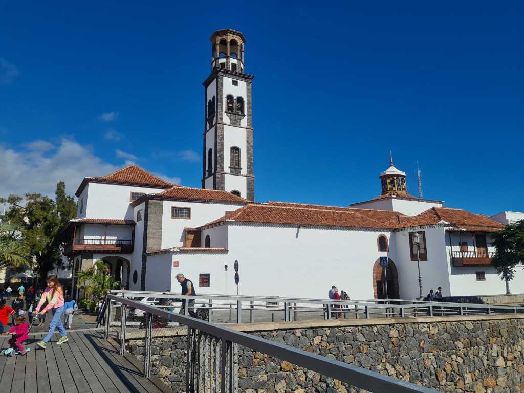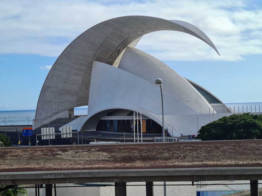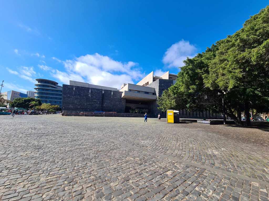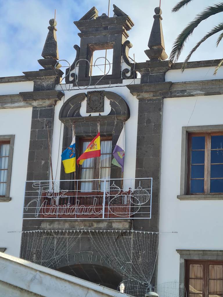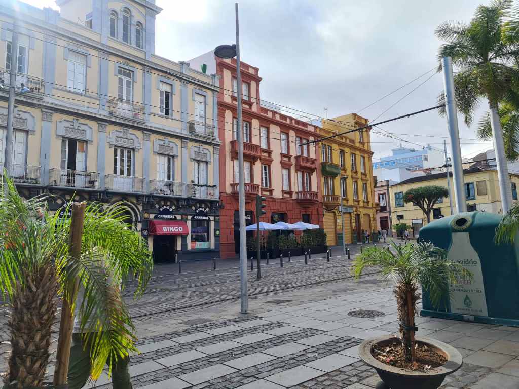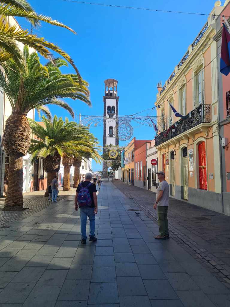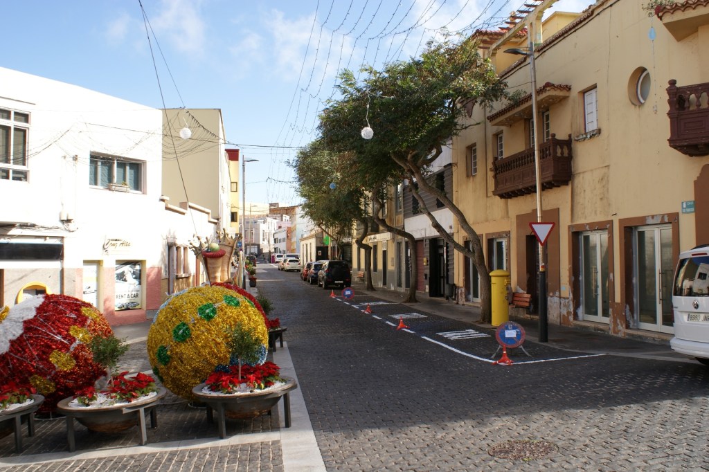 Cette ville est très animée, il s’y mêle un modernisme bruyant parfois exacerbé, illustré par la salle de spectacle ; et une ambiance désuète et plus calme dans le quartier ancien. Nous sortons de la gare routière où nous avons laissé la voiture pour plonger dans une agitation et une circulation digne de nos grandes villes, avec ses magasins typiquement occidentaux. La végétation nous rappelle néanmoins que l’on se trouve dans une région subtropicale. Le marché est typiquement canarien avec ses étals alimentaires, de babioles à touristes et de restauration. Les décorations de Noël encore présentes y ajoutent un air festif. C’est jour de brocante en ville, nous parcourons les très abondants étals qui nous rappellent nos propres marchés aux puces. Nous rejoignons la vieille ville où nous retrouvons l’architecture typique des villes des Canaries avec par exemple ces belles fenêtres et portes en bois. Nous fêtons nos 35 ans de mariage au restaurant dans un rue piétonne plus calme, puis nous reprenons le chemin de la marina dans l’après-midi après une halte sur une plage cachée derrière une zone commerciale. Mais déception, nous ne nous baignerons pas : non seulement le sable est tout noir mais tellement caillouteux que nous renonçons.