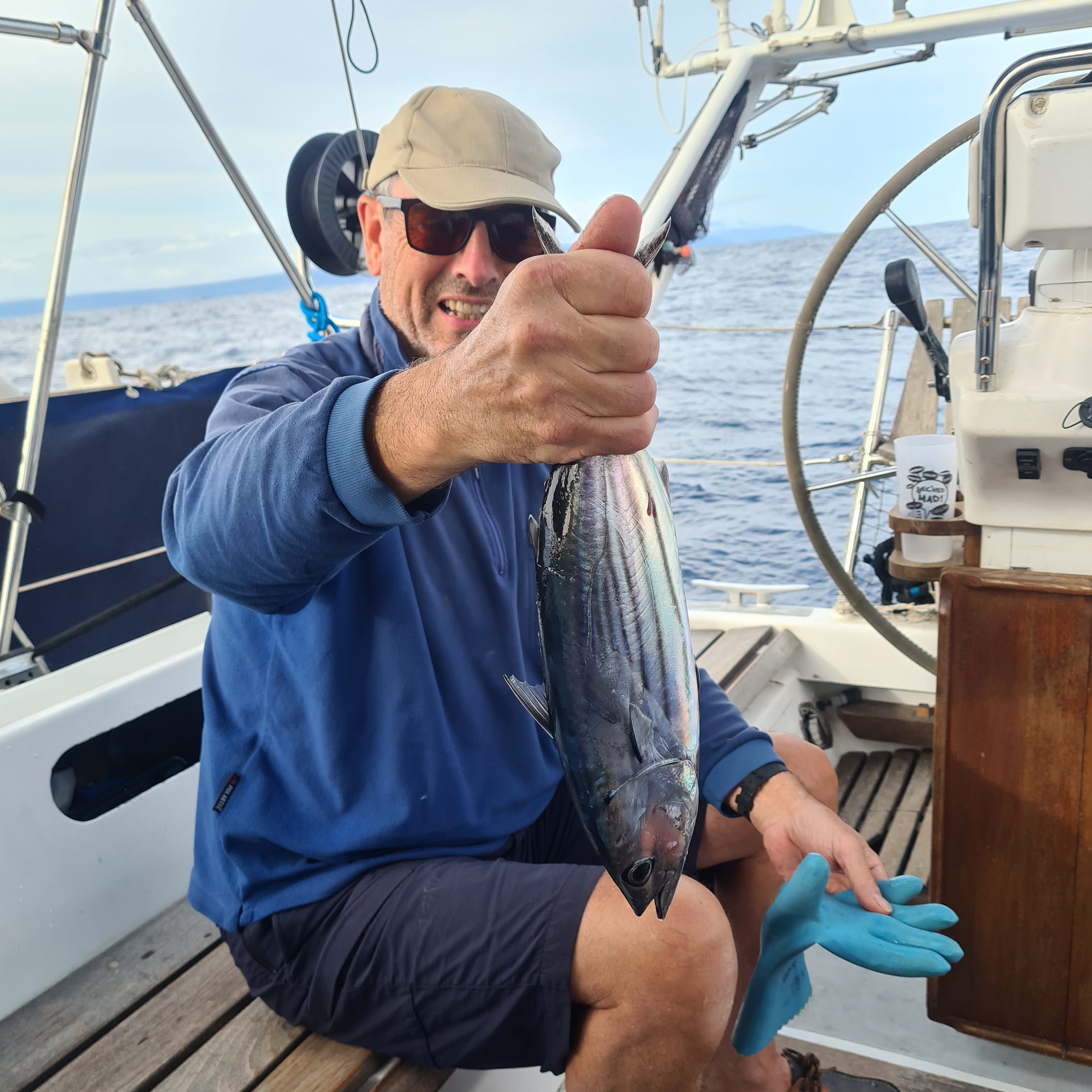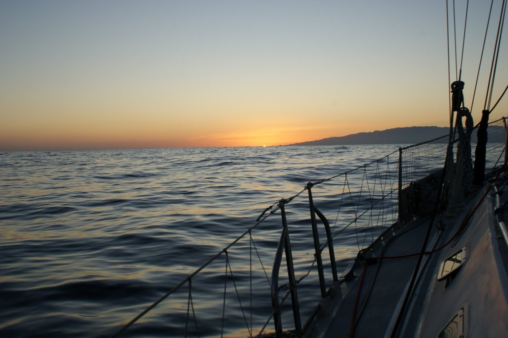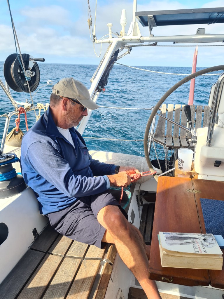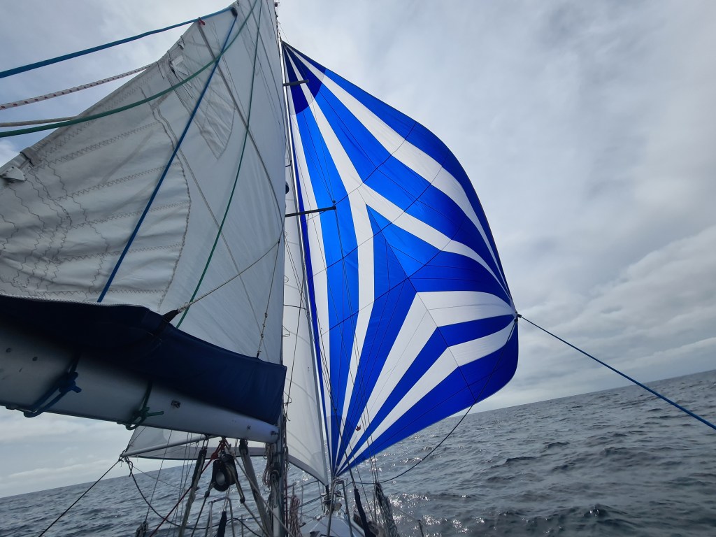 Et effectivement pendant trois jours nous alternons les phases de moteur et de voile avec le moindre souffle de vent qui se lève, et nous permet d’avancer avec efficacité vers le Sud, pas forcément au cap exact mais nous gagnons doucement vers le Sud. Puis le 17 au matin le vent s’oriente de secteur Nord. Nous marchons sous gennaker ou voiles en ciseaux la nuit et n’avançons pas bien vite avec cette brise, mais enfin sous voile. La nuit du 19 janvier un soudain coup de vent de secteur Nord toujours, avec des rafales à 30 nœuds amène tout le monde sur le pont à 4 heures du matin. Il faut enrouler le génois prendre un ris et surtout amener le gennaker probablement mal enroulé qui commence à se dérouler. Il s’enroule autour de l’étai lors de la manœuvre tout est bloqué. Nous continuons ainsi jusqu’au lever du jour, en maintenant la voile à l’abri de la grand-voile pour éviter de l’endommager et de trop secouer le gréement. Alors le vent s‘étant un peu calmé et malgré les vagues qui nous chahutent pas mal, la mer s’étant levée avec le vent, nous parvenons à récupérer le gennaker et le ranger dans son sac. Ouf ! Un bon vent de 20 nœuds puis 15 se maintient encore deux jours et nous restons sous seule grand-voile la nuit et parfois aussi dans la journée quand ça avance trop vite, afin d’arriver de jour à Dakar.
