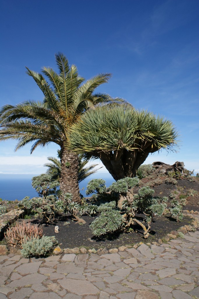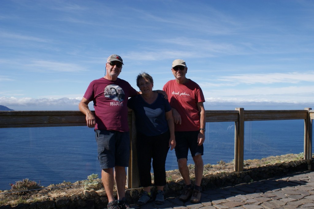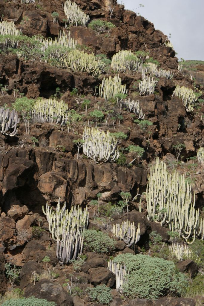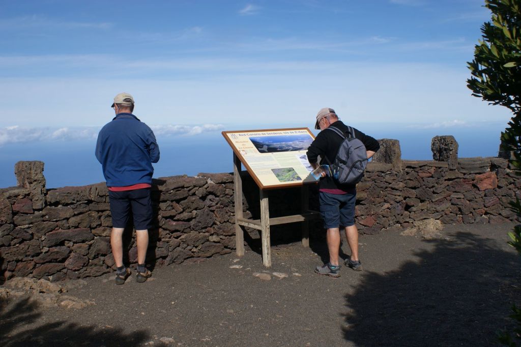 En altitude, à plus de 1000 mètres (le point culminant est à 1500 m), on trouve une forêt primaire dense. De nombreux chemins de randonnées permettent de visiter les divers Miradores qui surplombent les nombreux cratères ou les falaises abruptes d’El Golfo. Nous nous y dégourdissons les jambes. En redescendant des hauteurs de l’île vers le Sud, on traverse une belle forêt de pins ; après la traversée du petit village de El Pinar, on arrive sur une immense coulée de lave complétement inculte, grise ou marron et minérale. A l’extrême sud de l’île le village de La Restinga abrite un centre de plongée, un port de pêche et une petite station balnéaire. Nous y déjeunons sur le port de spécialités locales. Au cours de ce déjeuner nous assistons à un retour du bateau de sauvetage qui ramène une chaloupe de migrants. Ils sont débarqués sous bonne escorte sur le quai où est aménagée une tente d’accueil, signe que c’est pratique courante. Les Canaries sont un lieu d’entrée dans l’UE très proche de l’Afrique et forcément attirent les tentatives de migration clandestines.