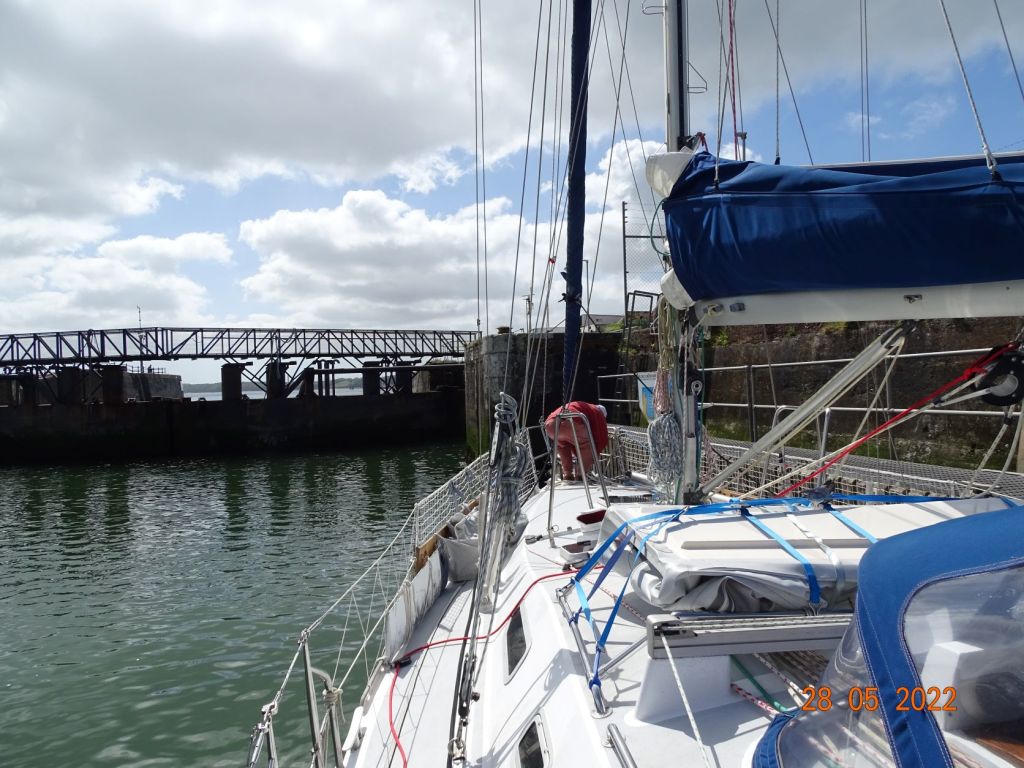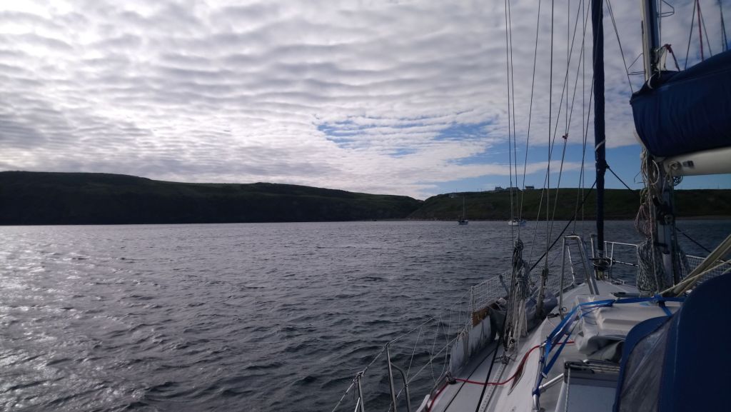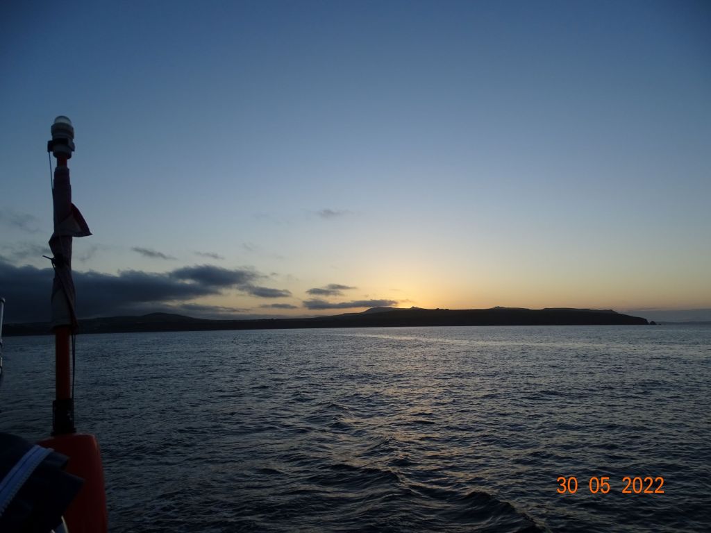 Le 24 mai nous décidons d’avancer un peu notre départ des îles Scilly afin d’arriver avant un passage un peu venté qui s’annonce sur la mer d’Irlande. Nous parcourons rapidement les 120 milles qui nous séparent de Milford Haven. Le vent et la météo sont cléments. Le vent tourne progressivement devenant de plus en plus portant. Le soleil nous accompagne, mais le vent est très froid et il faut rester à l’abri de la capote pour supporter le froid. Dans la soirée nous prenons un ris et envoyons la trinquette car le vent fraîchit ; le bateau avance bien, l’allure est confortable. Les sous-vêtements techniques bien chauds sont de rigueur pendant les quarts de nuit. Le chauffage fonctionne par intermittence à l’intérieur pour maintenir une certaine douceur.