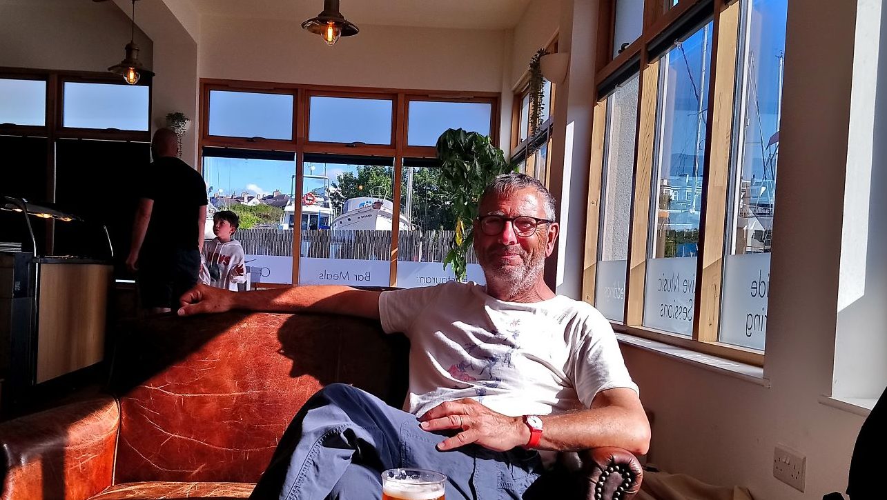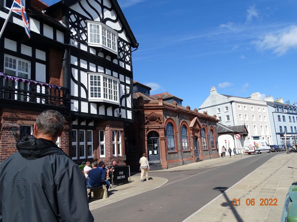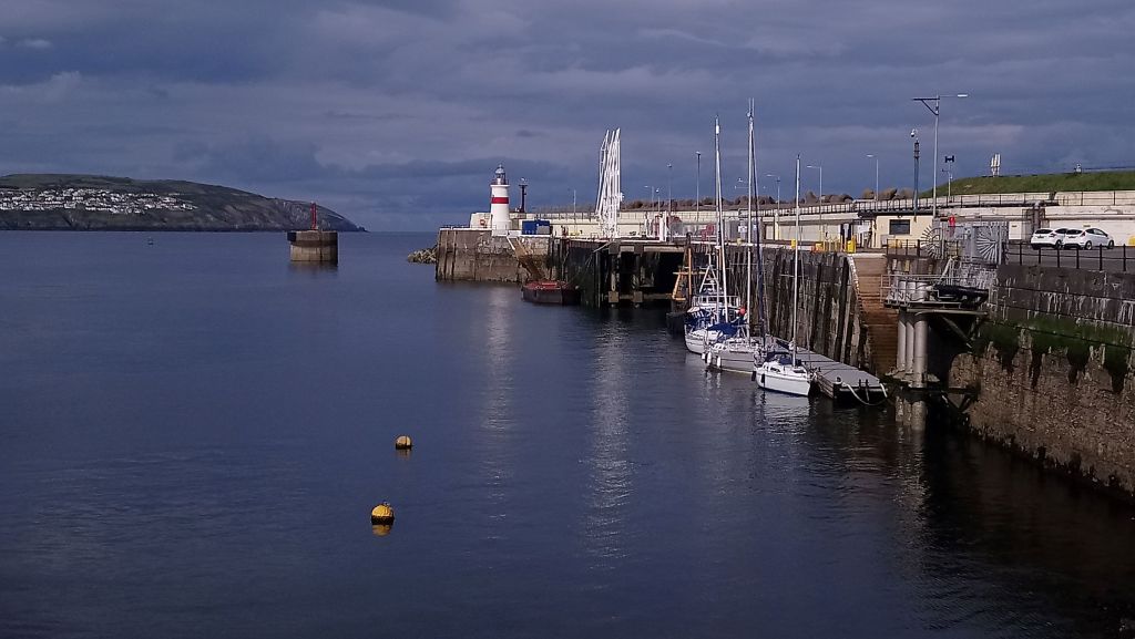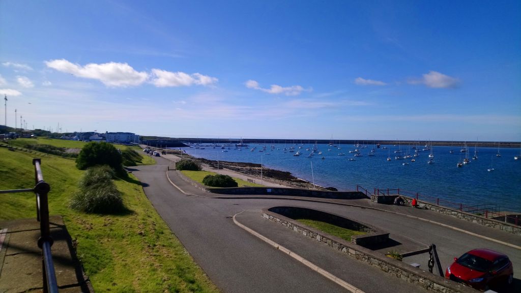 A Holy Head, au lieu de la marina que nous croyions trouver, il ne reste qu’un malheureux ponton en béton. Le reste a été emporté par la tempête « Emma » en 2019. Nous avons le temps de nous promener un peu dans la ville tout de même un peu plus gaie que Milford. C’est dimanche, les habitants sont de sortie pour une balade au soleil ou des sorties en jet ski, et se retrouvent au pub. Nous les trouvons bien peu couverts, car malgré le soleil le fond de l’air est vraiment frais.