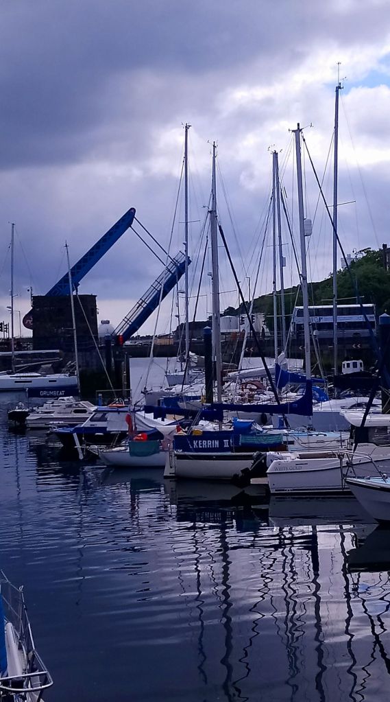 Le 30 mai, le départ pour l’île de Man est agité. Nous devons encore batailler avec ce foutu courant traversier en sortant du port et il nous faudra trois heures à nous faire secouer, pour en sortir, enfin envoyer les voiles et mettre le cap sur Douglas. La fin de traversée se fait dans une atmosphère très froide et humide mais la navigation est agréable. Nous nous amarrons au ponton d’attente car l’ouverture de la porte et du pont qui permettent d‘entrer dans la marina n’est que ce soir. Le capitaine du port, bien sympathique, nous explique que le port est saturé car c’est le Tourist Trophy, mais nous alloue une place dans un coin le long du quai.