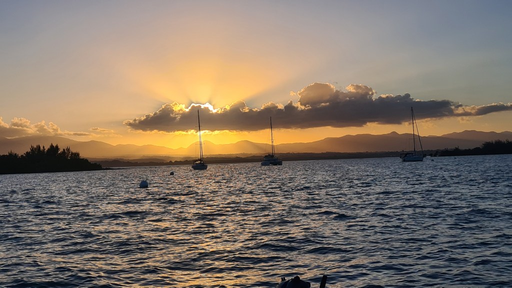 Le 1er mars nouveau départ matinal vers Marie-Galante avec des alizés qui s’établissent assez forts. Nous avons le vent à 45 degrés avec un peu de génois et un moteur qui fonctionne bien . La traversée est un peu rocky mais se passe bien et rapidement, nous arrivons au mouillage à temps pour l’apéro !