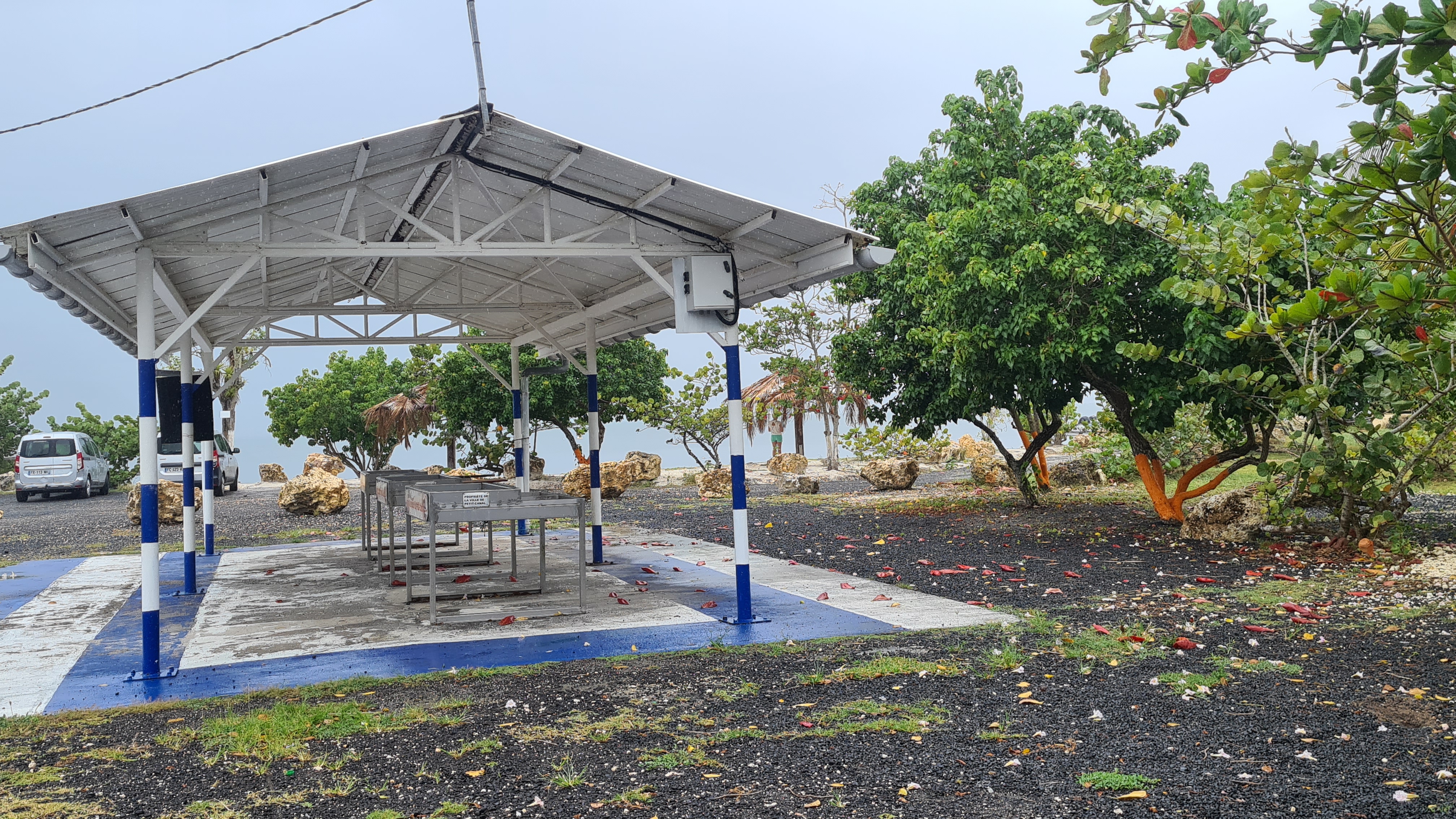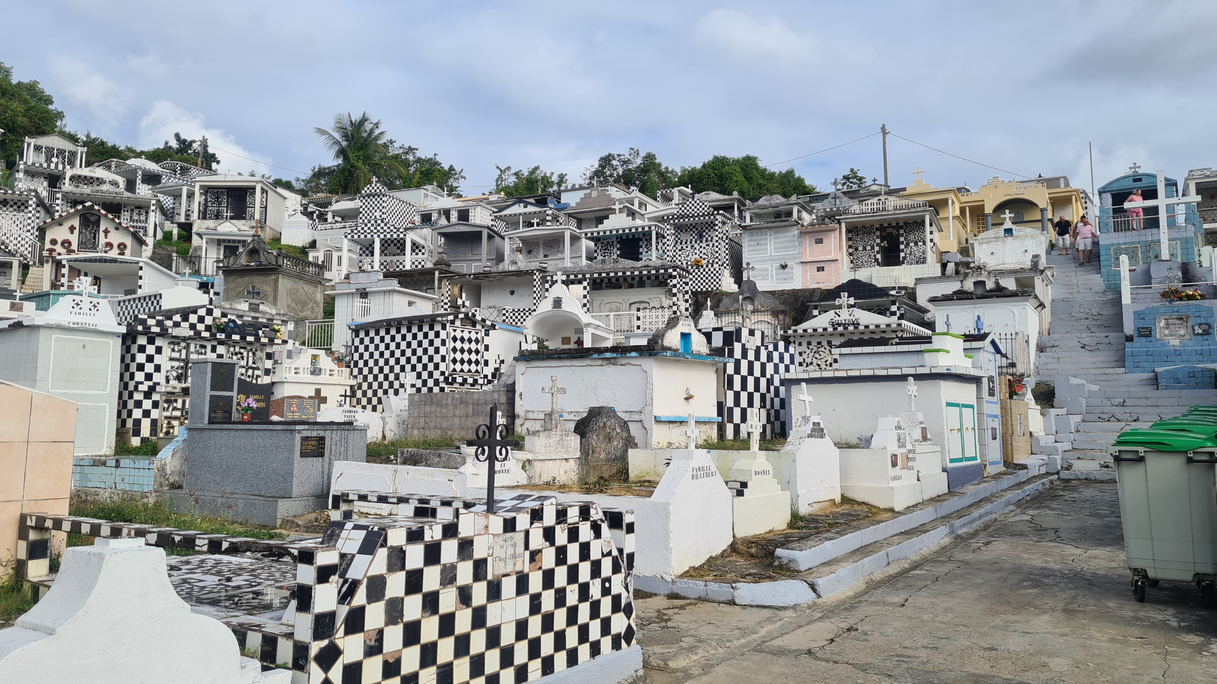 Nous prenons contact avec Françoise et Roland qui passent l’hiver dans leur appartement à Sainte-Anne. Nous passons de bons moments avec eux lors de repas à bord ou chez eux, ou des parties de baignades sur les belles plages du Sud ou à Port-Louis. Ils nous promènent en voiture au Nord de Grande-Terre où nous visitons à Petit Canal, le site en mémoire de l’esclavage près de la petite église et du joli port de pêche ; et à Morne à l’eau nous découvrons l’étonnant cimetière peuplé de tombeaux aux tailles de maisonnettes, tous quadrillés de noir et blanc. Nous découvrons Saint-François et sa jolie Marina bien abrité derrière la barrière de corail.