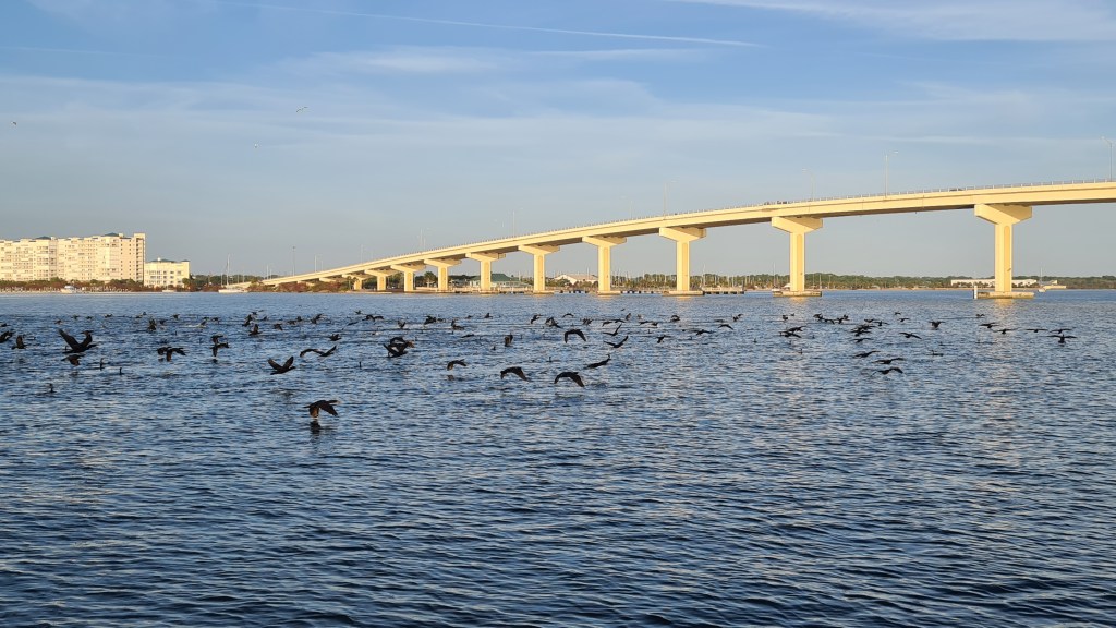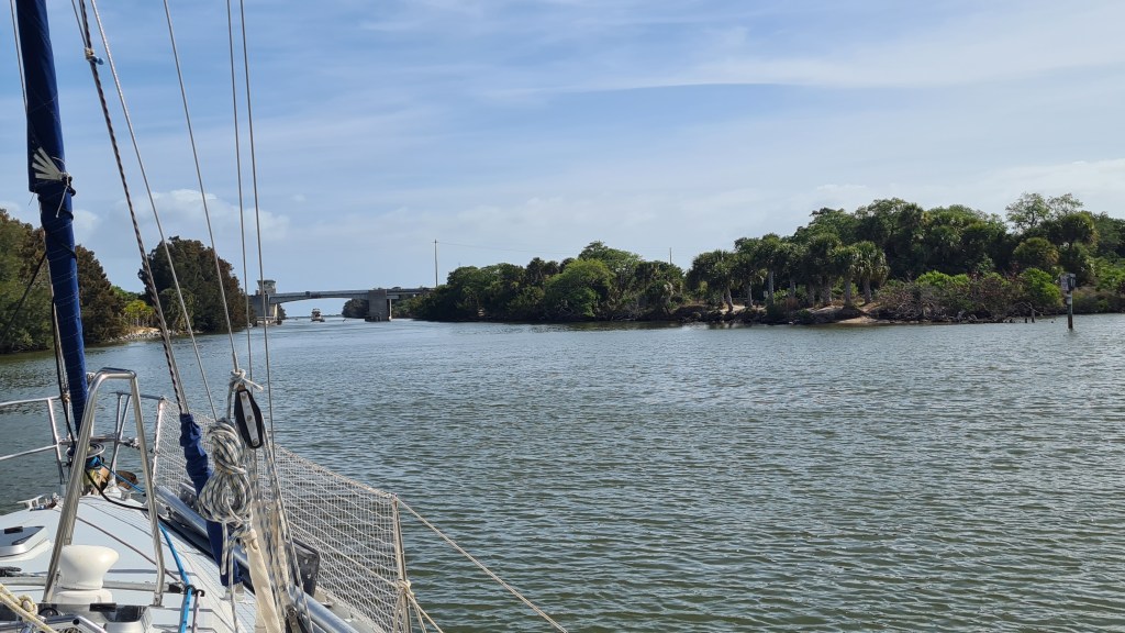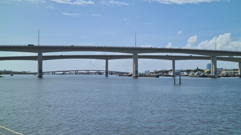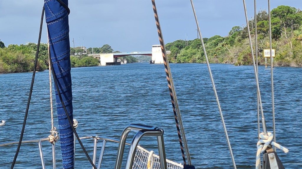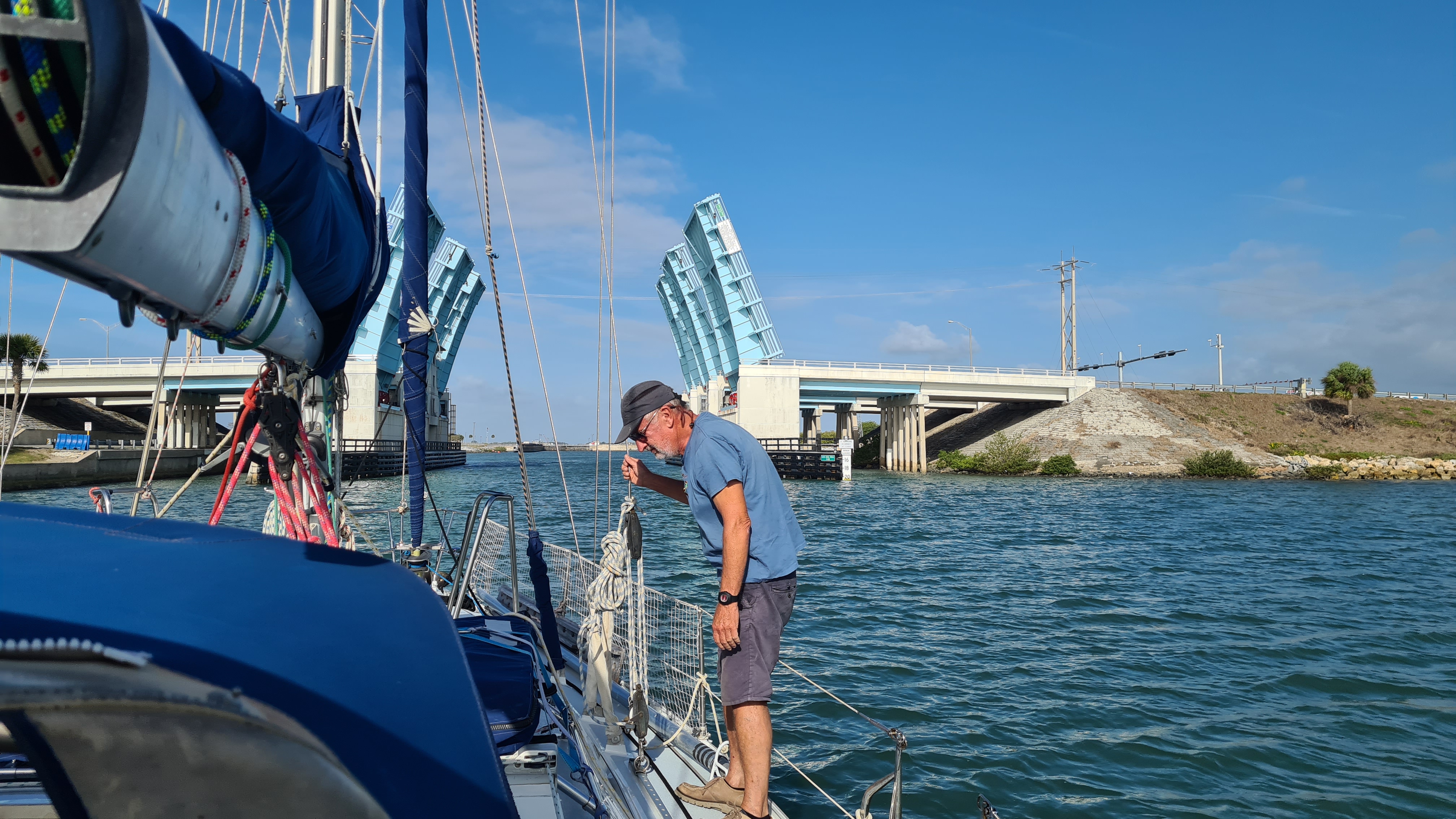 Nous passons sous de nombreux ponts qui relient ce patchwork d’iles qu’est la côte de la Floride. Le tirant d’air (hauteur sous le pont) de la plupart a la mesure standard de 65 pieds (20 mètres), ce qui permet aux gros bateaux de passer dessous, même la plupart des voiliers ; d’autres ne dépassent pas un vingtaine pieds (6 mètres) mais s’ouvrent à la demande ou à heures fixes (souvent H et H+30min). On communique avec le personnel qui manœuvre les ponts par VHF sur le canal 09 ; ce sont toujours des échanges très courtois.