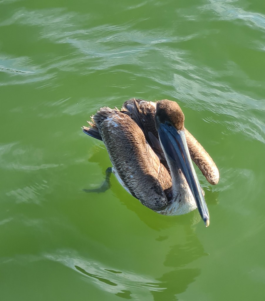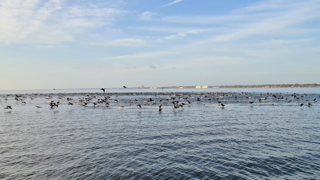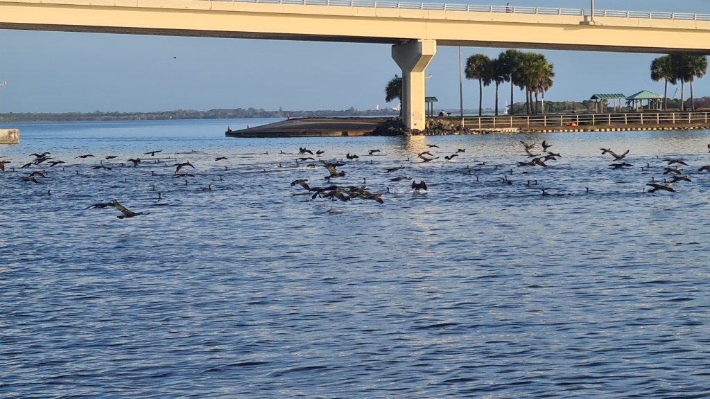 L’ICW regorge d’une faune abondante. Les oiseaux sont les plus visibles : cormorans, pélicans, les échassiers divers et variés. De nombreux lamentins vivent dans ces eaux très limoneuses, si bien qu’on ne les aperçoit que lorsqu’ils font surface pour respirer : un gros dos noir se montre rapidement à la surface et replonge aussitôt. Les dauphins sont très présents et nagent souvent autours des bateaux dans les mouillages. Il y a aussi, parait-il, des alligators, des serpents que nous n‘avons pas rencontrés, je ne m’en plains pas ! Un matin nous assistons à une chasse d’une multitude cormorans qui semblaient poursuivre un banc de poissons autour du bateau.