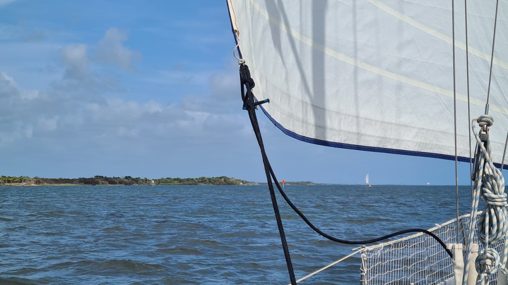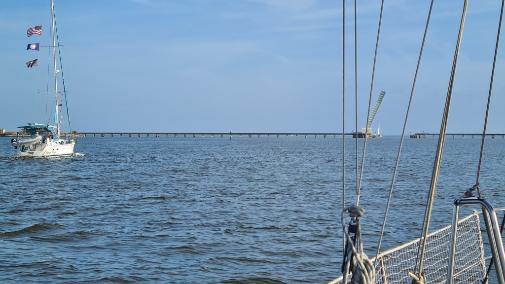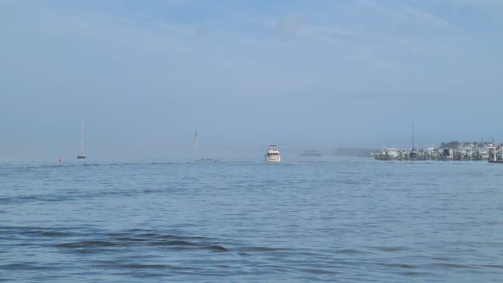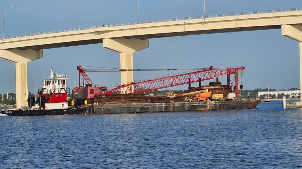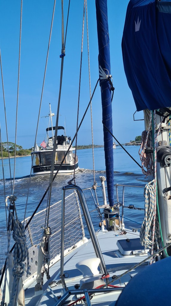La plupart du temps la navigation se fait au moteur, vu l’étroitesse du chenal. Nous naviguons tranquilement afin de pas être assourdis par le bruit du moteur et sommes doublés par de nombreux bateaux, quelques voiliers, maints trawlers (petit bateau à moteur, moitié péniche, très prisé des Americains et parfaitement adaptés à ce type de navigation), des yachts à moteur plus gros. D’énormes barges de transport commercial naviguent également sur l’ICW.