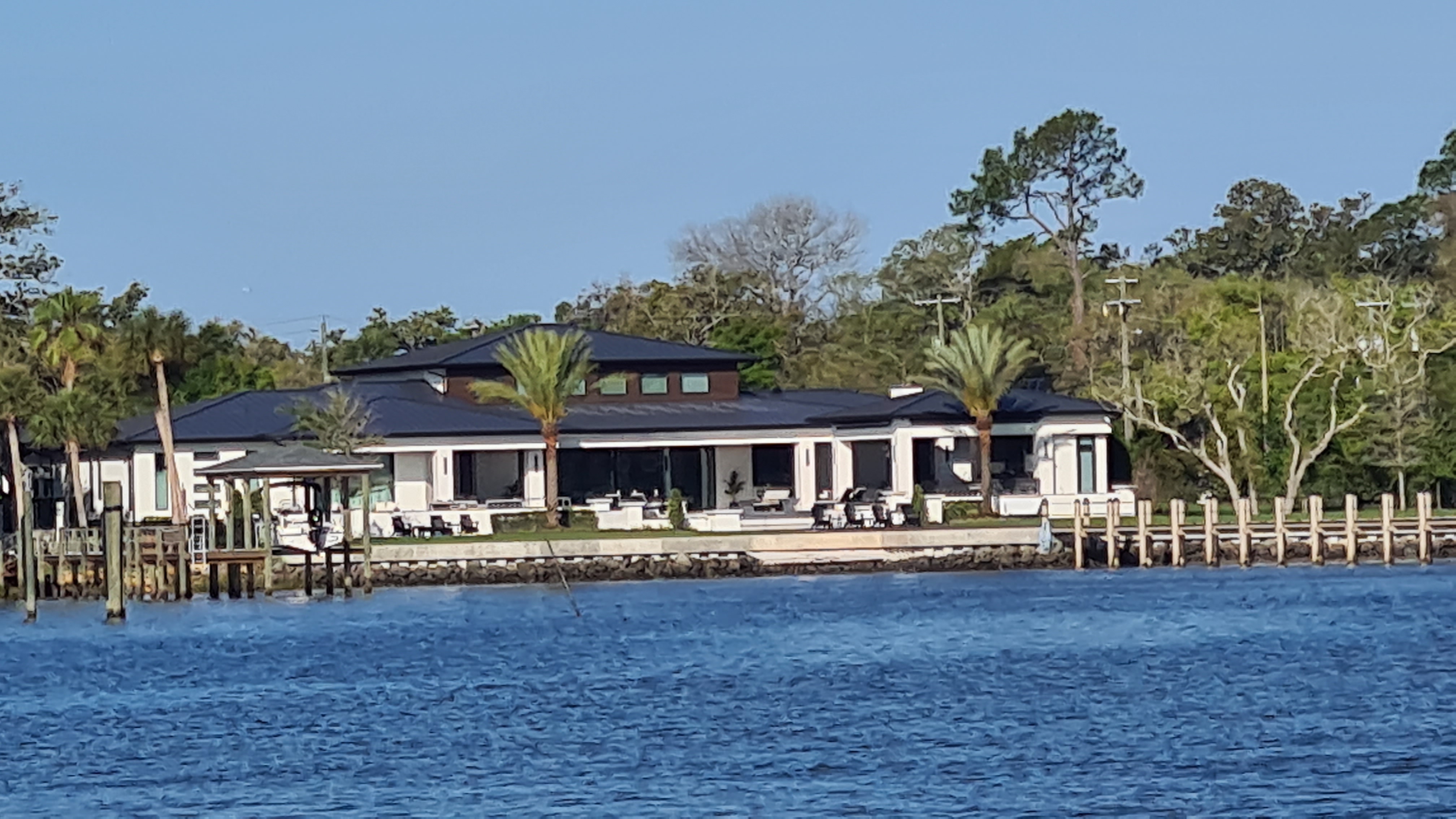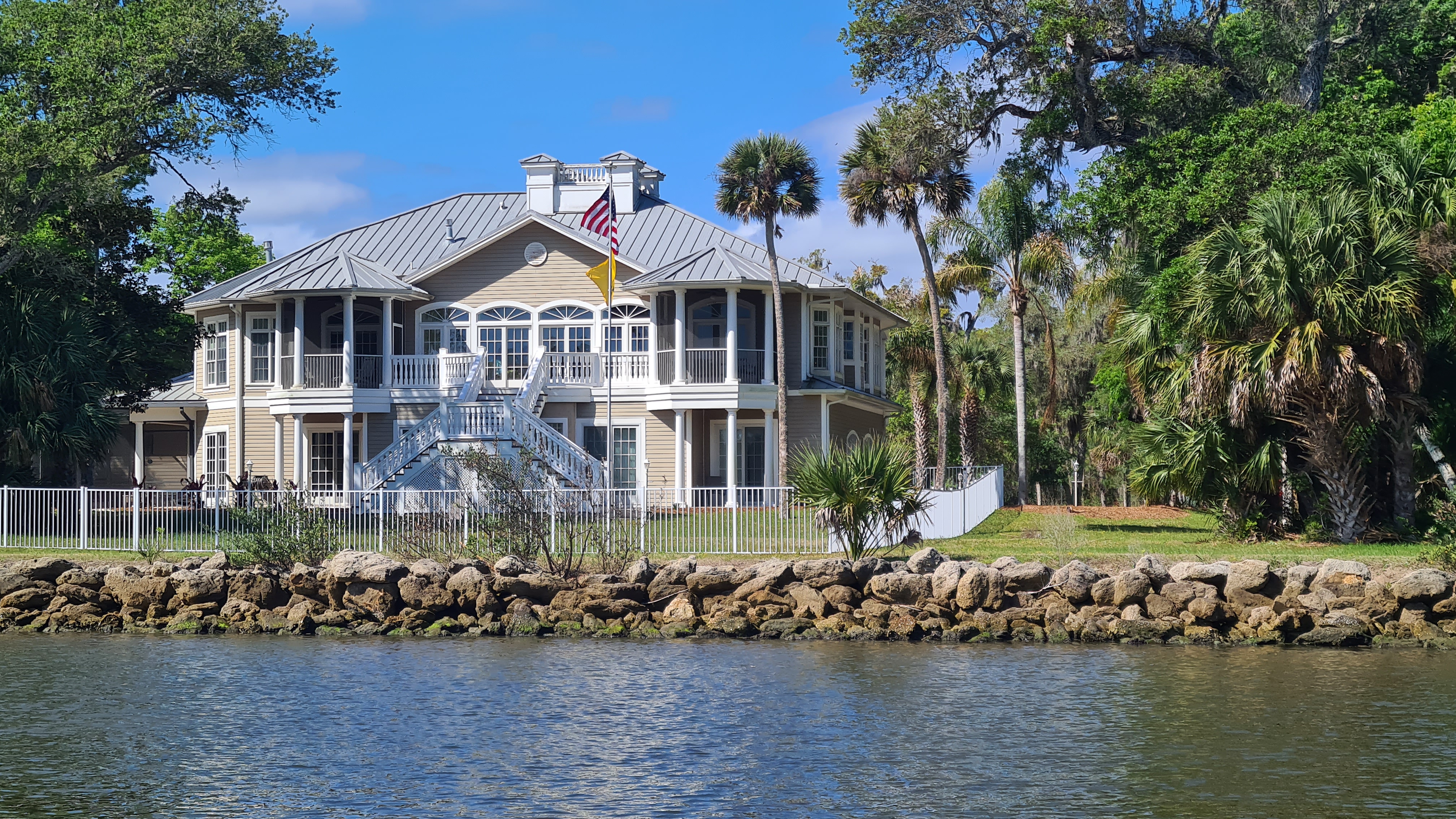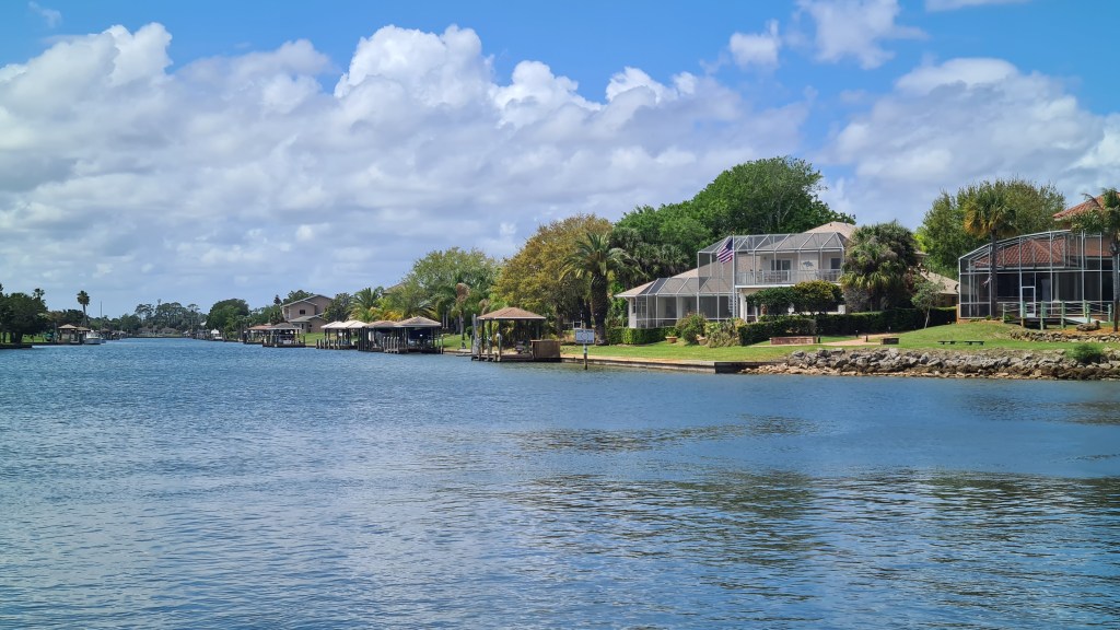Nous traversons des zones urbanisées comme à Daytona Beach ou à Palm Coast, ou des zones plus sauvages comme dans le Mosquito Lagoon. De magnifiques propriétés sont bâties le long de ces vastes plans d’eau. L’architecture est parfois audacieuse, et même un brin ostentatoire. Même les maisons les plus modestes, vues de loin se révèlent très grandes à notre œil européen.