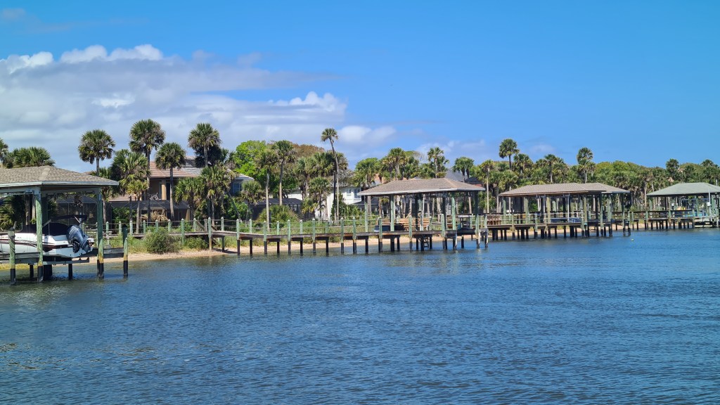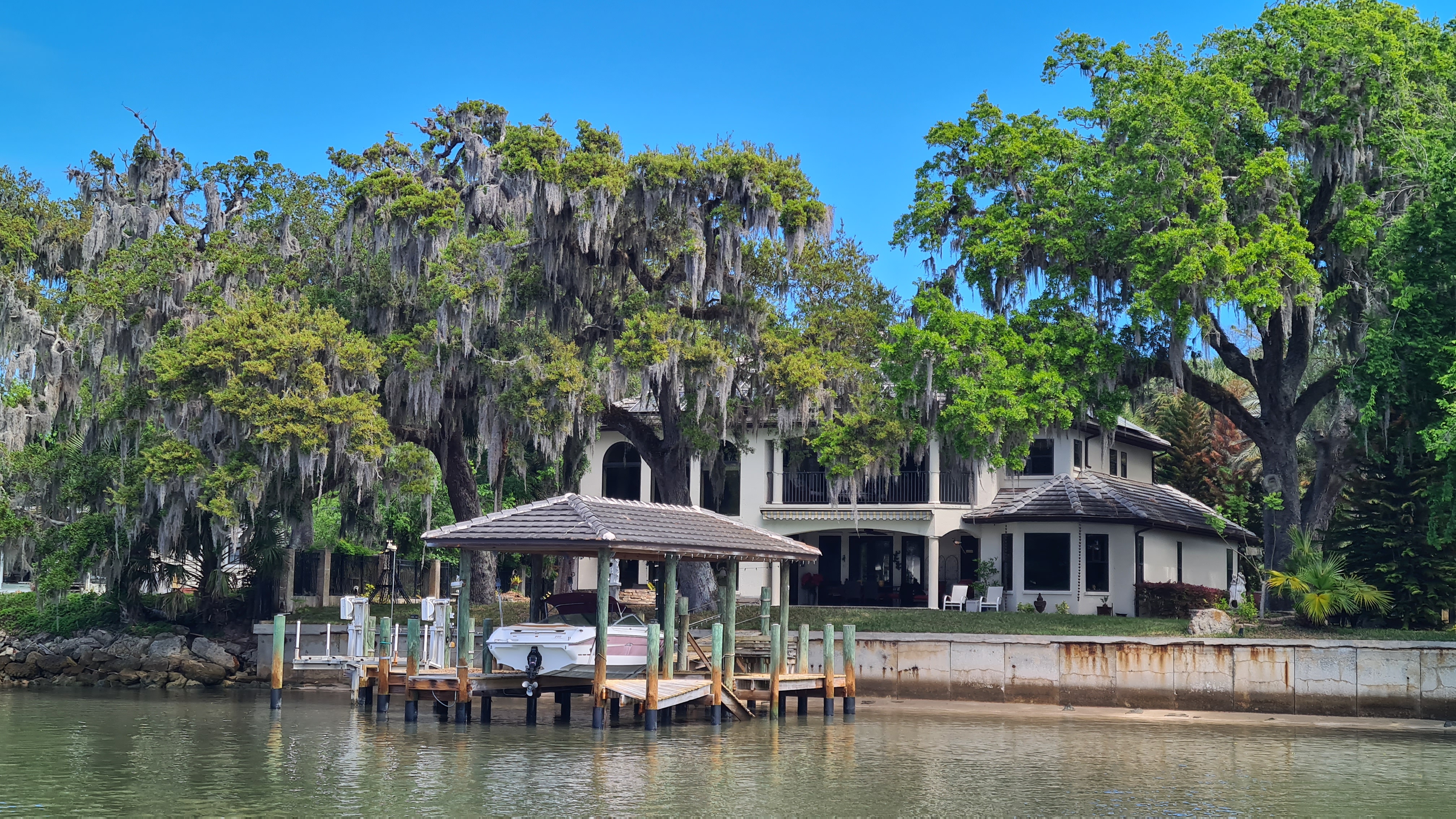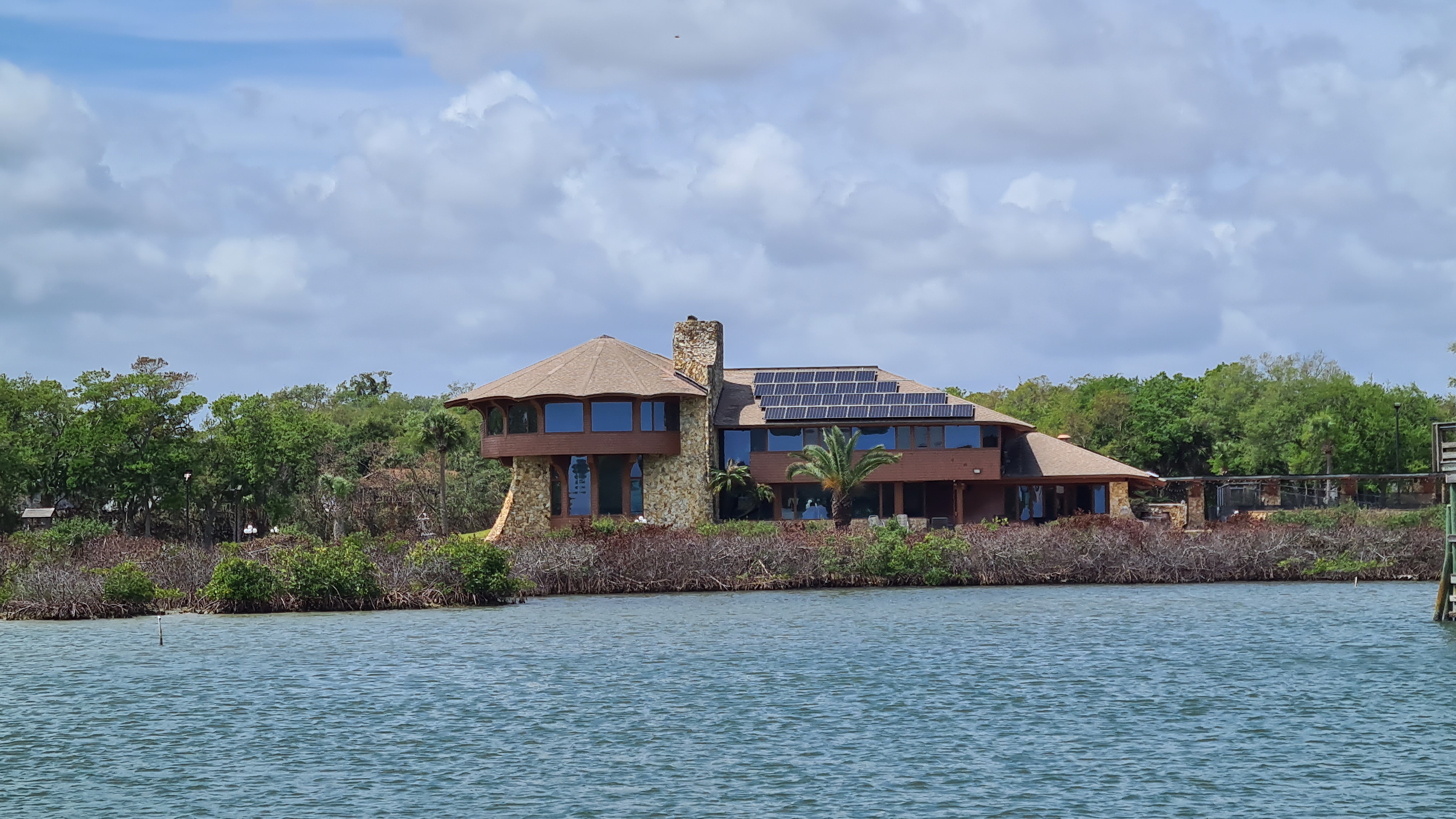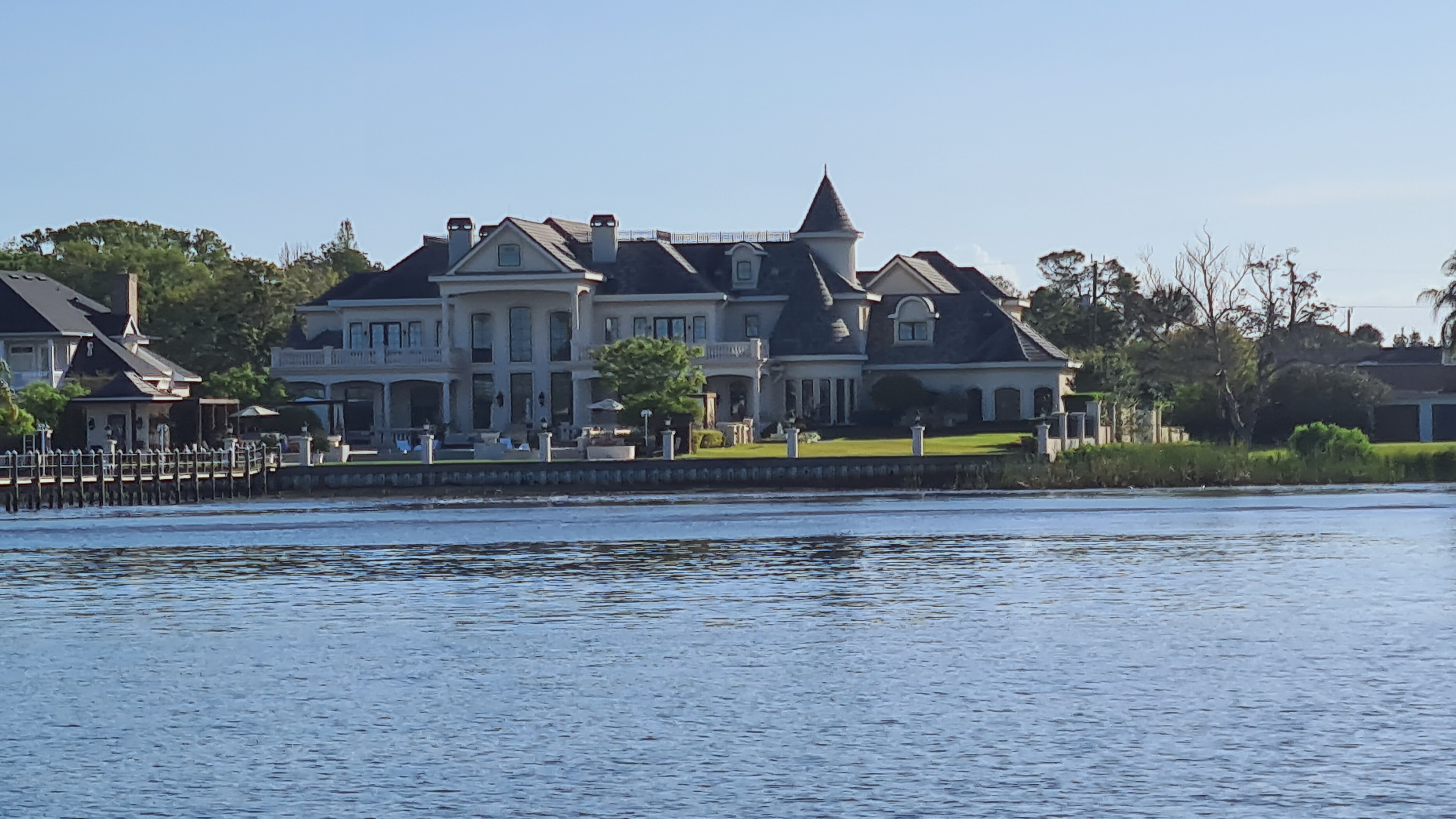Nous traversons des zones urbanisées comme à Daytona Beach ou à Palm Coast, ou des zones plus sauvages comme dans le Mosquito Lagoon. De magnifiques propriétés sont bâties le long de ces vastes plans d’eau. L’architecture est parfois audacieuse, et même un brin ostentatoire. Même les maisons les plus modestes, vues de loin se révèlent très grandes à notre œil européen.