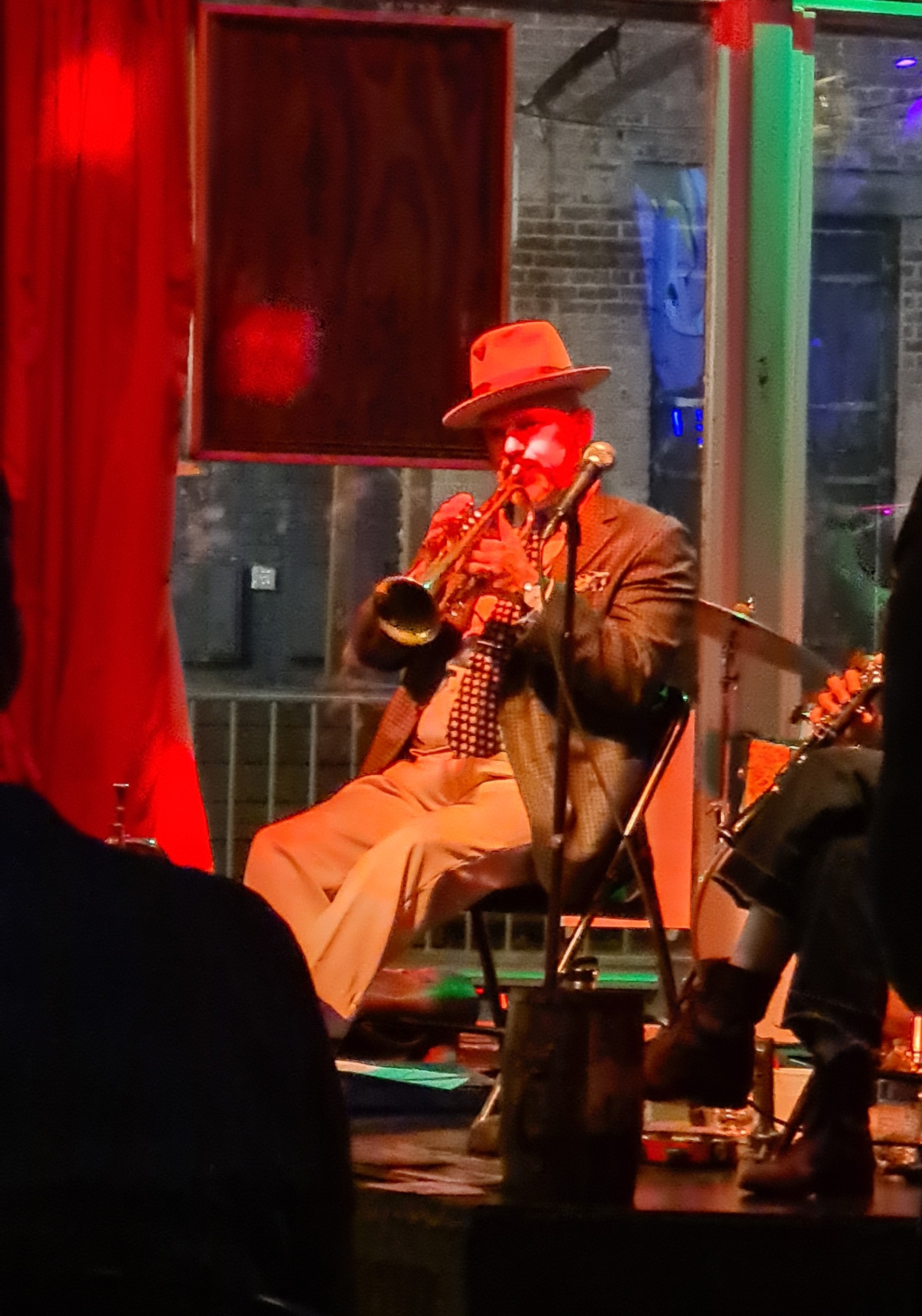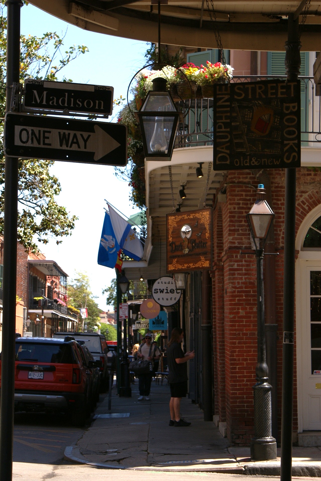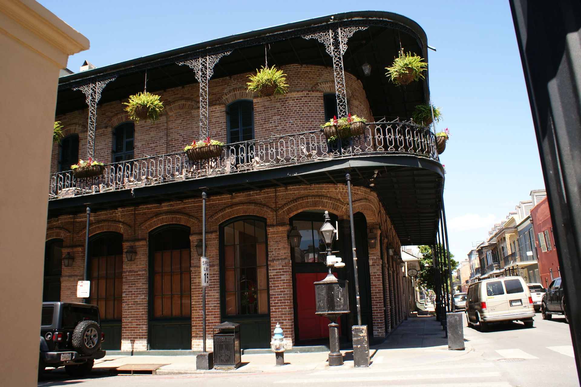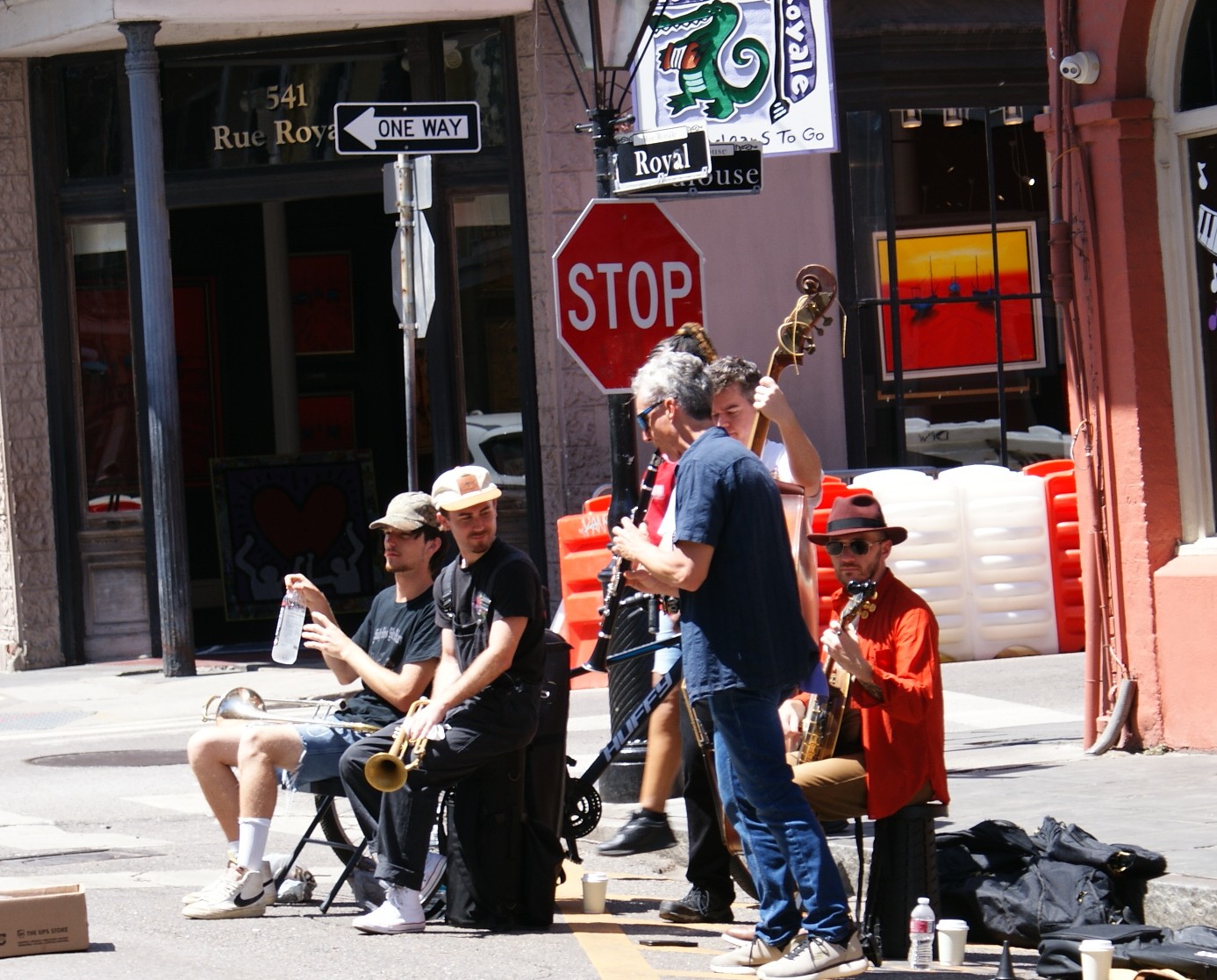 Nous prenons la route le 13 avril, avec une voiture de location et parcourons les 580 miles (930 km) sur les larges Inter State Roads monotones et relativement fréquentées, notamment par d’énormes trucks, qui vous doublent si vous respectez scrupuleusement la limitation de vitesse à 70 Mph. On a vite fait d’accélérer un peu car c’est vraiment flippant de se faire doubler par ces engins ! Nous arrivons à l’Hôtel de la Monnaie vers 19 heures. L’hôtel est situé à la limite du centre historique, le « French Quater » ou le Vieux Carré. Nous ressortons aussitôt nous imprégner de l’ambiance locale. Nous échouons un peu par hasard, car elle jouxte l’hôtel, dans Frenchmen Street, un rue très animée le soir par de multiples bars et restaurants avec orchestres de jazz. Nous entrons dans un restaurant, un peu au hasard, où nous dégustons une délicieuse nourriture cajun et apprécions les airs de jazz d’un groupe de quatre musiciens formidables, la chance du débutant ! Nous aurons l’occasion de vérifier qu’ils ne sont pas tous aussi bon.