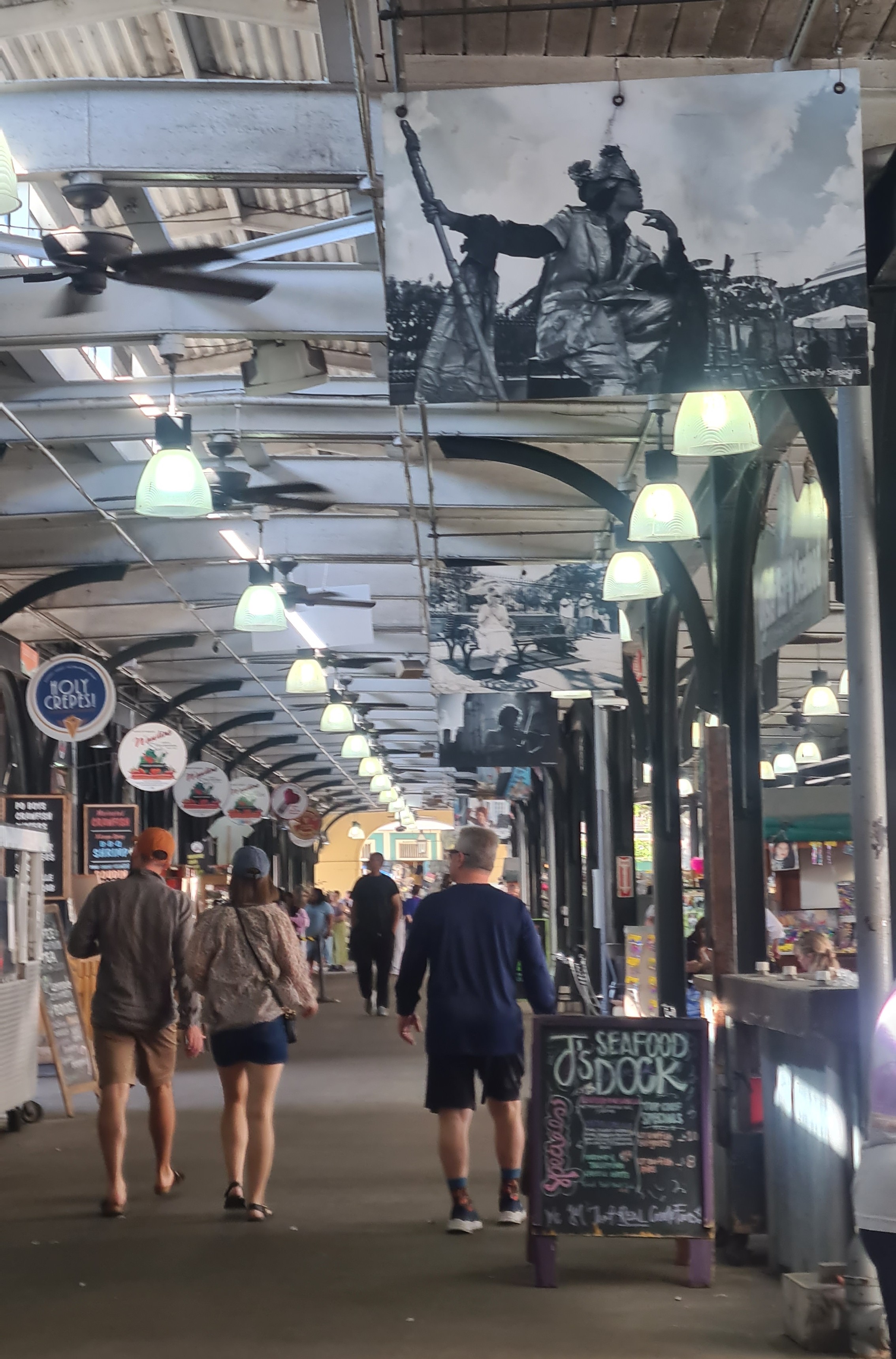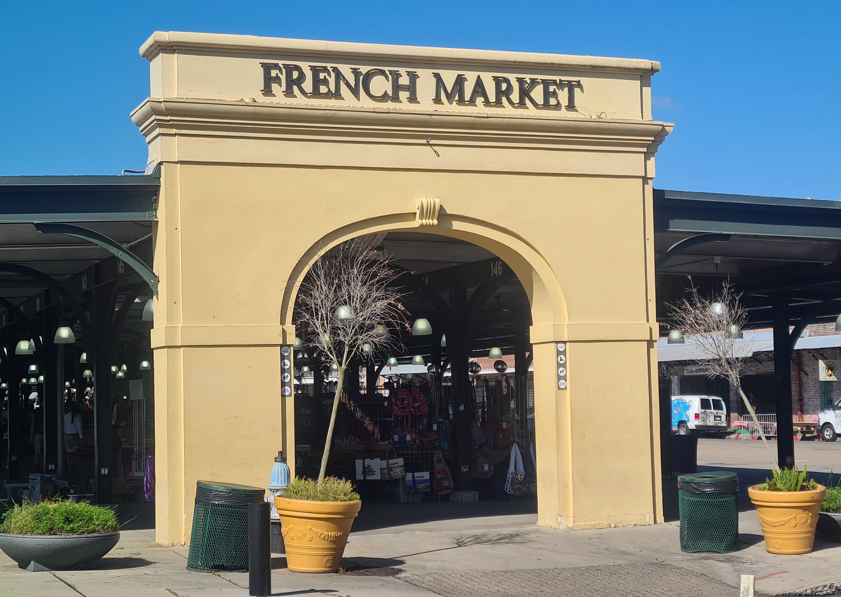 Le lendemain nous partons déambuler dans les rues du Vieux Carré, traversons le French Market, où se faisaient jadis les transactions de tout ce qu’amenait le fleuve Mississippi, formidable voie navigable. La situation de La Nouvelle Orléans en faisait une plaque tournante du commerce de très loin à l’intérieur du pays, vers la mer et les pays étrangers en aval. C’est aujourd’hui un marché touristique et artisanal.